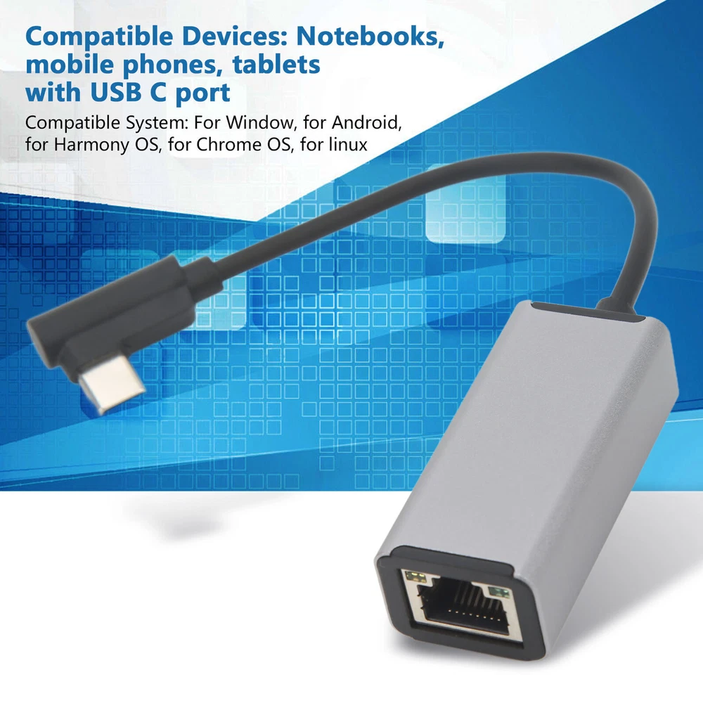 Feature: 1. Wide Compatibility: Suitable for Notebooks, mobile phones, tablets with USB C port. Compatible with for Window, for , for OS, for Chrome OS, for linux. 2. Stable Signal: You can play games and surf the Internet at high speed, directly connect to the network cable, say goodbye to unstable WIFI, and lower network delay. 3. 100Mbps HIgh Speed: Supports automatic adjustment between 10Mbps and 100Mbps, as well as full duplex and half duplex transfer speeds. 4. Good Heat Dissipation: USB C to RJ45 adapter adopts aluminum alloy shell, which has delicate hand feel, good heat dissipation effect and longer service life. 5. Plug and Play: Type C to RJ45 Ethernet converter is simple to use, plug and play, is the best accessory for games, giving you better gaming time. Specification: Item Type: USB C Ethernet Adapter Material: Aluminum Alloy Transmission Speed: 10Mbps to 100Mbps Compatible Devices: Notebooks, mobile phones, tablets with USB C port Compatible System: For Window, for , for OS, for Chrome OS, for linux Package List: 1 x Adapter 1 x Manual