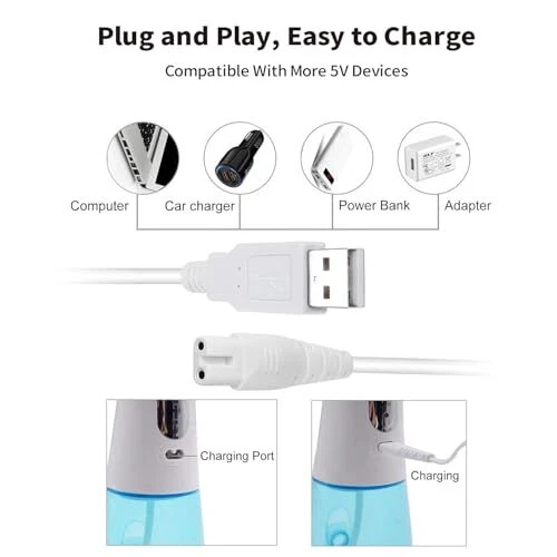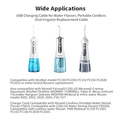 [Wide Compatibility] Specifically designed to be a replacement charger for popular water flosser brands, including Nicwell, Fairywill, Aquasonic, Nicefeel, Oralfree, MOSPRO, Cremax, Tovendor, Hangsun, Insmart, and Zerhunt. Perfect fit for various cordless oral irrigators. Compatbile with Nicefeel model FC159 FC1591 FC152 FC156 FC2630 FC2631 or other brand flossers replacement. [Wide Compatibility] Also compatible with Nicwell Fairywill COSLUS Mornwell Cremax Aquasonic Nicefeel Oralfree INSMART TUREWELL Yafex B. Weiss Zerhunt Tovendor Hangsun Uokmor MOSPRO McNaval & Initio water flosser model 5002, 5012, 5020, 5025, F18, F27; Charger Cord Compatible with Nicwell Cordless Portable Water Dental Flosser Nicwell F5025; Compatible with COSLUS Water Dental Flosser F5020E; Compatible with oralfree water flosser [Durable & Reliable] Made with high-quality materials, this USB charging cable ensures a stable and secure connection, providing consistent power to your water flosser. Built to withstand frequent use and offer long-lasting durability. [Portable & Convenient] With its compact and lightweight design, this charger is perfect for travel or daily use. Simply plug it into any USB port, such as your laptop, power bank, or wall adapter, for quick and easy charging anywhere you go. [Fast Charging] Equipped with fast-charging technology, this cable significantly reduces charging time, ensuring your water flosser is ready to use when you need it. Experience a full charge in less time, making your oral care routine more efficient. [Safe & Secure] Designed with multiple safety features, including over-voltage, over-current, and short-circuit protection, this USB charging cable safeguards your device from potential damage, providing peace of mind during charging.