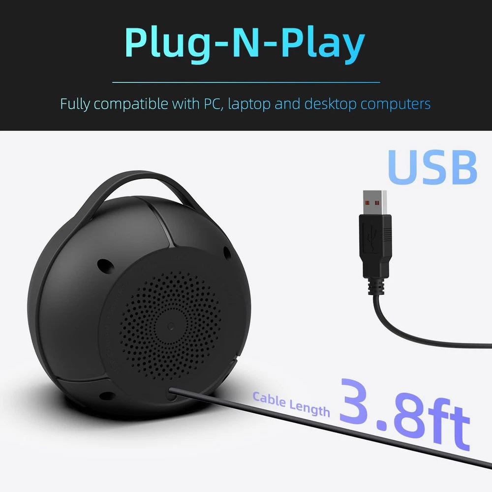 DYNAMIC RGB LIGHT RING: Built-in RGB lights will sync to the beat of the music to create a pulsing colorful light show. ASTONISHING SOUND: Breathtaking ultra-clear sound and deep bass are delivered by a hi-fidelity speaker driver and extra-large sealed cavity. LOUDER SOUND VOLUME: Upgraded to 2.6inch larger super-magnetic driver, increase the sound volume by at least 30% than other USB speakers whose driver size is only 2inch. EASY TOUCH CONTROL: There are 4 touch buttons on the top for you to easily control the RGB light and sound volume. USB PLUG-N-PLAY: NO static noise, NO driver software and NO 3.5mm headphone jack. Just plug in the USB cable, then the speaker will bring you crystal-clear loud sound. FULL COMPATIBILITY: This USB computer speaker is a great external speaker for your Windows/macOS/Chrome OS/Linux laptop, PC and desktop computers.