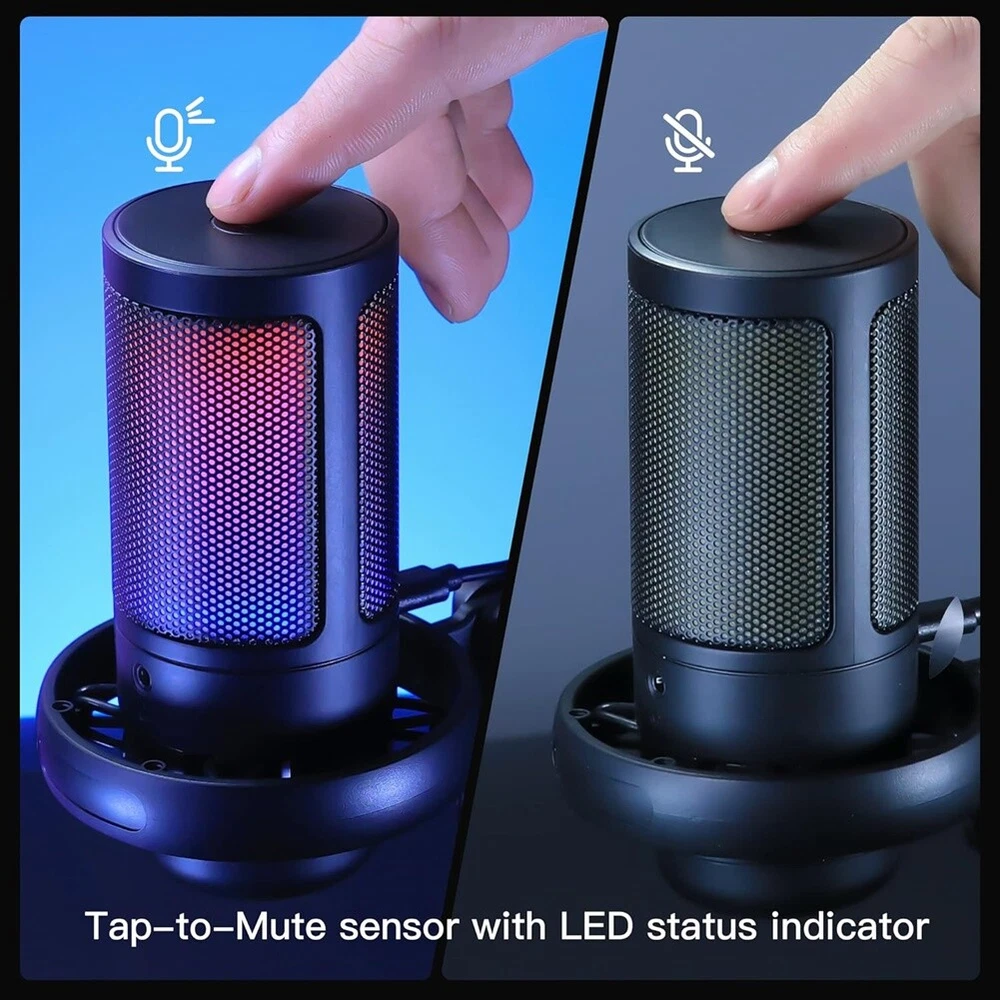 USB Condenser Metal Microphone Professional Recording Streaming with RGB1860 Plug and play USB Microphone that connects to your computer or laptop directly via USB port(work with for and Vista, XP), recording your music or podcast effortlessly. A recording microphone with dedicated gain volume knob itself, for louder output and more sensitive, your voice would be heard crispy and clean when using it in gaming , skyping or voice recording. USB microphone with cardioid pattern for recording, captures your voice clearly and smoothly when the microphone is pointed towards you. The rugged body and robust stand come in handy when you're dubbing or broadcasting for . The microphone can be connected to the 3.5mm headphone jack, allowing you to directly monitor the sound in real time without delay, or listen and record at the same time. -touch mute button on the top allows you to prevent audio accidents, as much as you can control Material: Metal+Plastic colour: Black Package Contents: 1 x Gaming RGB Microphone