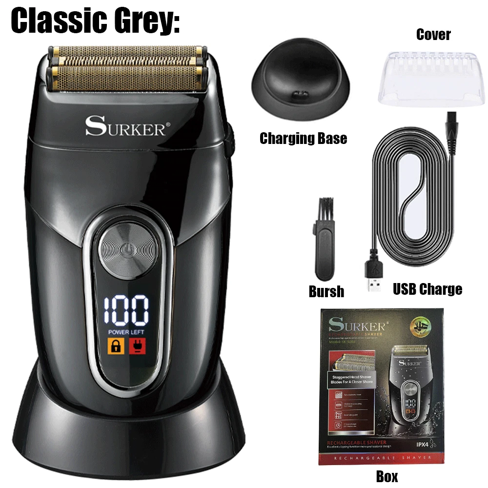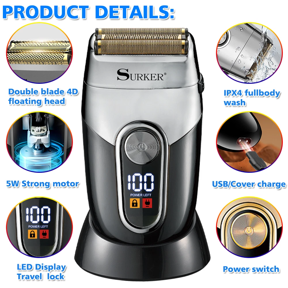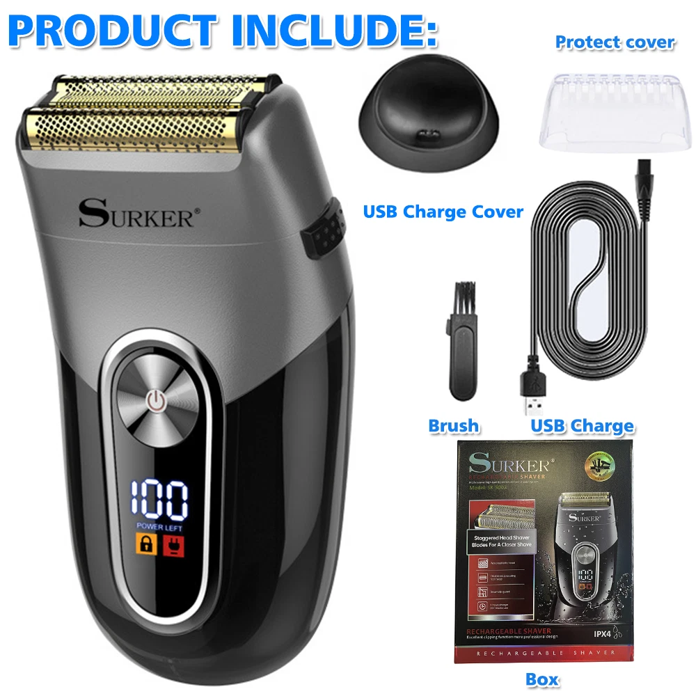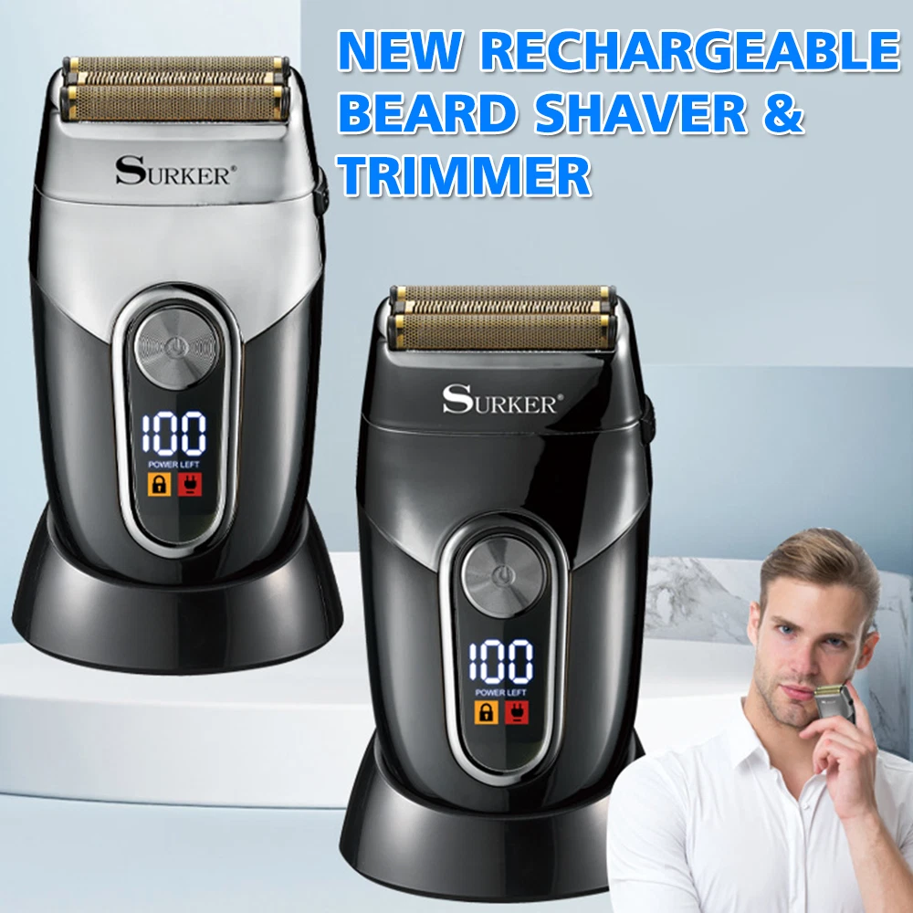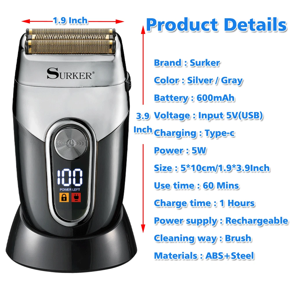 Specifications: Best for hair, beard, stubble, shaved head bump free shaving and super close shaving clean up hair and neck lines for smooth finish cord/cordless shaver shaper a great tool for an extra-close shave on the neck,face and all around the hairline 100-240V voltage,50/60Hz Cord/cordless work powerful and quiet rotary motor gold titanium hypoallergenic foil for irritation-free shaving 2 blade cutting shaving system 600mAh Lithium-ion battery LCD display, charging reminder, battery power percentage reminder contains travel lock function, press and hold the switch for 3 seconds, the machine will be locked, if unlocked, do the same operation USB Line charger model Package Included: 1* T rimmer 1* Protective cover 1* C harger 1* Cleaning brush 1* Manual INSTRUCTIONS FOR USE : 1. Men whose skin is sensitive or easily irritated by shaving, or who suffer from a skin allergy, should test one section on the leg or arm before using the shaver. 2. Remove the protective cover and turn on the unit to start shaving. Hold the shaver at a right angle to the area of your face that you want to shave and run the single shaving foil carefully along your skin. Tip: In general, we recommend that you shave against the direction of hair growth, as this is the best way to trim the hair. Pull your skin tight, with your fingers in inaccessible areas, to achieve optimum results. 3. Do not push the shaver on the skin too hard as it could cause irritation, make the shaver warm and prevent a perfect shave. 4. Please note that it takes 2 to 4 weeks for your skin to adapt to a shaver, so please do not change shaving instruments in this period of time. 5. If hair is longer than 1/32” begin by cutting the hair down first with a trimmer, then use shaver for a smooth close finish.