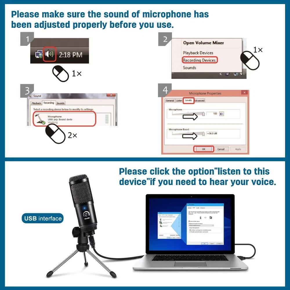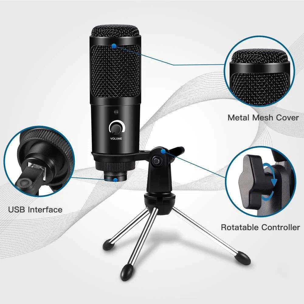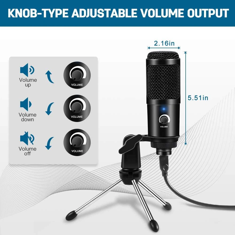 USB Microphone for Recording. Plug 'n Play Cardioid Computer Microphone with Stand. Improve the Sound of Your Audio Projects. Ideal for gaming, singing, meeting, voice recognition software, Skype, and web casting, etc. Plug & Play - Simply plug it into your computer's USB port with the included USB cable, calibrate it with your operating system, and you're ready to record. Use Tips: 1.Please set up manual if your computer can not recognize the microphone. Go to your desktop and right-click the sound icon (the that looks like speakers) and select “Recording Devices” and then the steps by steps.There are also a operation guide in user’s manual. 2.Please try to plug the usb mic on the back of your computer instead of the front usb port Sometimes the usb port with comparatively low power supply can not be boost . Package Lists: 1× USB Condenser Microphone 1× Adjustable Tripod Stand 1× User Manual 【Excellent Sound Quality】: The usb condenser microphone built-in professional sound chipset , 192KHZ/24BIT sampling rate, which lets you capture the clear and smooth sound when you are zoom meeting or gaming. Cardioid pickup pattern that suppresses unwanted background noise and captures the clear sound in front of the microphone.Note: Do not place the USB mic too close to the wall and power supply. 【Plug and Play】:This professional recording USB microphone for computer is rather easy to use(4.6 Feet USB Cable, Long enough for most daily use), simply plug the mic into your computer’s USB port. No drivers required, the ease of use makes this a great option for beginners to start recording or streaming.(★Note: Before use, you can debug to ensure a satisfactory sound. For the debugging method, please refer to Figure 5.) 【Robust Stable Structure Design】:Solid sturdy metal construction design pc microphone with stable tripod stand is convenient when you are doing voice overs or livestreams on . Easy to adjust, You just need to unfold the tripod and attach it to the PC microphone, 270-degree flexible design provides adjustment of any angle or position as you want to fit your needs for your perfect voice.The usb cable, microphone and tripod are detachable, compact and portable. 【Smart volume Knob Design】:mini microphone for pc with additional volume knob itself has a louder output and is more sensitive, your voice would be heard well enough when gaming ,skyping or voice recording. 【Wide Application】:This usb mic for pc can fully with Windows / macOS / Linux / PS4, which can be used for gaming, recording,podcasting, voice over, live streaming, online teaching, and online meeting, Skype, Discord, Yahoo, Recording, Google Voice Search and Steam, meet your all daily needs.
