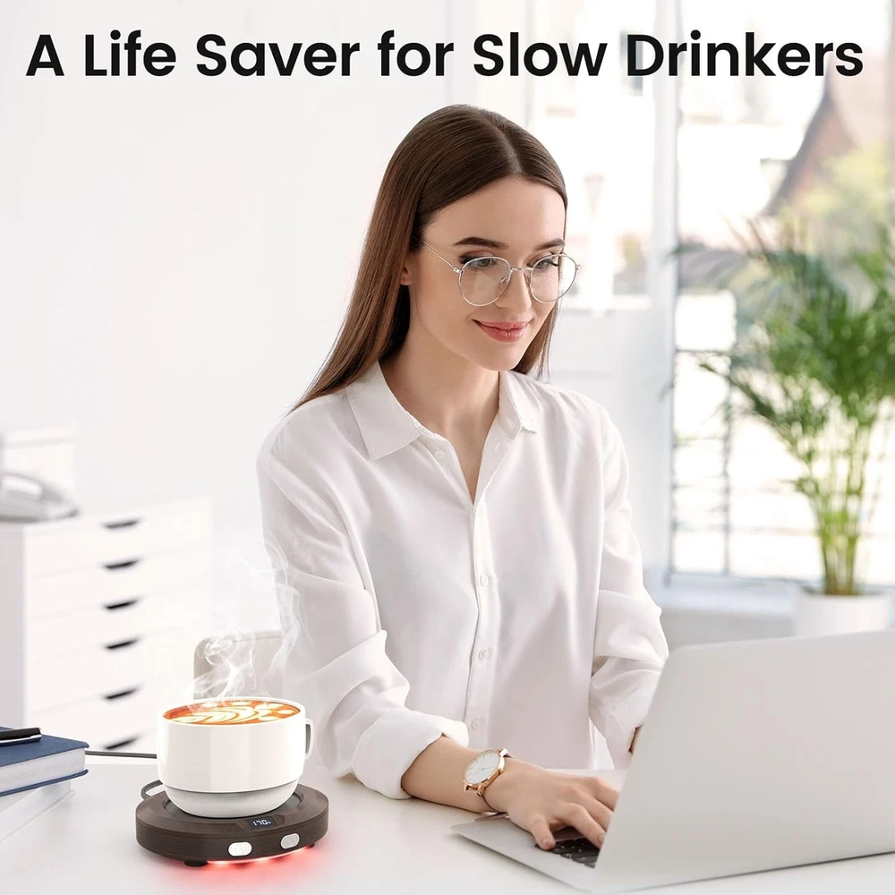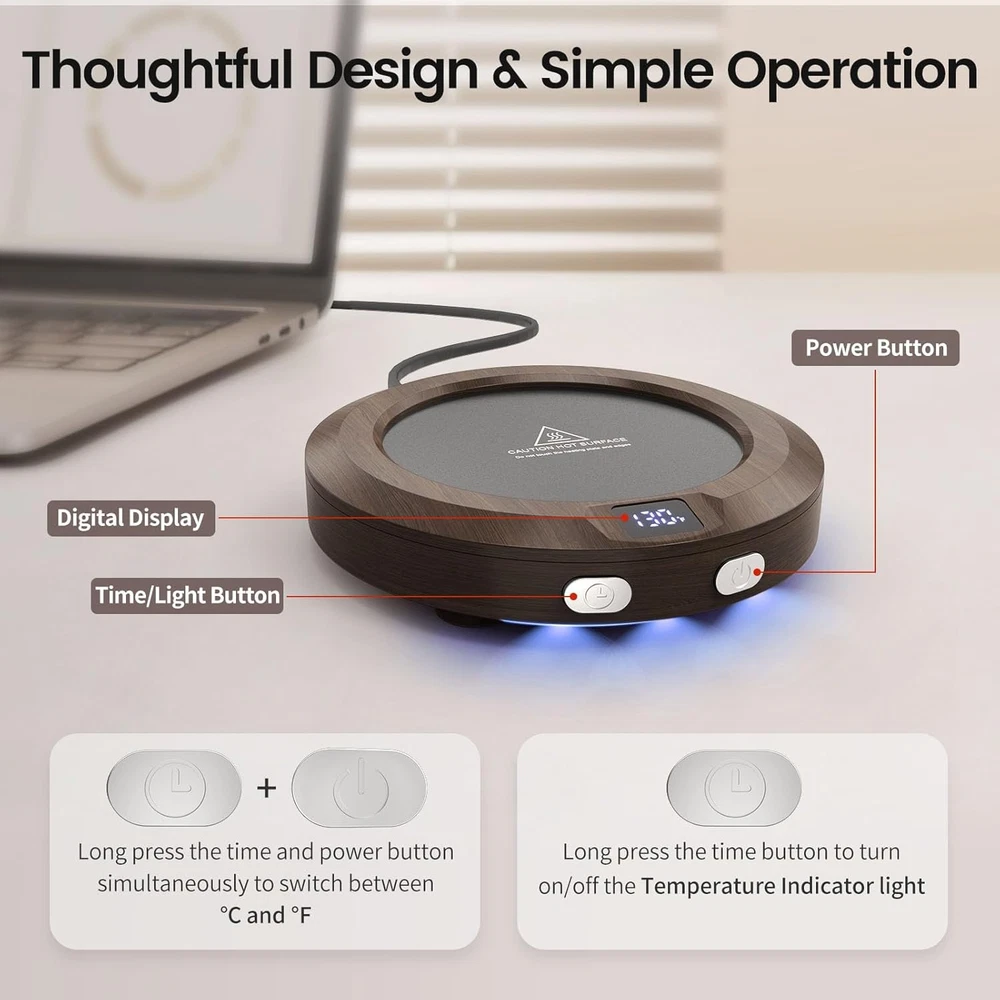 This mug warmer is a game-changer for my desk! It keeps my coffee at the perfect temperature with three heat settings, and the ambient light adds a cozy touch. The timer is super handy, letting me set it for 2-12 hours so my drink stays warm without wasting energy. The sleek wood design fits my workspace perfectly, and it heats up fast without being loud. No more cold coffee breaks—just hot sips all day long. Love it!