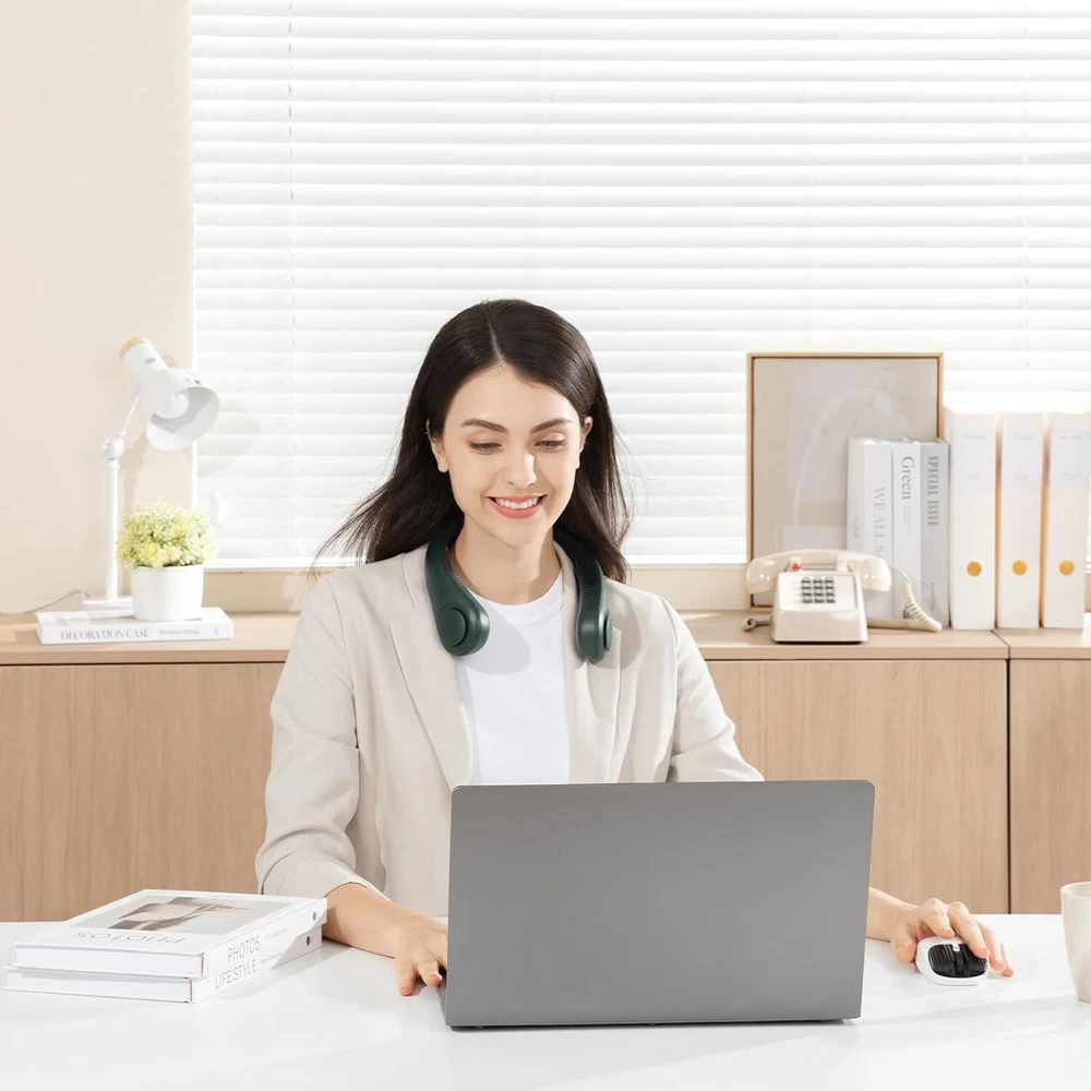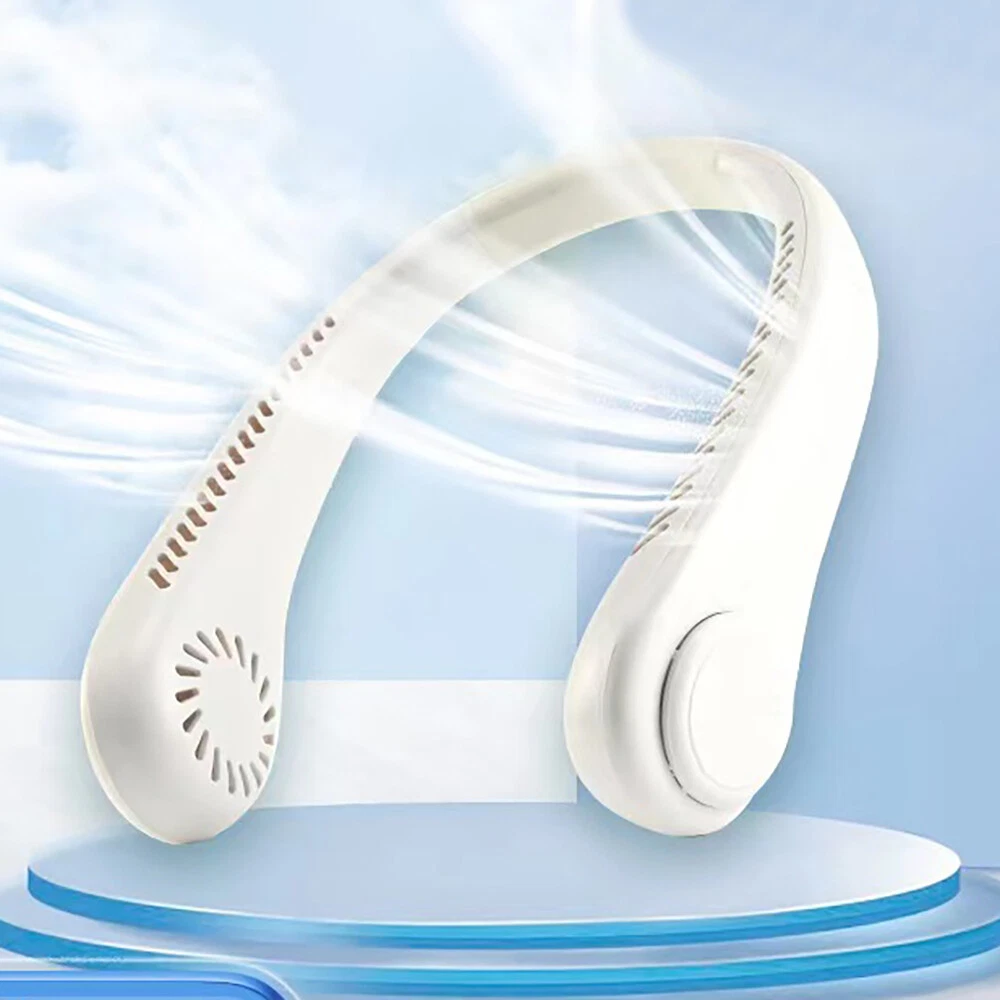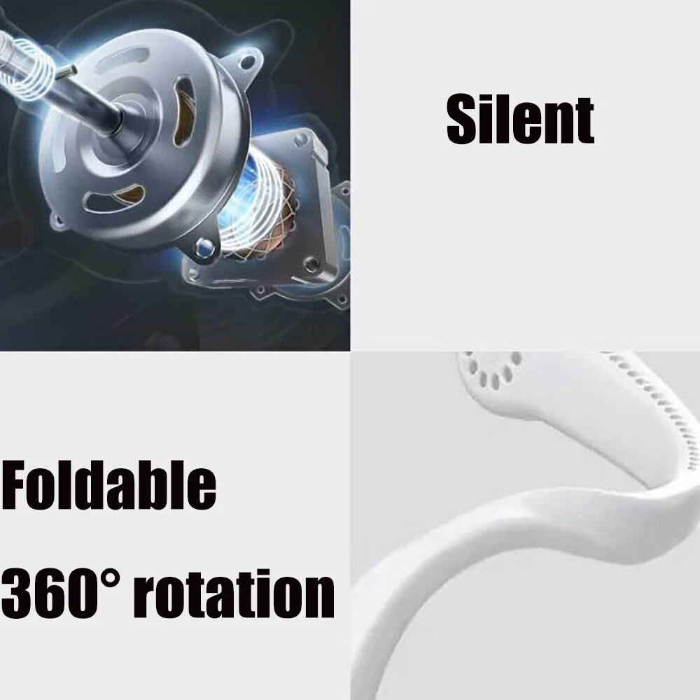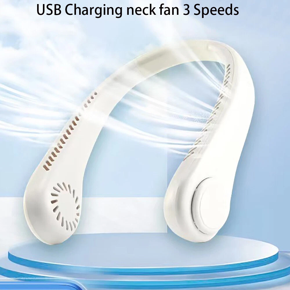 【Safety & 70 Air Outlets】 A novel neck fan that can send the wind without waving your hands by simply placing it on your neck.Designed without wings, it can be used safely by children and the elderly. With 70 air outlets around the neck, it can be used for the entire face around, which products enough air to keep you cool always. It is also nice as a companion for working in hot weather. 【Hands-free Design & Fashionable】Hand-free neck fan was designed as a headphone to free your hands anywhere; The fashion style makes you look cool and you can take it anywhere in hot weather. Good choice to as a gift for your family. 【3 Speeds】1000mAh large capacity batteries provide 20Mins-2hours working time (depending on different speeds). Adjust appropriate speed by pressing the power button repeatedly. 【Low Noise Design & Comfortable】The wearable neck fan’s motor has been modified so that noises of at least 25 dB can be generated while running. It is quite enough to hear your own breath. Made of Eco-friendly ABS and silicone. Makes the hands free neckband fan softer and more durable and quieter. 【Compact Design】Personal neck fans weigh about 9.4OZ and are ultra-light, putting less strain on the neck.When using the fan, you don't have to worry about your hair getting caught on the fan blades. Included: 1x neck fan 1x USB charge cable