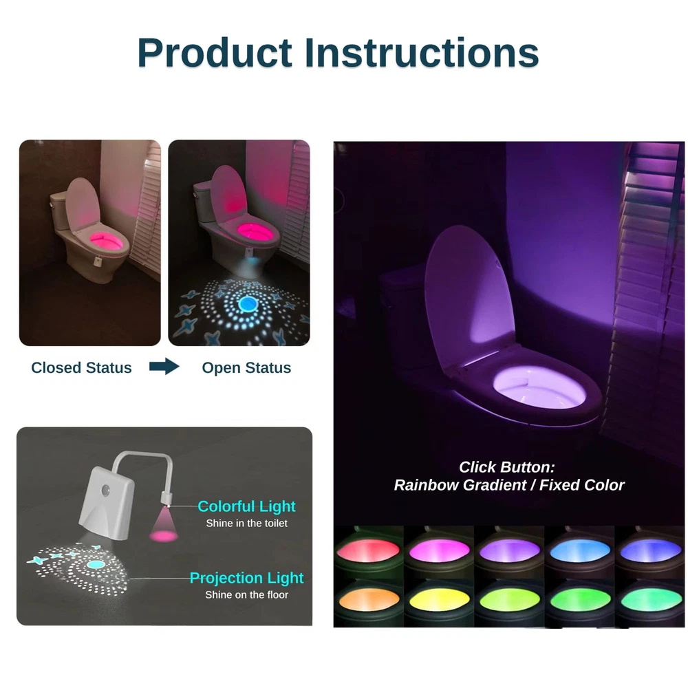 【Design】Toilet lights upgraded RGB 16 Colors changing LED and adds the starry sky projection function at the bottom, will show you a beautiful starry sky world on the floor, not only makes the toilet more colorful and more funny, but it can also stimulate children's desire to explore and imagine, and can prevent the elderly and children from being tripped in the darkness. 【Charge】The toilet light motion sensor has a built in 500 mAh rechargeable battery that can be charged using the included Type-C charging cable, eliminate the trouble of changing batteries frequently. It can be used for up to 2 months after being fully charged, which can maximize the battery life. Say goodbye to stumbling in the dark or disturbing your sleeping partner by turning on the bathroom light. 【Sensor】The toilet bowl light with high quality light sensor and motion sensor. When you are within 13 feet, the light will automatically light up are on and keep it for up to 90 seconds of lighting, and then automatically turn off. Light sensing allows it to work only in the dark. So, when you go to the bathroom in the middle of the night, you don't need to turn on the light. 【Use】The power button has 2 functions.Short press can colorful light gradient/fixed color. Long press can turn off the power.Our illuminated toilet light is suitable for all sizes of toilets. Its flexible arm can be easily adjusted and secured to the side of the bowl, resting securely on the rim beneath the seat. Plus, it's IP68 Waterproof,making it easier to clean, splash proof, and our toilet light can be cleaned with most household cleaners. 【Gift Choice】This toilet night light is a terrific present idea that will make your children's and friends impressed. At the same time, it is an excellent method to give as a present for any occasion, including Christmas and birthdays.