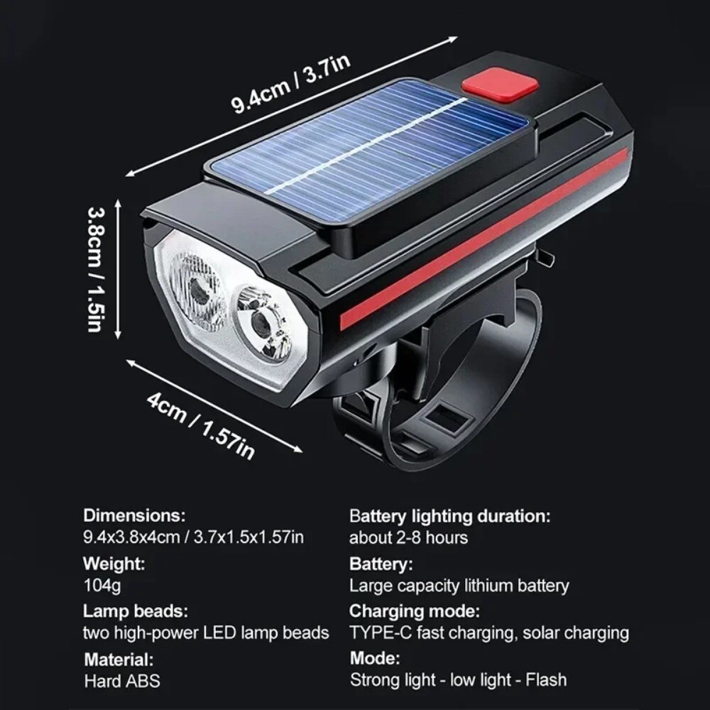 Solar Power Bike Headlamp with Horn USB Charging LED Bicycle Light 250LM Waterproof Bike Flashlight Bicycle Accessories Features: 1.Dual-Beam Illumination: Equipped with both high-beam and wide-angle lights, this bike headlight ensures long-distance visibility and a broad field of illumination for safer riding in all conditions. 2.Hybrid Charging Options: Featuring Type-C USB and solar charging capabilities, this bicycle headlamp offers versatile and convenient recharging options, ensuring you're never left in the dark. 3.Strap-On Installation: The LED bicycle light's band-style fitting system allows for quick and easy mounting, making it user-friendly for cyclists of all skill levels to attach and remove as needed. 4.Light & Horn Combo: This MTB road bike front lamp and horn setup saves handlebar space and reduces the overall weight on your bicycle, streamlining your ride and keeping essential functions within easy reach. 5.Weatherproof Durability: With its excellent sealing properties, this bike handlebar flashlight stands up to rainy conditions, giving you the confidence to ride in wet weather without compromising your light's performance. Specification: Origin: Mainland China Body Material: ABS Color: Black, Red, Blue Body Size (Excluding Base) : Approx. 94mm (3.70in)*40mm (1.57in)*38mm (1.50in) Net Weight: About 83g Lamp Bead: 2*LED Headlight Gear: High-Light - Low-Light - Flashing Lamp Brightness: 250LM Speaker Decibel: 120bd Battery Capacity: 1200mAh (Delivery Includes Battery) Charging Mode: Type-C USB Charging Note: Due to the different monitor and light effect, the actual color of the item might be slightly different from the color showed on the pictures. Thank you! Please allow 1-2cm measuring deviation due to manual measurement.