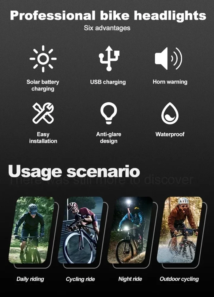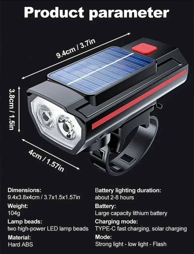 Solar Power Bike Headlamp with Horn USB Charging LED Bicycle Light 250LM Waterproof Bike Flashlight Bicycle Accessories Features: 1.Dual-Beam Illumination: Equipped with both high-beam and wide-angle lights, this bike headlight ensures long-distance visibility and a broad field of illumination for safer riding in all conditions. 2.Hybrid Charging Options: Featuring Type-C USB and solar charging capabilities, this bicycle headlamp offers versatile and convenient recharging options, ensuring you're never left in the dark. 3.Strap-On Installation: The LED bicycle light's band-style fitting system allows for quick and easy mounting, making it user-friendly for cyclists of all skill levels to attach and remove as needed. 4.Light & Horn Combo: This MTB road bike front lamp and horn setup saves handlebar space and reduces the overall weight on your bicycle, streamlining your ride and keeping essential functions within easy reach. 5.Weatherproof Durability: With its excellent sealing properties, this bike handlebar flashlight stands up to rainy conditions, giving you the confidence to ride in wet weather without compromising your light's performance. Specification: Origin: Mainland China Body Material: ABS Color: Black, Red, Blue Body Size (Excluding Base) : Approx. 94mm (3.70in)*40mm (1.57in)*38mm (1.50in) Net Weight: About 83g Lamp Bead: 2*LED Headlight Gear: High-Light - Low-Light - Flashing Lamp Brightness: 250LM Speaker Decibel: 120bd Battery Capacity: 1200mAh (Delivery Includes Battery) Charging Mode: Type-C USB Charging Note: Due to the different monitor and light effect, the actual color of the item might be slightly different from the color showed on the pictures. Thank you! Please allow 1-2cm measuring deviation due to manual measurement.