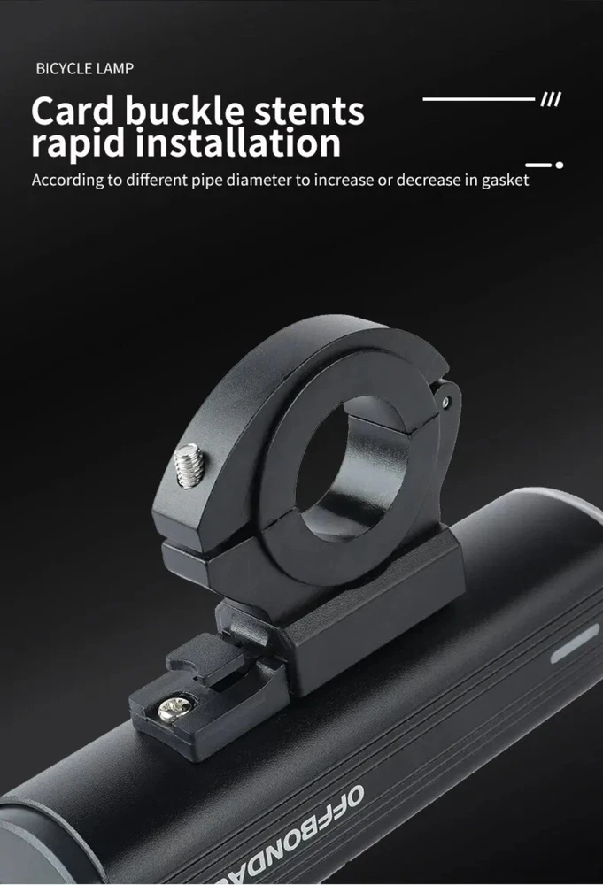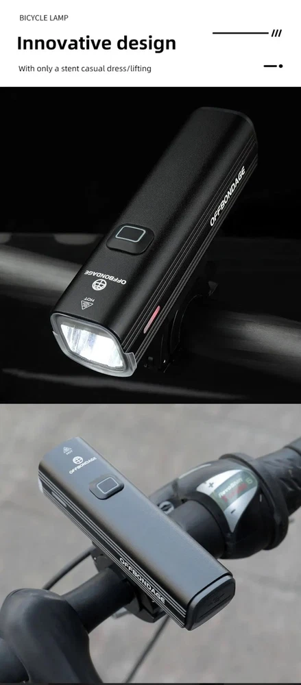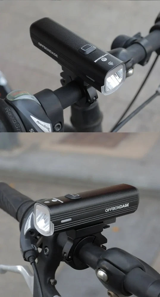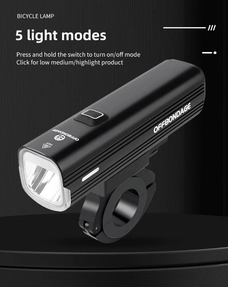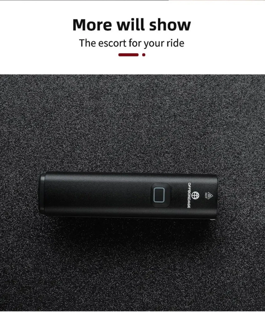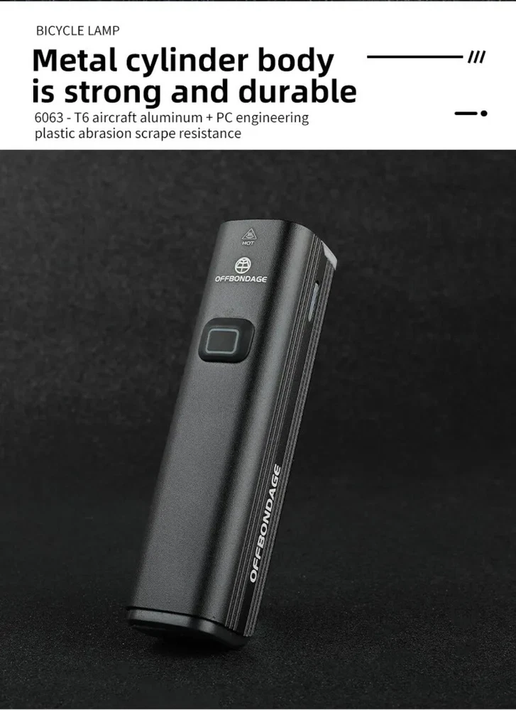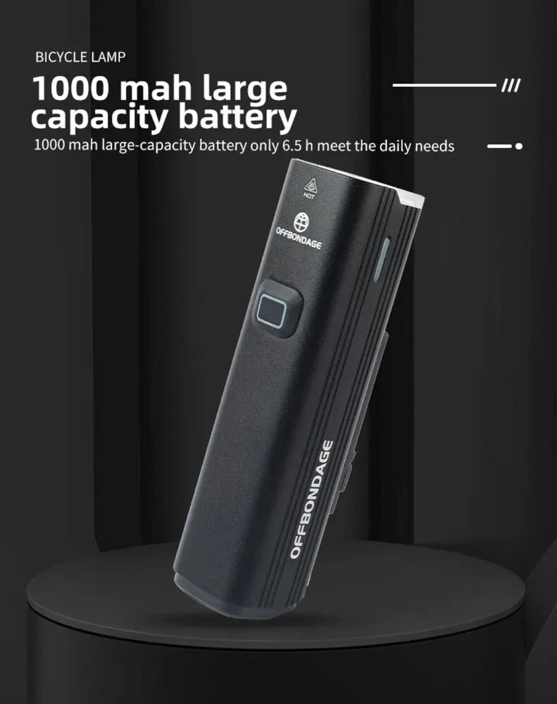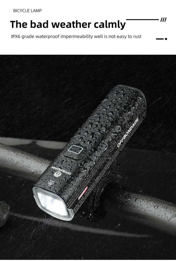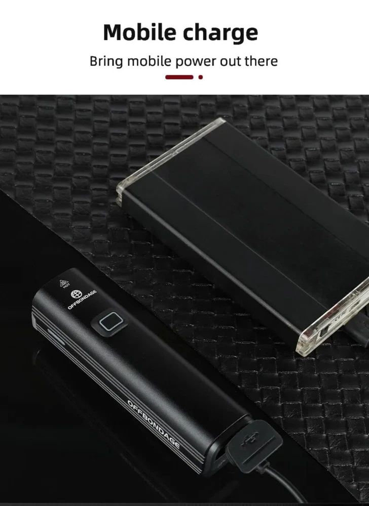 • 1000Lumen Brightness : The OFFBONDAGE Bicycle Light emits a powerful 1000Lumen beam, making it perfect for night rides and ensuring maximum visibility. • USB Charging : With its handlebar USB charging port, this bike light can be easily charged on the go, eliminating the need for complicated wiring or batteries. • Highlight and Power Bank Functionality : This product not only serves as a bike light but also doubles as a power bank, making it a versatile and practical accessory for any cyclist. • CE Certification : The OFFBONDAGE Bicycle Light is certified by CE, ensuring that it meets the highest safety standards and is safe to use while cycling. Product detail Fire: OFF BONDAGE Model: HR3-1000 Material: Aluminum Alloy Mode: 5 Modes Super Bright\\\ / High\\\ / Middle / Low\\ / Flash Waterproof: Daily Waterproof Lumen: About 1000Lumen Range: About 200M Battery: About 4500 mAh Charging Time: About 3-5 hrs Light Shows NOTE About Charging: 1.Please use the charging cable included in the package to charge, otherwise it may cause damage to the lights. 2.It can be used as a power bank ,but you need to prepare a conversion connector yourself