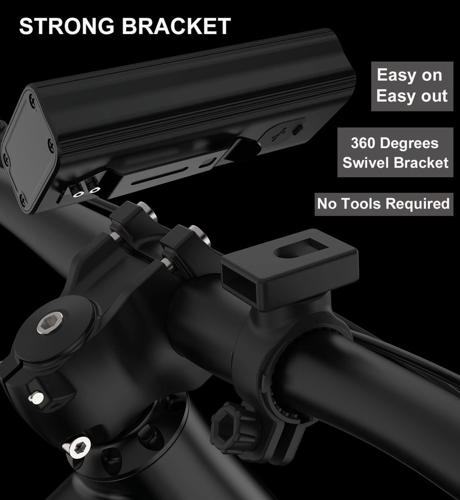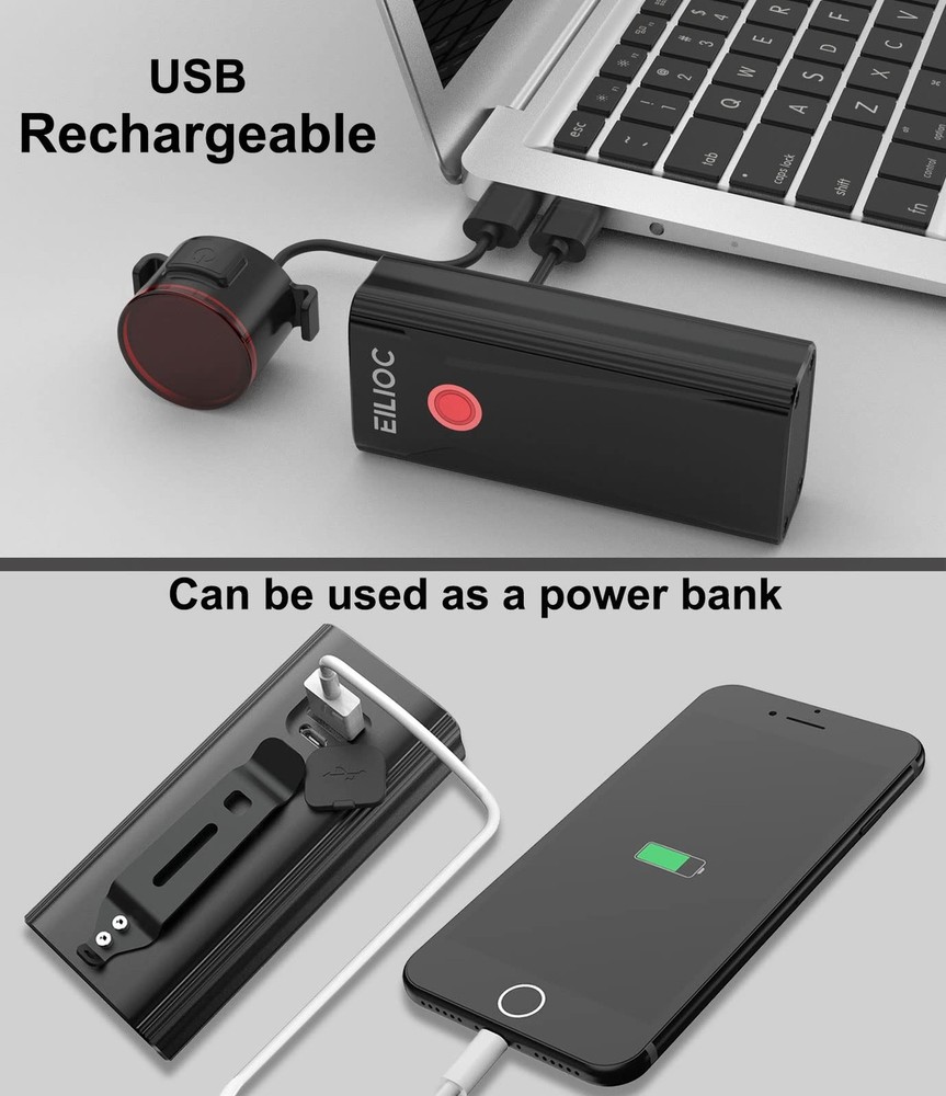 Bike Lights for Night Riding,6400 mAh Bicycle Light Front and Rear USB Rechargeable Bike Headlight and Tail Light Set,Super Bright 1200 Lumen Led Safety Light Accessories for Road and MTB Product Details Color: black Brand: EILIOC Material: Aluminum Power Source: Battery Powered Water Resistance Level: Water Resistant Item Weight: 0.2 Kilograms Mounting Type: Handlebar Mount Number of settings: 5 Brightness: 1200 Lumen Auto Part Position: Front Color: black Brand: EILIOC Material: Aluminum Power Source: Battery Powered Water Resistance Level: Water Resistant Item Weight: 0.2 Kilograms Mounting Type: Handlebar Mount Number of settings: 5 Brightness: 1200 Lumen Auto Part Position: Front International Protection Rating: IPX5 Manufacturer: iligo UPC: 708311538907 Item Package Dimensions L x W x H: 5.47 x 4.13 x 1.89 inches Package Weight: 0.28 Kilograms Item Dimensions LxWxH: 3.9 x 1.78 x 0.98 inches Brand Name: EILIOC Part Number: eilioc Date First Available: November 25, 2019 SUPER BRIGHT BIKE LIGHT SET-1200 LUMEN headlight shines a powerful beam far and wide 180over roads and trails making it easy to see and be seen! The wide beam make it visible from the sides also,cars can see you if they approach from your side at an intersection.Free Tail light included.The bike light set make your bicycle 360ovisibility,keep in safety all the time.GET IT NOW! BUILT IN HIGH CAPACITY BATTERY- The headlight built in high capacity 6400 mAh long lasting battery,can work 5 hours in high mode,7 hours in Middle mode,and 12 hours in low mode.Long runtime ensures that you reach your destination safely on dark nights,avoiding the battery run out and effect your safety and travel.Both USB Rechargeable Bike light front and back can charge from mobile phone charger,computer,power bank or any device with a USB port,never waste your money on the batteries again. EASY INSTALLATION AND 360RATATION SWIVEL STRONG MOUNT-Clip design,just slide on or remove the lights in seconds without tools.When you lock up your bike outside,You can easily remove it for charging and theft prevention.Rotate the USB Rechargeable bike light to shine any direction you want. The holder is steady and clamped to handlebar firmly.The light clicked to the base firmly.You put it on and don't need to worry about falling down. WATERPROOF AND USB POWER OUTPUT-Water resistant rated to IPX5 - Protected against small rain, Splash water,light up your road in all conditions of weather!The lamp power supply can be used as a power source.If your mobile phone has no power during the riding,you can use it emergency charging the phone.