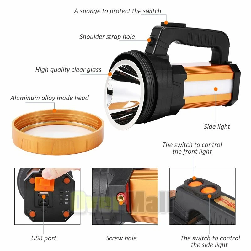 Lamparas De Mano Recargables Usb Linternas Led Alta Potencia 9000000 High Lumens Super-bright 900000lm Flashlight LED Tactical Torch Rechargeable with Side Light BEST CUSTOMER SERVICE ON OUR sale2015express EBAY STORE↓ ↓ ↓ 〓SHIP From US Local Stock 〓FAST & Free, 1-6 Days Arrival 〓FREE Return, Seller Pay!! 〓LIFETIME Money Back Guarantee 〓LIFETIME Free Replacement Guarantee 〓LIFETIME Warranty 〓QUICKLY Reply within 24 Working Hours 〓 MOST orders ship within 1 business day with Tracking Number 〓 ANY PROBLEM please email us before feedback, thanks! Add our listing to Watchlist Or Add to Cart , you will get more discount!!! Feature: -Small flashlight, light and convenient. -High quality, wear-resistant and drop-resistant. -Smart battery display: check real-time battery display at any time: 25%-50%-75%-100% four-stage display. -Long battery life: large-capacity battery provides sufficient brightness for strong lighting. -Life waterproof: can deal with all kinds of rainstorms and live waterproof, the charging port is waterproof, accidentally falling water can protect the battery from water -UBS fast charging, compatible with multi-charge charging equipment, can also be used as an emergency power bank. -Suitable for work emergency, home lighting, reading, continuous lighting for camping. Specification: Material: ABS engineering plastic Flashlight size: 105*130*195mm/4.13*5.12*7.68inch Color: orange Power source: charging Lighting mode: strong light-weak light flashing-side light Power: 10W Light source form: LED Power generation method: charging 360 degree rotation: No Configure charger: yes Maximum range: more than 500 meters Applicable environment: hiking, camping, self-defense, teaching, searching, hunting, daily carrying, night riding, caving, night fishing, patrol Package including: 1 x Flashlight 1 x USB charging cable 1 x Shoulder Strap Payment Shipping About Feedback About us Contact us Payment 1. Paypal Accept. 2. Payment should be sent within 4 (FOUR) days auction closing. Or unpaid dispute will be filed for closing auction. Shipping 1. Fast shipping from NJ, US. 2. Shipping available time: Mon. - Fri. exclude holidays 3. The orders will be handled in 24 hours after payment got. Ship to Paypal Address ONLY. About Feedback If you are dissatisfied for any reason, please do not be quick to leave negative/neutral feedback. We work hard to make sure EVERY CUSTOMER 100% SATISFIED and resolve any problem for you and always leave positive feedback to all our customers. About us 1. Welcome to OverMall, We pride ourselves on providing the outstanding service and high qualtiy products, make our customer feel confident buying online. 2. For the most US address, we offer free standard shipping . 3. By shopping with us, you can guarantee the latest technology for the best possible price. Contact us You are welcomed to contact me for any question. I will reply your email in about 24HRS in business days.
