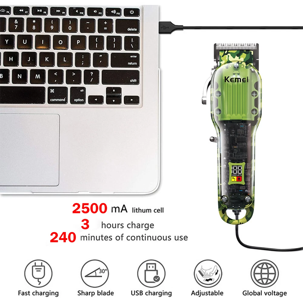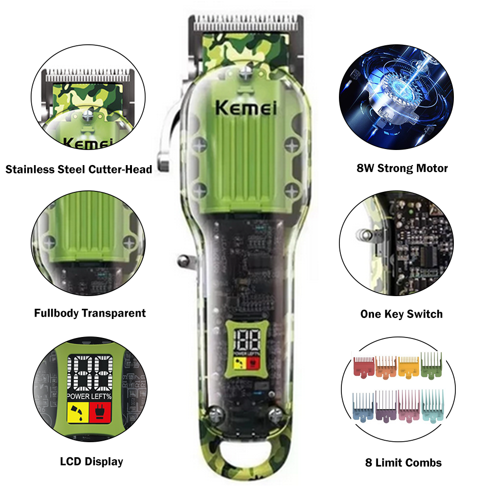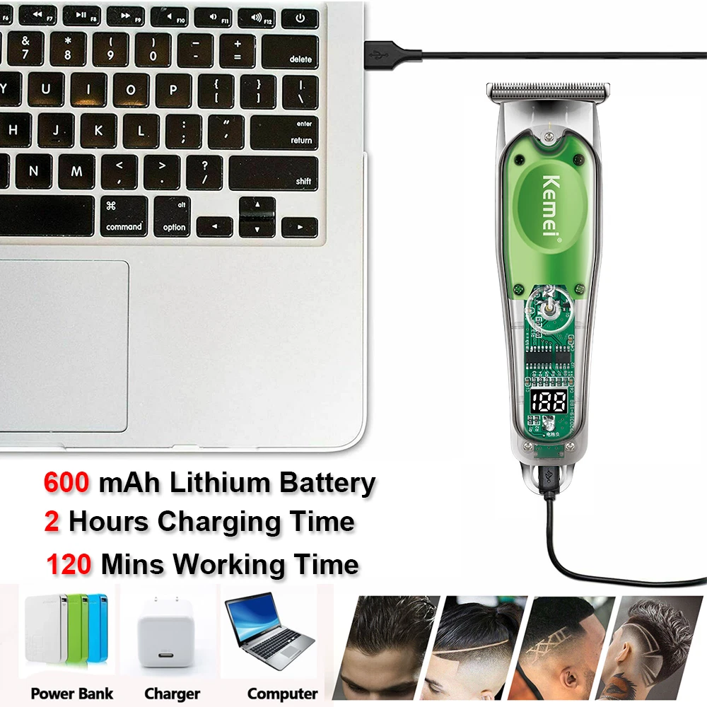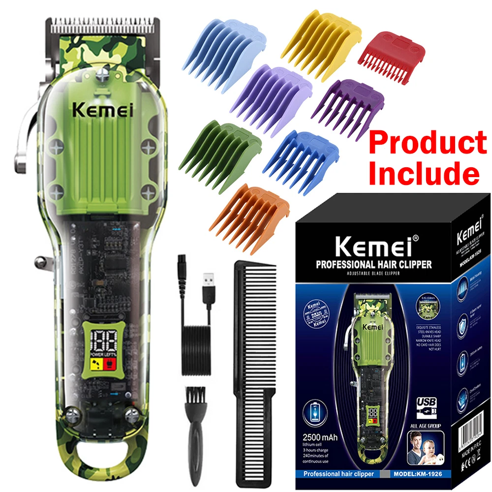Features: 1.Powerful long-life motor cute-angled moving blade, sharp and durable 2.Considerate and digitalized smart LCD display for reminder, 6300rpm/min strong power, Less than 55dB low noise, Once charging can last up to 240-min working time 3. Newly designed acrylic material, sturdy and durable, with a beautiful appearance, you can directly see the internal parts. Specification : Brand : KM-1926 Machine Weight : 267g Machine Size : 18*4.5*3cm / 7*1.7*1.2 Inch Voltage : 100-240V Frequency : 50/60Hz Batt e ry : 8W Charging Time : 3 Hours Using Time : 240 Mins Power Supply : USB Recharge Cleaning Way : Cleaning With Brush Package list : 1 * Hair clipper 8* Limit combs (1.5/3/4.5/6/10/13/16/19mm) 1 * USB cable 1 * Cleaning brush 1*Manual