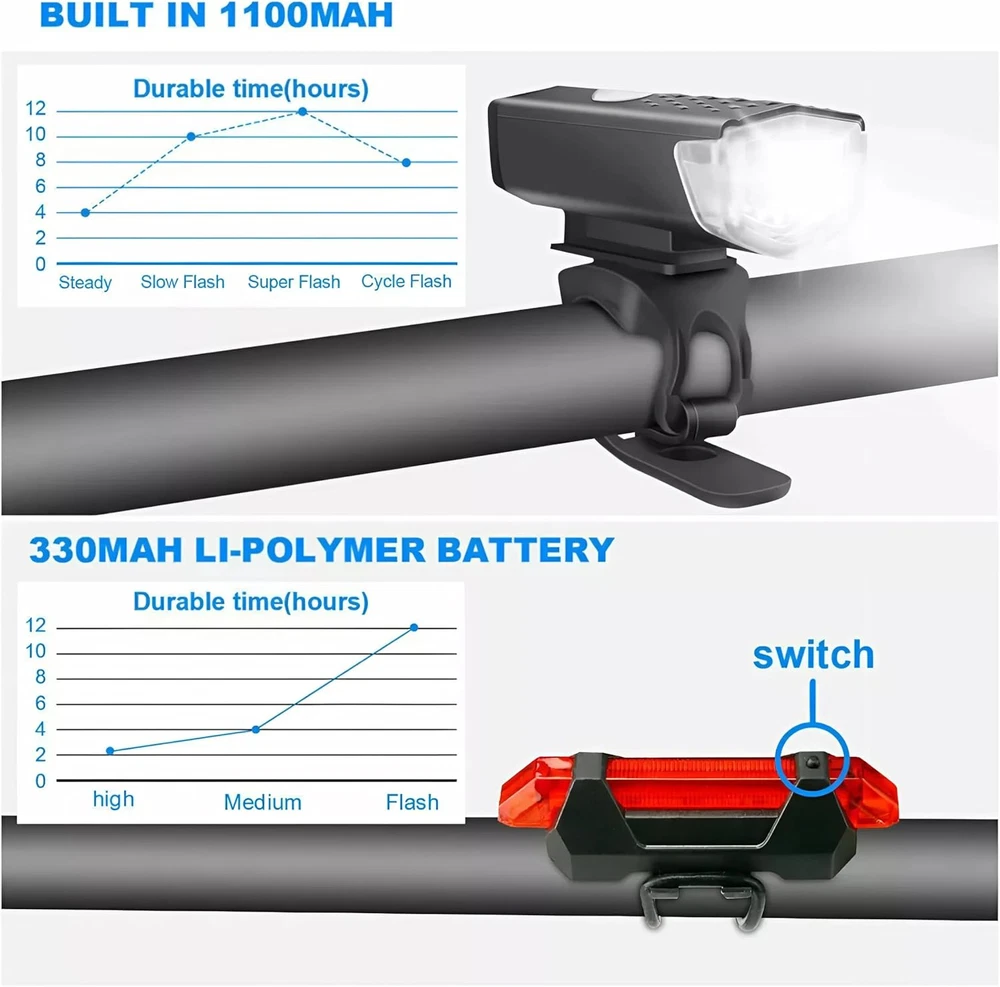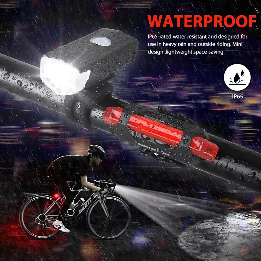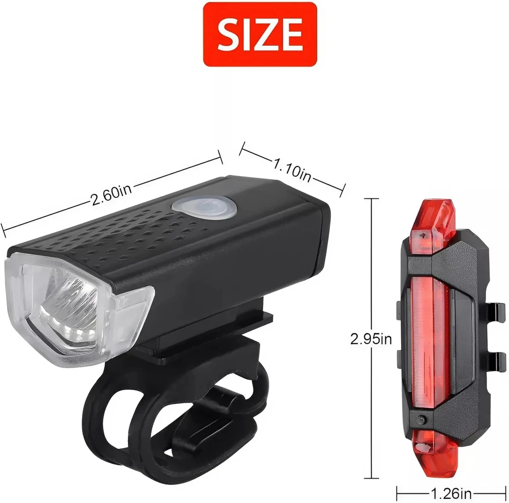 The bike front light with a mounting bracket and rear bike light with elastic bands can be easily fixed to the bike. bike headlight and taillight has slim and stylish design, sealed and waterproof. These bike lights are water resistant for any weather, and extremely durable. High brightness LED light with rechargeable lithium polymer battery, automatically shuts off the system when fully charged Bicycle warning light with ultra-wide angle irradiation area provides more safety. Whether you're running, walking with your dog, cycling, skateboarding or hiking, these safety lights will keep you safe and secure. Package Included: You will get1 x LED front light, 1 x LED rear light, 2 x USB charging cable Product Description 1. Headlight Headlight 4 modes (High, Medium, Flashing) 2. Taillight Taillight 4 modes (Fast flash, Slow flash,Storebe,Steady On) Package Including :- 1 x Front Light 1 x Back Light 1 x Black USB Cable 1 x White USB Cable 2 x O-Rings