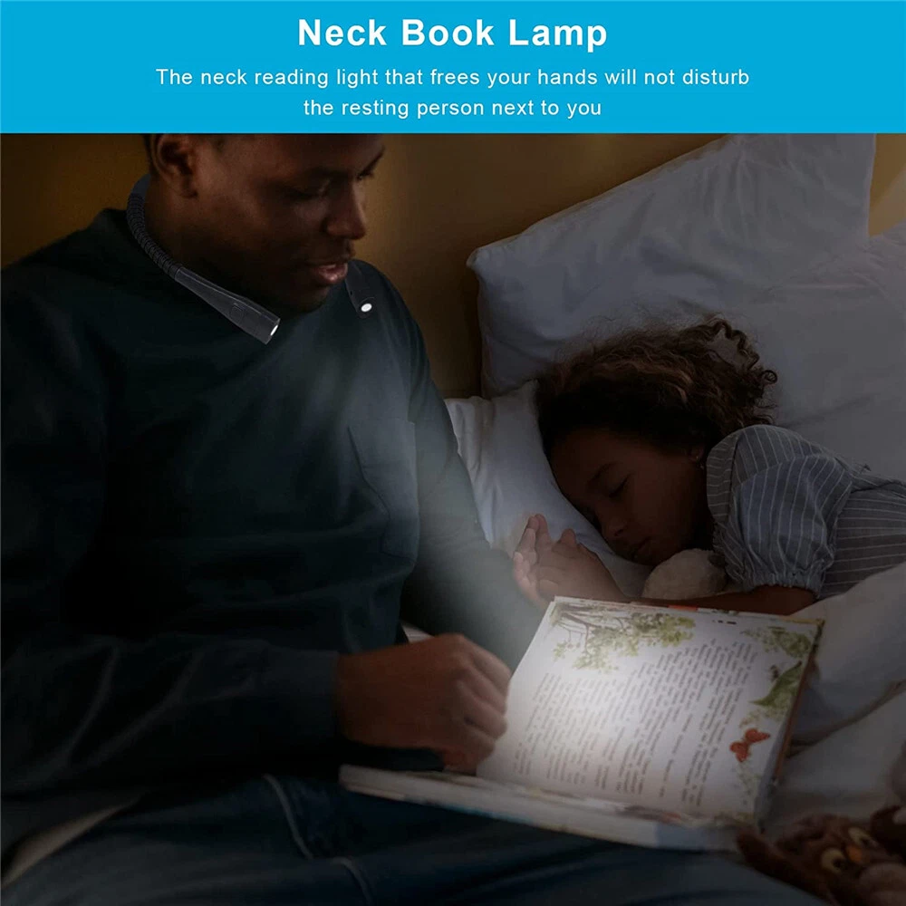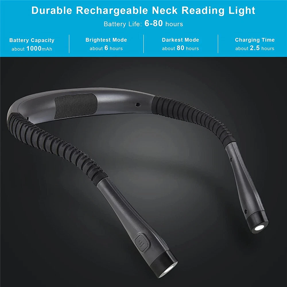 USB Rechargeable LED Neck Light Book Light for Reading in Bed Crafting Camping USB Rechargeable LED Neck Light Book Light for Reading in Bed Crafting Camping [9 Lighting Modes] 3 color temperature and 3 adjustable brightness levels, each head has an independent switch, you can choose a comfortable environment for reading, knitting, camping or repairing, etc. according to your needs. [USB Rechargeable] USB Type-C rechargeable, built-in 1000mAh high-capacity lithium battery, a full charge takes about 2.5 hours, high brightness can last 4-8 hours, low brightness can last 40-80 hours. [360° Flexible and Durable Arms] Made of high-quality rubber silicone, the neck light has durable and flexible arms, easy to choose the best angle to meet your various needs. [Intimate Design] Special narrow beam angle (90°) design. Won't disturb your sleeping partner when you want to read alone. [Compact and Portable] Weighing only 4.9 ounces, the bendable neck light doesn't require much space and fits easily into carry-on luggage, making it very convenient to carry around. Neck Reading Light This LED neck reading light has 3 color temperatures and 9 brightness levels, with a flexible arm so you can easily adjust to the proper angle and brightness. Helping you free your hands! Rechargeable 1000mAh built-in battery. Up to 80 hours available and no more frequently hunt for plug. The multifunctional neck light can be used for camping, reading, writing, knitting, repairing, and night running. Convenience to your life, light up your life! 3 Light Modes and 9 Levels Adjustable 9 brightness levels. Each mode has three gears that provide brightness variation from 10% to 100% bringing different brightness levels to meet different uses and scenarios. Rechargeable and Long-Lasting Rechargeable built-in 1000mAh huge capacity battery to provide brighter & longer light for you. After a full charge, it will last 6-80 hours. USB Type-C charging instead of common micro USB. It is reversible, so you will no longer have to flip the connector around multiple times looking for the correct orientation. With a universal Type-C interface, so you don't need to prepare an additional charger for the reading light. Package Included: 1 x Neck usb light 1 x Type-c usb cable 1 x Manual Listing and template services provided by inkFrog
