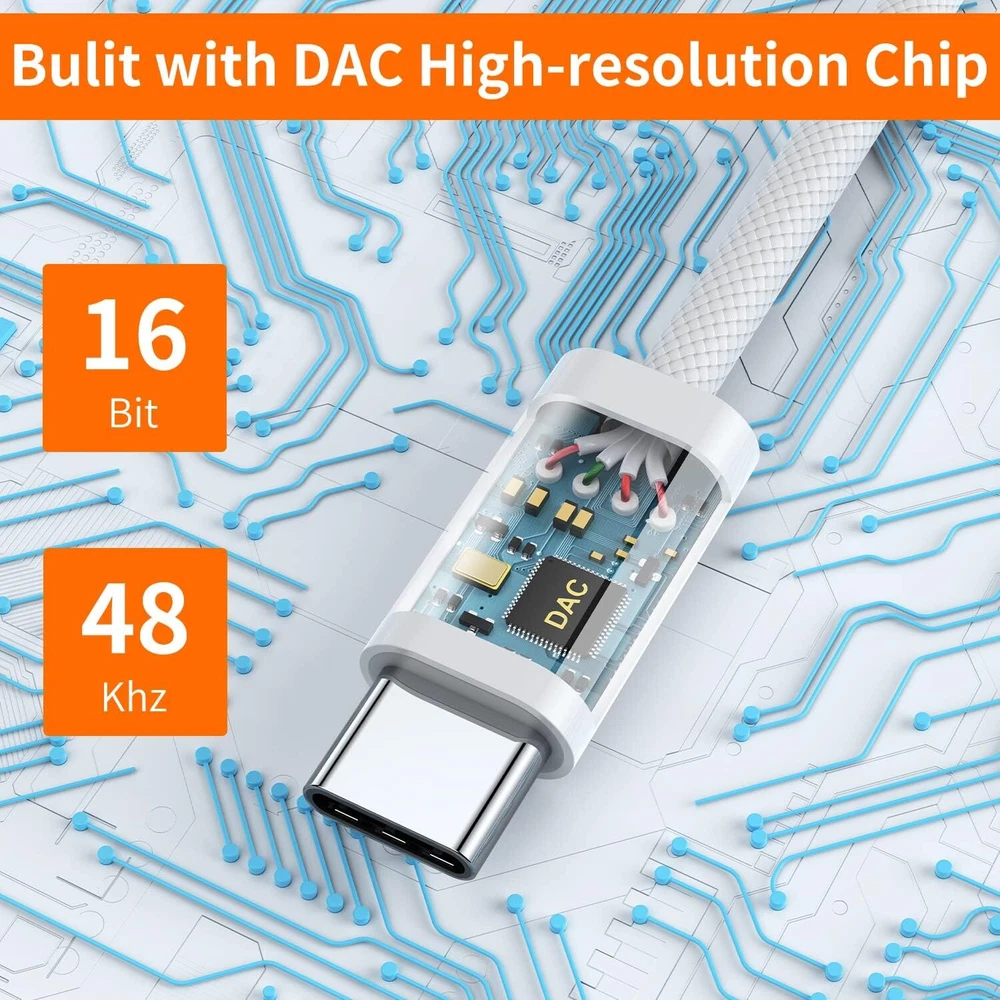 【Multi-function Dongle】: This USB C to aux adapter enable you to listen musics and answer phone call with your headphone as well as supports wire control function, such as microphone volume control, pause and play functions, playing games, plug and play, very easy to use. 【Hi-Fi DAC Chip】: The USB C to 3.5mm audio adapter features a Smart DAC chip. It is low power consumption, excellent and stable decoding performance, and maximum support for 16Bit/48Khz audio sampling rate. The DAC chip can also convert digital audio signals to analog audio signals,providing you with the excellent audio experience. 【Robust & Durable】: High quality ABS shell + Nylon-braided wire materials ensure 20000+ times bending and prevent damage caused by tangling and scratching.Shielded enamel wire can still ensure stable signal transmission with daily use. 【Wide Compatibility】: This Type-C to 3.5mm headphone cable is compatible with most Type-C phones : iPhone 16/16 Pro/16 Plus/16 Pro Max, iPhone 15/15 Pro/15 Plus/15 Pro Max, Samsung Galaxy S24 S24+ S24 Ultra, S23 S23+ S23 Ultra, S22 S22+ S22 Ultra, S21 S21+ S21 Ultra, S20 Z Flip S20+ S20 Ultra , S10 S9 S8 Plus, Note 20 ultra 10 10+ 9 8, iPad pro, iPad mini 6, iPad Air 4, Mac book, Google pixel 4 3 2 XL, One plus 6T 7 7Pro and more. 【Plug-and-Play】: Ultra-Portable - No drive needed.Built-in Powerful DAC Hi-Res Chip,Shield current interference and eliminate music noise. Super noise reduction technology creates flawless music transmission and crystal sound quality. Product Description Compatible List iPhone 15 / 15 Plus / 15 Pro / 15 Pro Max / 16 / 16 Plus / 16 Pro / 16 Pro Max Samsung Galaxy S24 / S24+ / S24 Ultra / S23 / S23+ / S23 Ultra / S22 / S22+ / S22 Ultra / Note 10 / Note 20 / S21 / S21+ / S21 Ultra / S20 / S20 + / S20 Ultra OnePlus 6T / OnePlus 7 / 7 T / 7 Pro iPad pro / iPad mini 6 / iPad Air 4 Macbook Pro / Macbook Air Google Pixel 4XL / 3 / 3 XL / 2 / 2 XL Xiaomi8 / 6, mix 1 / 2 Huawei Mate 20 Pro / 30 / 30Pro / P20 / P20 pro Relief Strain Design With the relief strain design, this adapter can stand 12000+ bending tests, which makes this adpter much more durable. Small and portable The Length of USB C to 3.5MM adapter is only 11CM. So you can put it in a backpack or pocket. Plug and Play No need to install software, drive, or complex connection mode, plug and play.