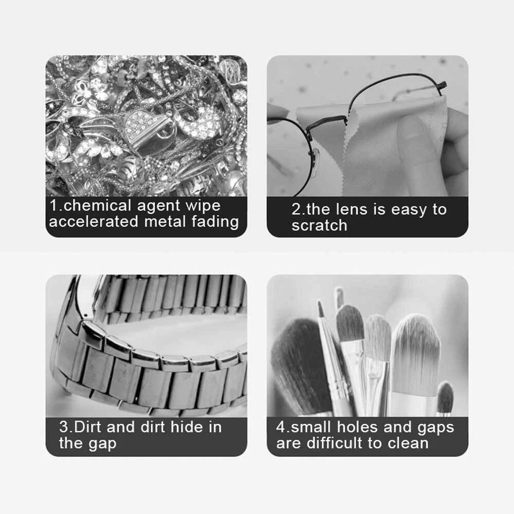 Features 1. Multifunctional jewellery cleaner: can be used to clean jewellery, rings, glasses, dentures, watches coins, etc. 2. Ultrasonic cleaning: "cavitation effect", fast cleaning of stains. 3. One key start: 360° purification, deep cleaning of crevice dirt 4. How to use: Add the right amount of water, one key to start cleaning, efficient cleaning, easy to remove stains 5. Advanced cleaning method: Stop using traditional liquid cleaners and brushes, which can damage your valuables and hands. Ultrasonic cleaners are the perfect alternative to traditional liquid cleaners. Making cleaning dirt easier and safer, you can clean your items anywhere, anytime, without the ultrasonic waves scratching or damaging your valuables. Description. Material: ABS Size: As shown in the picture Two power supply options: Battery model: 2 x AAA batteries (not included) / USB cable power Product list. USB Powered. 1x Ultrasonic Make-up Tool Jewellery Contact Lens Braces Watch Cleaner 1xUSB cable Battery Powered. 1xUltrasonic make-up tool jewellery contact lens braces watch cleaner (battery not included)