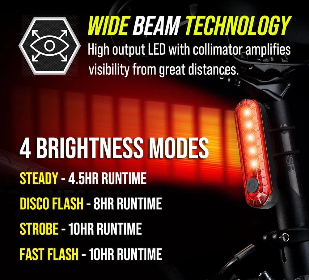 Ultra-Bright LED Bike Tail Lights for Maximum Visibility: The BLITZU Cyborg 120T red LED bike tail lights provide exceptional brightness, ensuring high visibility during night cycling, commuting, and mountain biking. Perfect for road bike riders, MTB cyclists, and anyone who rides in low-light or dark conditions. USB-C Rechargeable & Long Battery Life: Enjoy the convenience of USB-C rechargeable bike tail lights that charge quickly and provide long-lasting performance. Save money and reduce waste with these eco-friendly rechargeable bike lights, offering up to 10 hours of bright illumination on a single charge. Waterproof & Weather-Resistant for All Conditions: These waterproof bike rear lights are designed to withstand rain, snow, and fog, ensuring reliable performance in any weather. Perfect for rainy rides or foggy conditions, keeping you visible and safe on wet roads and bike trails. Versatile Mounting for Bikes, Helmets, and More: These LED bike tail lights are easy to install on your bike frame, helmet, or backpack, making them ideal for adult cyclists, kids, and families. Versatile and adjustable, they fit most MTB, road bikes, and commuter bikes. Secure & Versatile Mounting: The durable, flexible mount easily attaches to a variety of surfaces, including seatposts, seatstays, helmets, saddle bags, backpacks, skateboards, scooters, strollers, wheelchairs, and even dog collars. The adjustable hinge allows you to tilt the light up or down, providing targeted illumination exactly where it's needed. Essential Safety Accessories for Cyclists: The BLITZU 2025 bike tail light 2-pack is an essential safety accessory set for all cyclists. Whether you're cycling in the city or on the trails, these high-visibility bike reflectors make a perfect gift for cyclists of all ages, ensuring a safer, more visible ride for both adults and kids. Product Description The video showcases the product in use. The video guides you through product setup. The video compares multiple products. The video shows the product being unpacked. Expertise you can trust Features USB-C Rechargeable Ultra Sleek Design 4 Lighting Modes Long Lasting Battery Enhanced safety during the day Each package comes with 2 lights Universal Mounting System Check Out More from BLITZU Add to Cart Add to Cart Add to Cart Add to Cart Add to Cart Add to Cart Customer Reviews 4.2 out of 5 stars 464 4.2 out of 5 stars 8,249 4.5 out of 5 stars 19,438 4.5 out of 5 stars 3,555 4.5 out of 5 stars 2,279 4.4 out of 5 stars 2,984 Price $19.95 $ 19 . 95 $18.79 $ 18 . 79 $18.95 $ 18 . 95 $19.97 $ 19 . 97 $22.79 $ 22 . 79 $17.79 $ 17 . 79 Battery Life 2hr to 8hr 2hr 30min to 6hr 2hr 55min to 6hr 10mins 3hr 5min to 6hr 15mins 3hr 10min to 6hr 20mins 100+ Hours Number of Modes 6 6 5 5 5 3 USB Rechargeable ✔ ✔ ✔ ✔ ✔ ✔ Day and Night Modes ✔ ✔ ✔ ✔ ✔ ✔ Water Resistance ✔ ✔ ✔ ✔ ✔ ✔