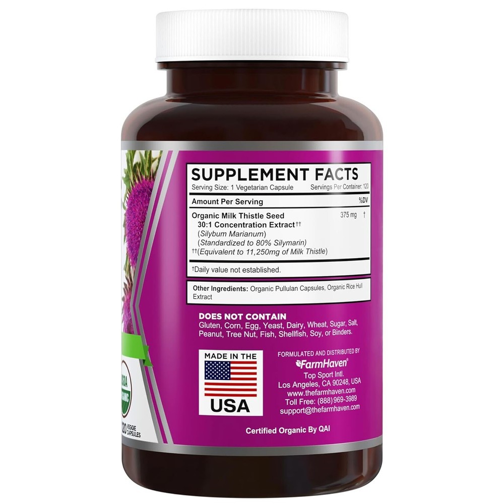 USDA ORGANIC SILYMARIN CONTENT: FarmHaven has formulated highly potent USDA Certified Organic Milk Thistle (silybum marianum) capsules containing extract that is standardized to 80% Silymarin flavonoids, the "good stuff" in Milk Thistle. This means each capsule contains 300mg of pure organic Silymarin. SUPPORTS HEALTHY LIVER FUNCTION*: The Silymarin found in organic Milk Thistle provides a natural way to support healthy liver function.* Silymarin helps support cell health and function.* POTENT 30:1 CONCENTRATION: FarmHaven's certified organic seed extract content means you're choosing a high strength and high purity product that's also good for the earth. Our Milk Thistle pills contain a 30:1 concentrate extract so each capsule actually delivers the equivalent of 11,250mg raw Milk Thistle seed for improved bioavailability and absorption.* SUPPORTS HEALTHY SKIN & MORE*: Milk Thistle has beneficial properties that may help support healthy skin, promote proper digestion, and promote a natural immune response.* CERTIFIED ORGANIC, VEGAN & MADE IN USA: Our product is USDA certified organic so you know it's a clean and pure product. It's also vegan, non-GMO and free of gluten, corn, soy, preservatives, and any artificial ingredients. We utilize organic plant-based veggie capsules and manufacture in the USA in an NSF-Certified facility to ensure safety and purity. Ingredients Organic Milk Thistle Seed 30:1 Concentration Extract (Silybum Marianum) (Standardized to 80% Silymarin) - Other Ingredients: Organic Pullulan Capsule, Organic Rice Hull Extract