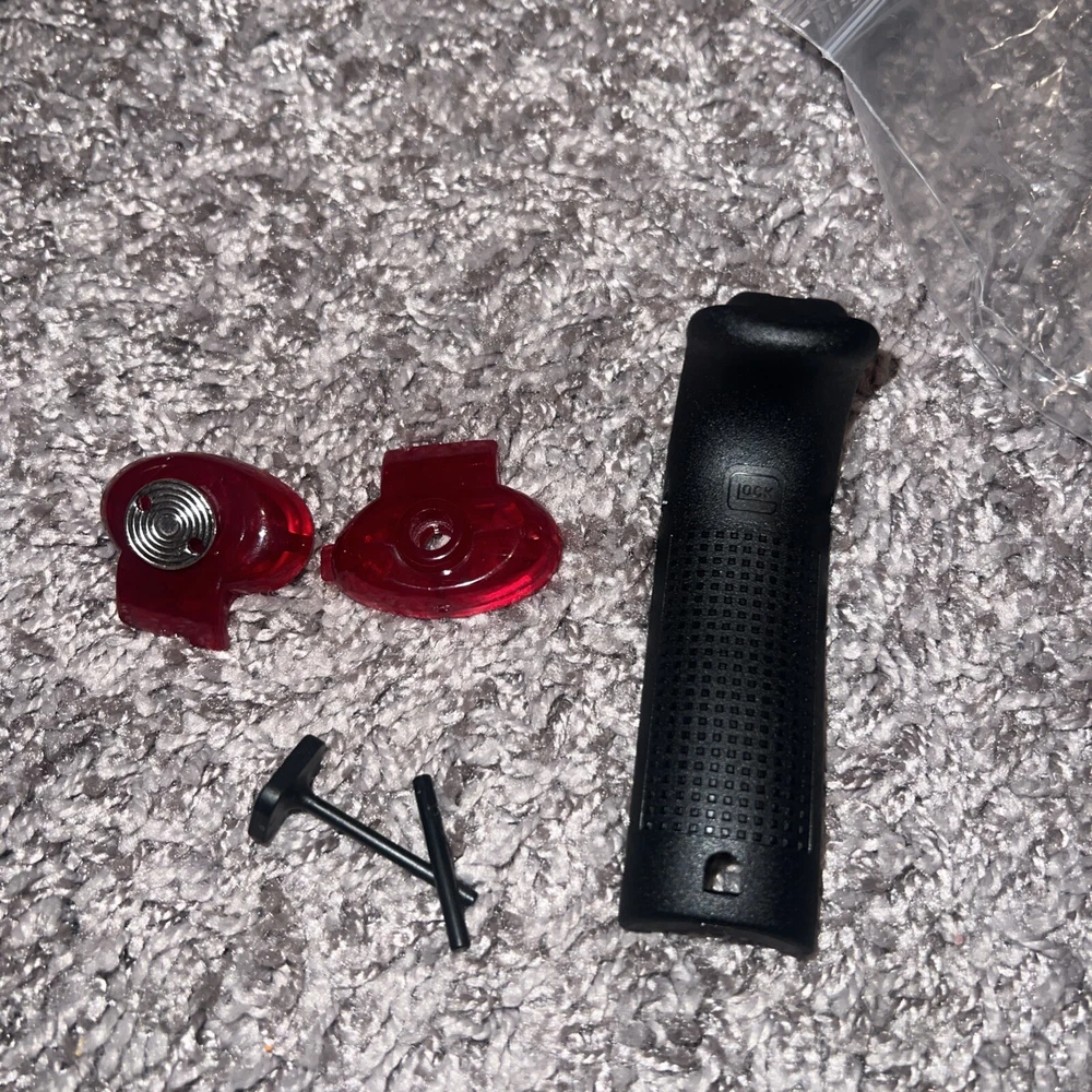 The product is a used OEM Glock 19 medium beavertail backstrap designed for Glock handguns, specifically for Gen 4 and Gen 5 models. It is black in color and made of plastic, originating from Austria. This backstrap is suitable for Glock 19 models and provides a comfortable grip with the added beavertail feature for improved control and handling during shooting.