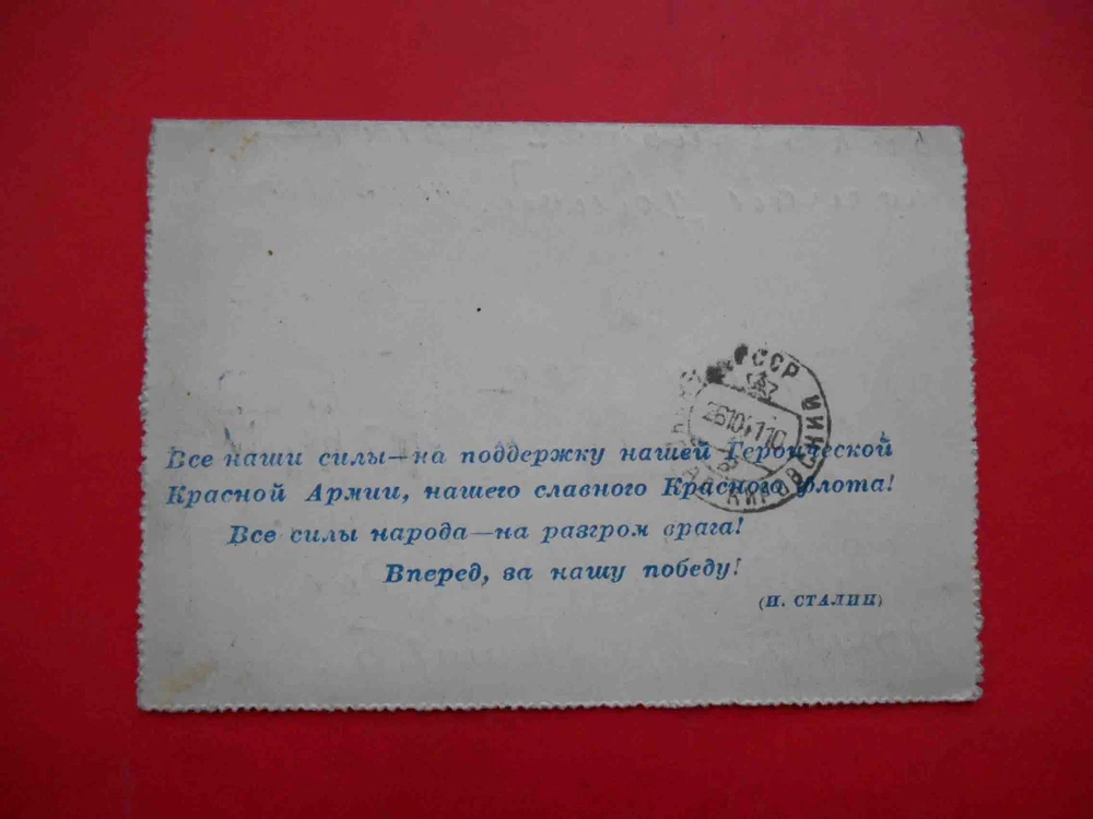 New Page 1 New Page 1 USSR 1941 Early type envelope with agitation. Russian WWII cover from Red Army. USSR 1941 Early type envelope with agitation. Russian WWII cover from Red Army . This item is in very good condition. (See pictures). Excellent item a collection!!! PAYMENT AND SHIPPING.br I accept Visa/MC credit card payments via PayPal. Winner pays $9.00 s/h. (Airmail, registered letter). If you win more than one item shipping costs will be combined. International shipping (Except russia and belarus).