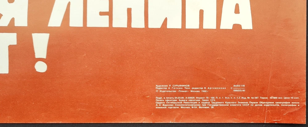 - Origianl slogan on the poster: НАС ЗНАМЯ ЛЕНИНА ВЕДЕТ! МИР, СВОБОДА, НЕЗАВИСИМОСТЬ НАРОДОВ, СОЦИАЛИЗМ Literally English translation of the main slogan: THE BANNER OF LENIN IS LEADING US! FREEDOM, INDEPENDENCE FOR NATIONS, PEACE, SOCIALISM! border-spacing POSTER ARTIST: SURYANINOV RUBEN SUBJECT: PEACE, SOCIALISM PRINT YEAR: 1980 LANGUAGE: RUSSIAN PRINT RUN: 80.000 SIZE: 27 ½" x 39 ⅜" = CM: 70 x 100 PUBLISHED BY: "PLAKAT", MOSCOW CONDITION: ROLLED, GOOD - - - Listing and template services provided by inkFrog