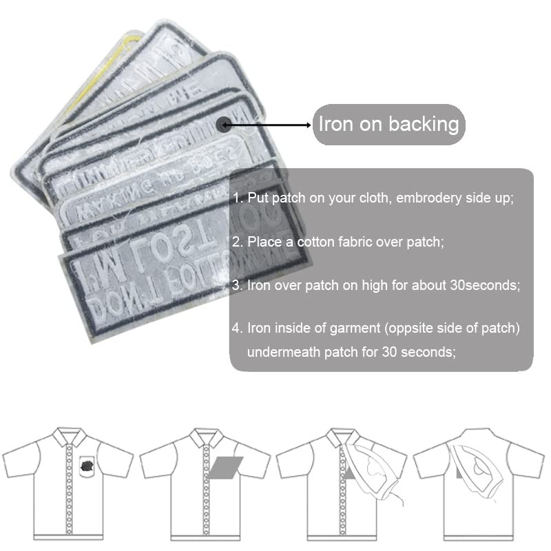 ✔ ✔ How to Use? ✔ 1:Examine the fabric of your clothing or accessory. Fabrics like denim and cotton provide the best base for iron-on patches. Look at the fabric care label to see whether it can be ironed (if not, there will be a crossed-out icon of an iron). Be very careful with polyester fabrics, since applying the high heat necessary for ironing on patches can burn the fabric or cause it to get discolored Silk and other delicate fabrics are not good candidates for patches ✔ 2:Lay the base item on a flat, heat-resistant surface. ✔ 3:Place the patch in the position you chose. The adhesive side should be flat against the base fabric. Make sure that isn't crooked. ✔ 4:Heat up an iron Turn it to the hottest setting your fabric can tolerate. Make sure the "steam" option is turned off ✔ 5:Place a thin towel over the patch The towel will protect the patch itself and the surrounding fabric ✔ 6:Position the heated iron over the patch and press down Hold the iron there for about 15 seconds. Apply as much pressure as you can by pressing down firmly ✔ 7:Remove the iron and allow the patch to cool Check to see whether the patch is fixed on securely by gently rubbing at the edge with a finger, trying to lift it. If it lifts up a bit, replace the towel and press it with the iron again for 10 seconds. ✔ ✔ ✔ NOTICE Consider sewing around the edges This greatly reduces the chances that the patch will fall off. Don't wash the article more than necessary Take care not to let the article get too dirty, since washing it may cause the patch to start coming off. Cold water. Air dry. This mix pack assortment letter iron patches vintage include 20pcs different slogan iron on decals applique patches for adult clothes. Iron patches are great for clothing, especially Jeans, Jackets, Shirt, Backpacks, Pants, Hats; Front side of patch is polyester fabric, rear side is covered with hot-melt adhesive film; All iron on patches for clothes have different size. Size of la la la i'm not listening: 3.34x1.57inch; Patches ironed are washable and can be ironed on again if it start to peel off. One U-Sky patches can be ironed at least 2-3 times; Easy to apply, which only takes few mins to repair holes on pants or decorate your jackets and backpacks; Set Iron to "Cotton" at degree clothes can undertake, for 20-40 seconds;