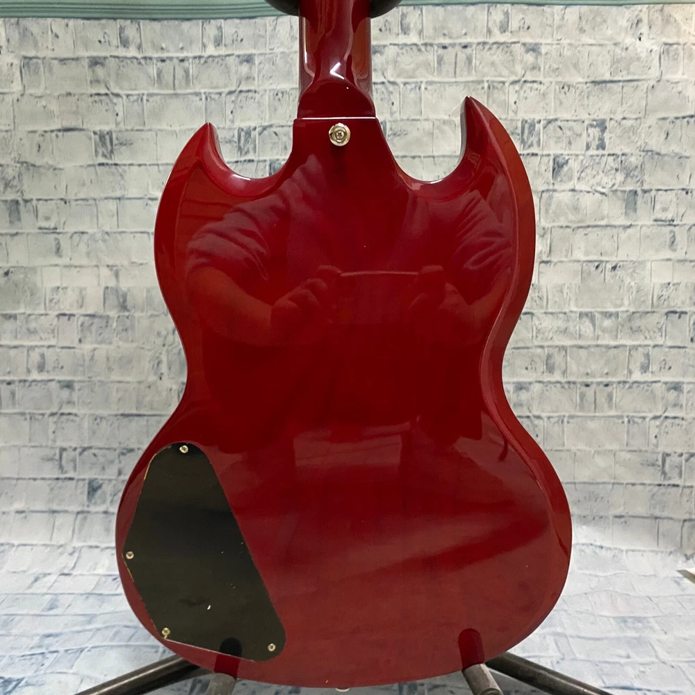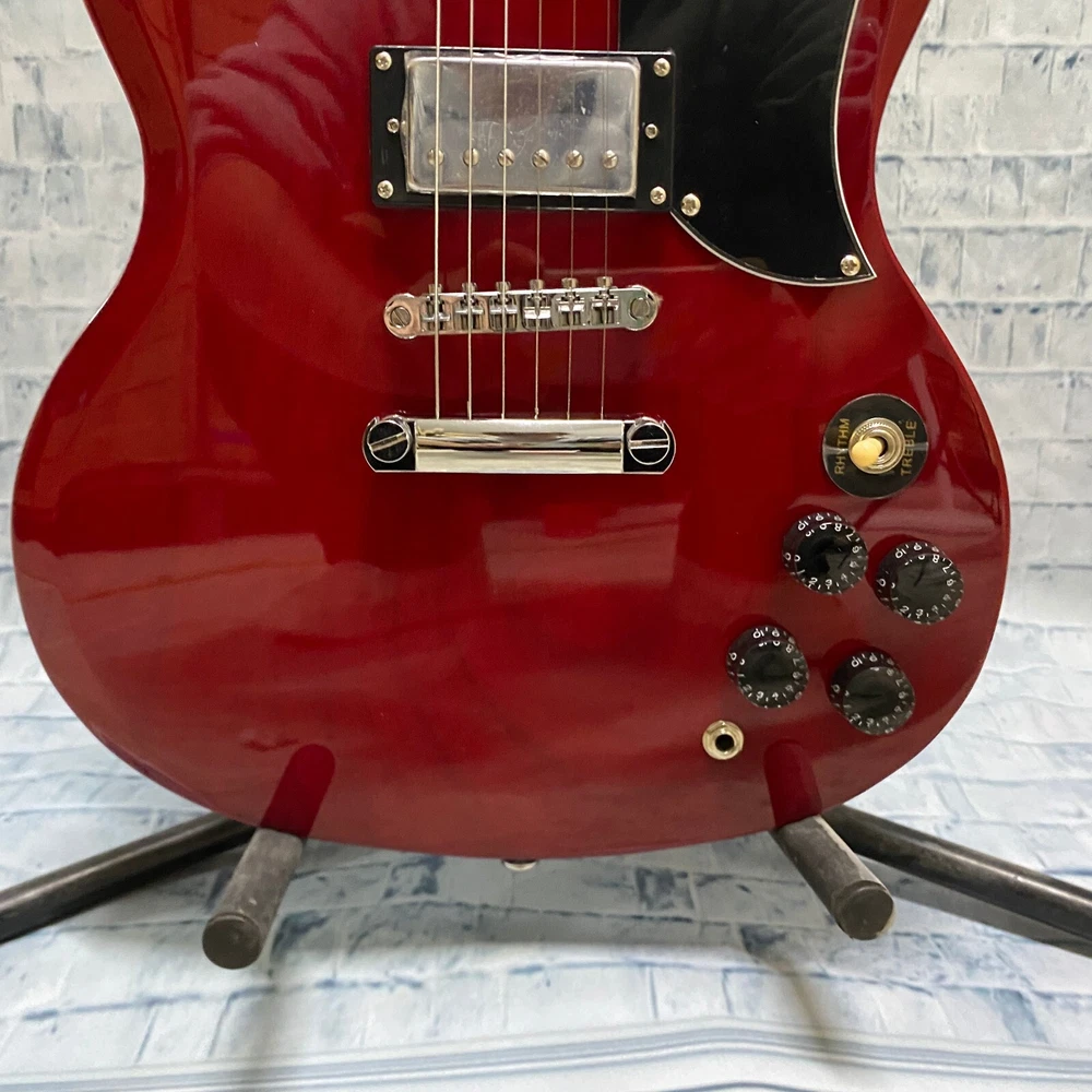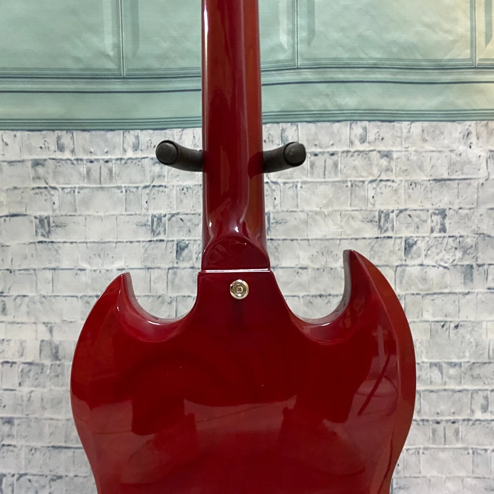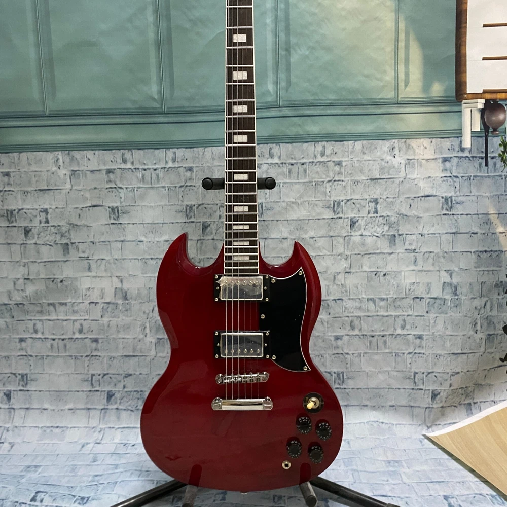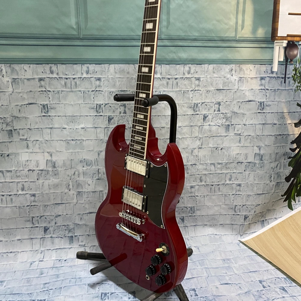 This is a professional-level SG electric guitar in metallic red with a solid mahogany body and mahogany neck. It has 22 frets on a rosewood fretboard, featuring chrome hardware. The set includes a cable, and it is a 6-string right-handed electric guitar from the 2024 Custom series, made in China.