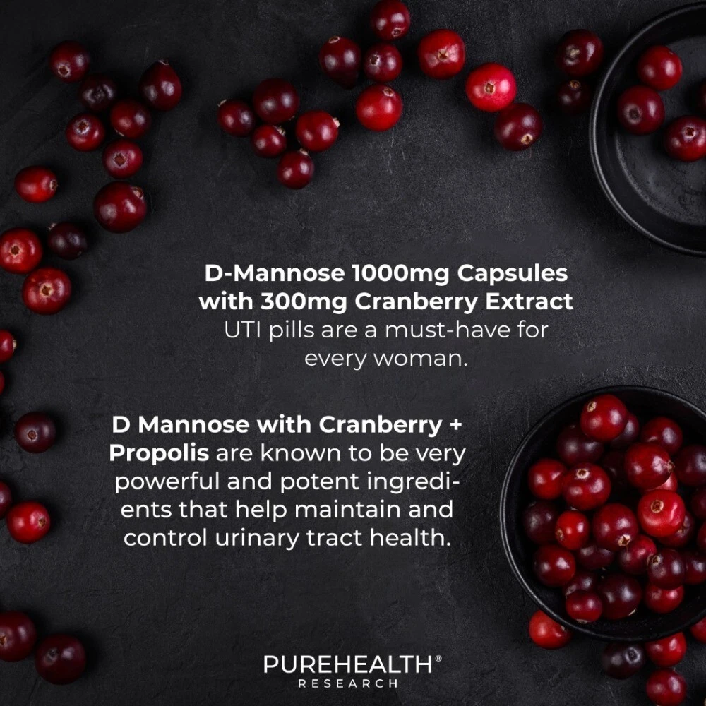 Product Overview D-Mannose with Cranberry + Propolis and other ingredients are well known to be very powerful and effective ingredients. D-Mannose 1000mg capsules with 300mg cranberry extract help maintain and control women's urinary tract health. This condition is not uncommon in men as well, but for women, these UTI capsules are a must-have. UT Fix Formula, a UTI supplement for women, is a long-term control method for improved health and peace of mind. Our D-Mannose capsules help relieve discomfort, reduce endless nighttime trips to the bathroom, and maintain and preserve better urinary tract health. The Cranberry D-Mannose Propolis blend is considered the easiest way to deal with any further bladder control issues while flushing your UTI out of the system. No more sleep interruptions or unnecessary pain - enjoy a better quality of life, because everyone deserves it. UT FIX by PureHealth Research is developed by our team of expert nutritionists and scientists. UT Fix supplements are gluten-free, dairy-free, soy-free, and non-GMO. Suggested Use As a dietary supplement, take 2 vegetarian capsules daily, preferably with a meal and water, or as directed by a healthcare professional. Storage Store in a cool, dry place. Avoid heat, light, and moisture