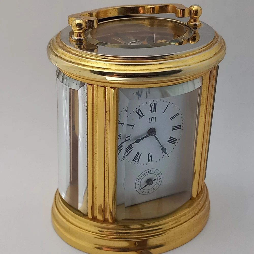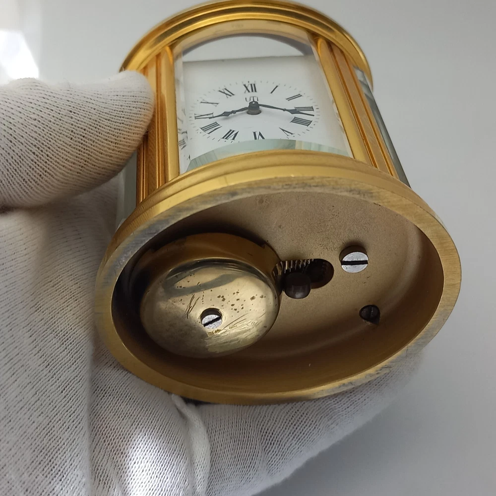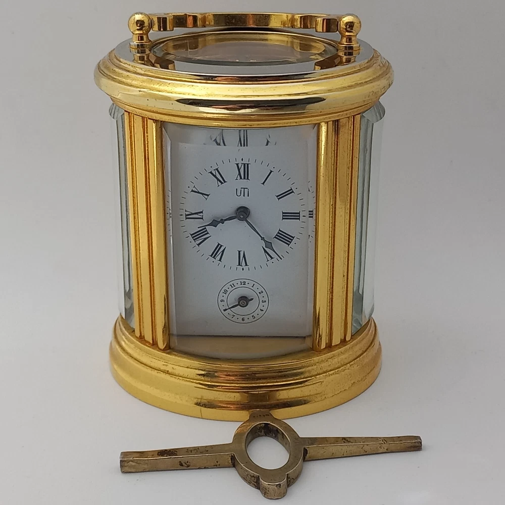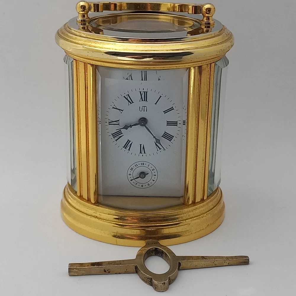 UTI L'EPEE 1839 For sale UTI oval French miniature carriage alarm 8-day clock, white dial, with black scotia hands, movement 11 jewels, Made in France signed "L'Epee 1839". B ell under the base. Measurements: Height 8 cm without the handle, Depth 5 cm Width 6.2 cm. The gold tone case is in very good condition. The original beveled glass has no scratches. The white dial with black hands is also in great shape. The watch works and gives very good time. The watch comes with its original double-headed key. As for the Alarm, it requires some maintenance. I'm not sure what the exact problem is, but when you try to wind it, it starts working on its own. This indicates that it requires repair. Being sold as is as found condition. We combine shipping. Terms & Conditions We are dealing with pre-owned/ used/ vintage timepieces. Our items are 100% authentic. All photos are taken by us. Buyers will receive the same item that is shown in the photos. We provide a full description and many photos of the item and we expect you to contact us for extra details. Shipping We ship international expedited shipping via DHL with tracking. Phone number is required by DHL for shipping. We ship from Lebanon. We combine shipping. We are not affiliated in any way with any of the presented brands. Buyer will have to pay any custom fees for releasing the item in their own country, this will effect delivery times. Check the custom fees in your country before you buy.