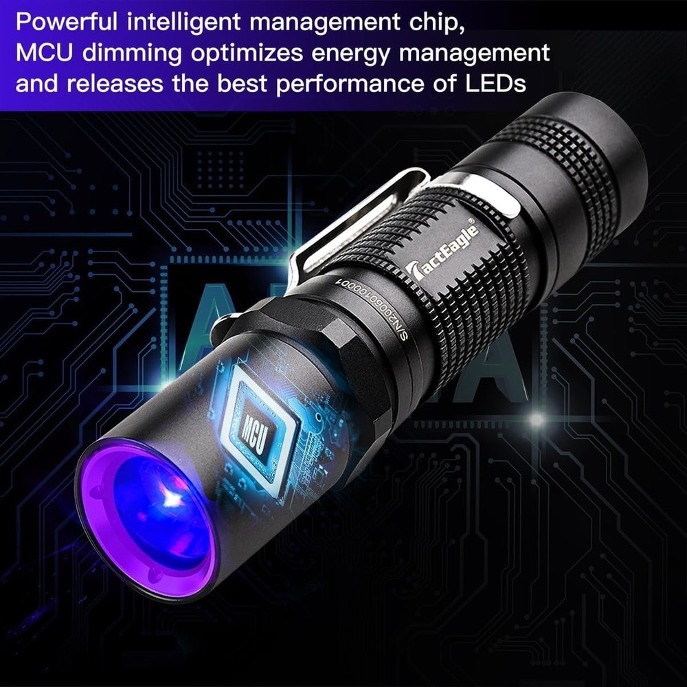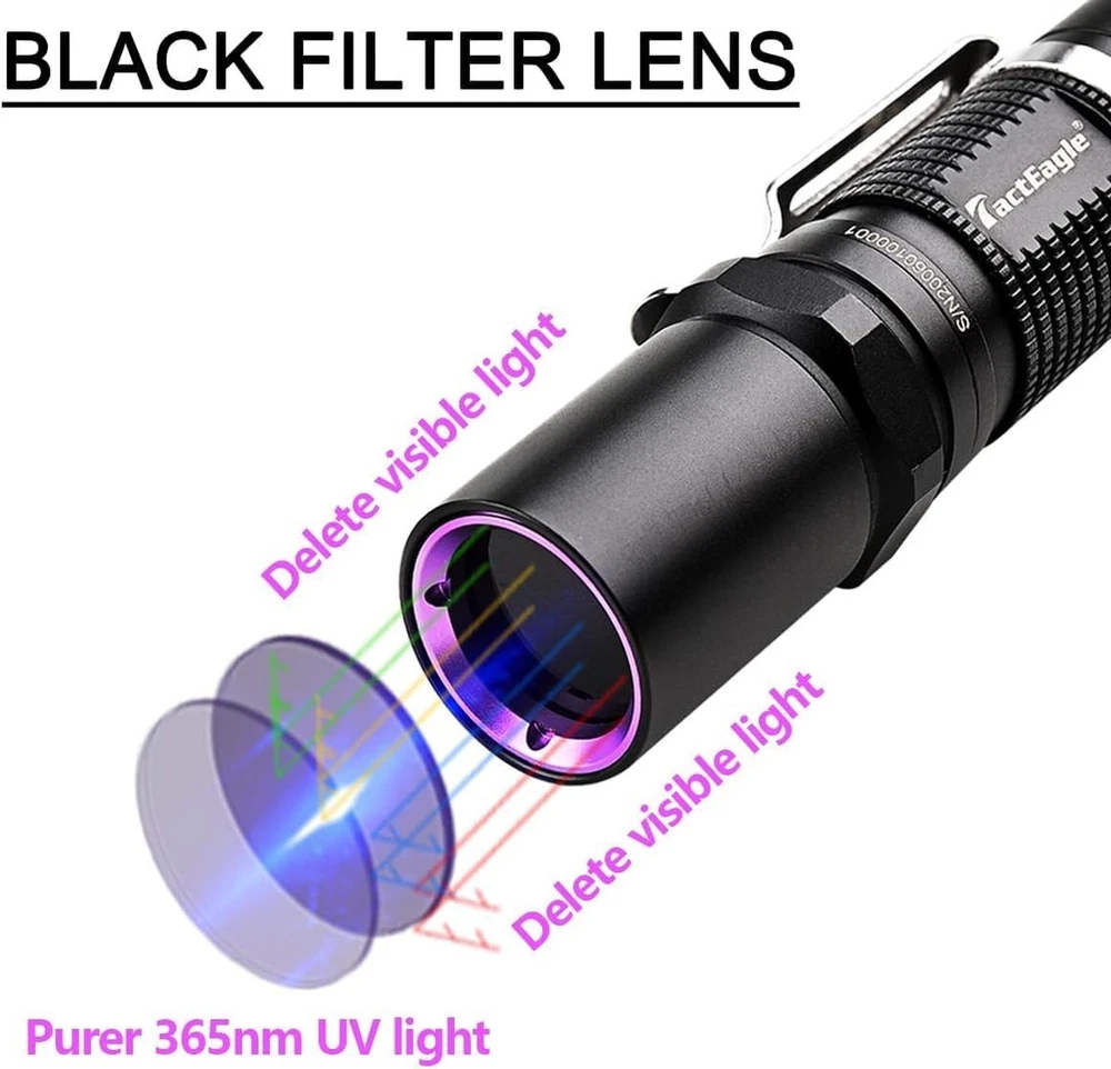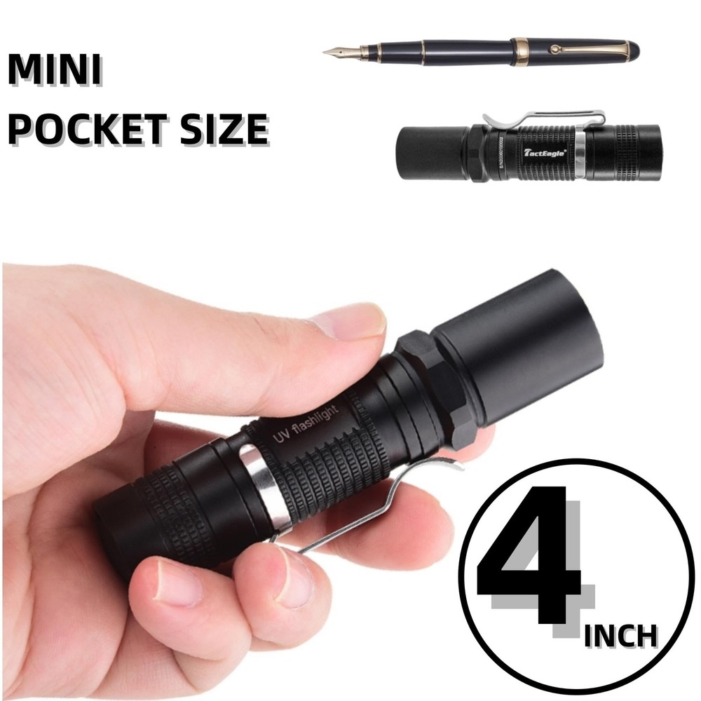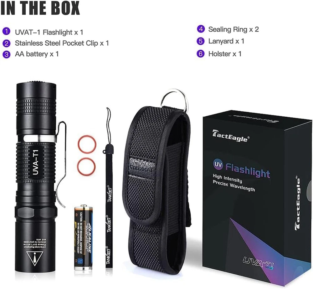UV Flashlight Black Light Flashlight Mini UVA-T1 Max 3000mW High Power for Pet Urine Detection, Rocks, Minerals Glowing and UV Resin Glue Curing Product Details Color: UVA-T1 Brand: TactEagle MPN: UVA-T1 UPC: 749640330534 EAN: 0749640330534 Special Feature: Portable, Lightweight, High Power, Stain Detector, Durable Color: UVA-T1 Power Source: Corded-Electric, Battery Powered Light Source Type: LED Material: Aluminum, Resin Is Discontinued By Manufacturer : No Product Dimensions : 4.05 x 0.87 x 0.87 inches; 7.05 ounces Item model number : UVA-T1 Batteries : 1 AA batteries required. (included) Date First Available : February 12, 2021 Manufacturer : TactEagle Customer Reviews: 4.5 4.5 out of 5 stars 348 ratings Special Feature: Portable, Lightweight, High Power, Stain Detector, Durable Color: UVA-T1 Power Source: Corded-Electric, Battery Powered Light Source Type: LED Material: Aluminum, Resin Included Components: Battery Voltage: 1.5 Volts Battery Cell Composition: Alkaline Number of Batteries: 1 AA batteries required. (included) Water Resistance Level: Waterproof Brand: TactEagle Brightness: 300 lumen Battery Description: Alkaline Runtime: 2 hours Style: Compact Finish Type: Resin Light Source Wattage: 3 Watts Mounting Type: Handheld Recommended Uses For Product: UV resin glue curing, rocks and minerals observation, pet urine stain detection, low-light inspection Manufacturer: TactEagle UPC: 749640330534 Part Number: UVA-T1 Item Weight: 7 ounces Product Dimensions: 4.05 x 0.87 x 0.87 inches Item model number: UVA-T1 Batteries: 1 AA batteries required. (included) Is Discontinued By Manufacturer: No Assembled Height: 0.87 inches Assembled Length: 4.05 inches Assembled Width: 0.87 inches Shape: Compact Finish types: Resin Number of Lights: 1 Special Features: Portable, Lightweight, High Power, Stain Detector, Durable Batteries Included?: Yes Batteries Required?: Yes Wattage: 3 Watts Bulb Features: High Intensity, Pure Beam, Focused Light Date First Available: February 12, 2021 High-Intensity 365nm Black Light FlashlightThe Tacteagle UVA-T1 features a powerful 365nm UV Flashlight with high intensity and radiant energy, making it ideal for detecting pet stains, scorpions, and other hidden traces. The black filter optical lens ensures pure UV light, providing a narrow and focused beam for precise detection. Durable and Portable DesignCrafted from high-strength aerospace aluminum alloy, the black light is both lightweight and sturdy. Its hard-anodized surface finish is resistant to scratches and corrosion, making it durable even in harsh environments. Plus, its compact and easy to carry, perfect for on-the-go use. Long Runtime and Energy EfficiencyPowered by a single AA alkaline battery, the uv light offers over 2 hours of runtime. It incorporates a smart MCU chip circuit for digital regulated current, ensuring constant brightness and energy efficiency. This blacklight flashlight is designed for long-lasting performance with minimal energy use. Impact and Waterproof ResistanceBuilt to withstand tough conditions, the UVA-T1 can endure a 5-foot drop impact and is IPX-8 waterproof, meaning it can be submerged in water up to 6.5 feet for 30 minutes without any damage. Its designed to handle rugged environments, making it reliable for both indoor and outdoor use. Versatile ApplicationsThe black light is not just for pet urine detection! Its perfect for a range of tasks including rock and mineral hunting, jewelry appraisal, UV glue curing, leak detection, and even counterfeit detection. Whether youre a hobbyist or a professional, this flashlight is a versatile tool for many applications.