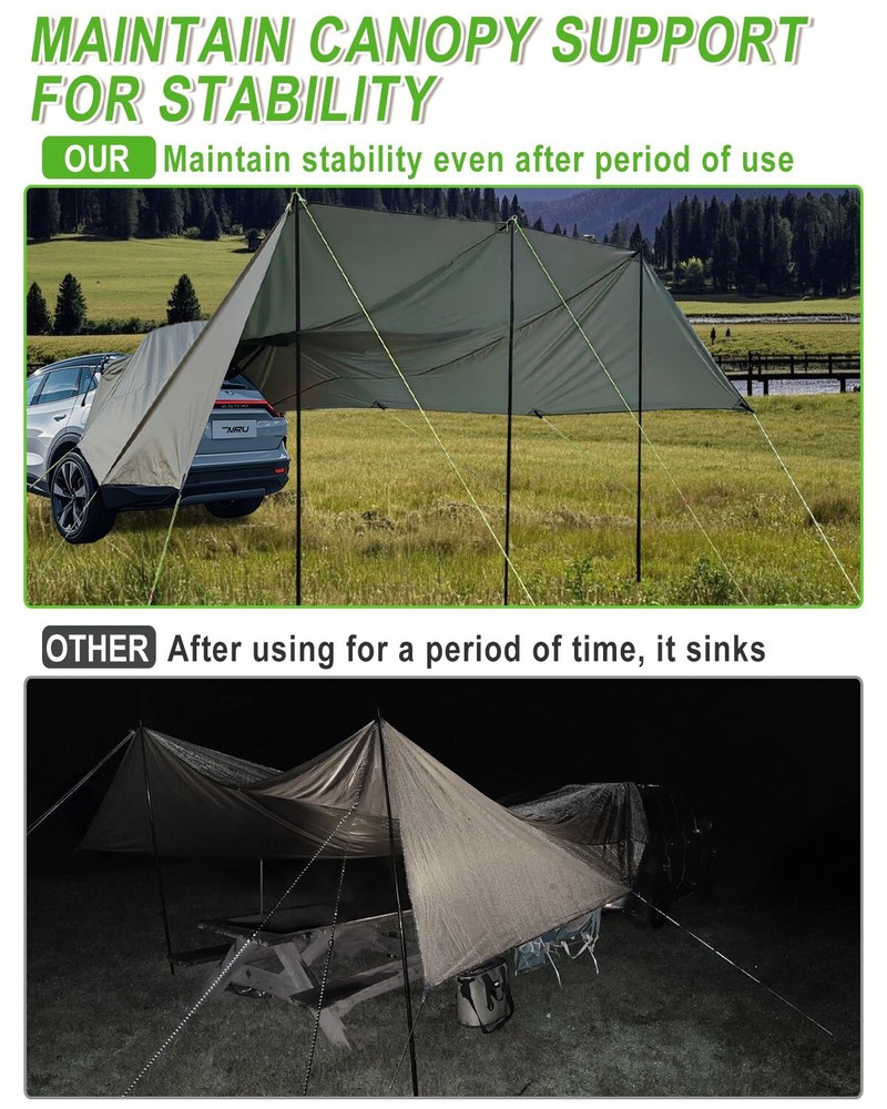 [EXCELLENT FABRIC PROTECTION]: Our car awning for suv paired with silver PU lining. The suv awning is reinforced at the connection corners, which has tear resistance and waterproofness, and can withstand 99.5% ultraviolet rays. Provide you with a comfortable sun shading environment [SPACIOUS SUNSHADE SPACE]: The size of the truck canopy is 196 x 228/103 inches, providing approximately 20 square meters/215 square feet of shading area. It can accommodate 4-5 people sitting around a table, providing a safe and comfortable residence outdoors, making it convenient for you and your family to travel [STABLE WINDPROOF SUPPORT]: Equipped with three support rods, it can ensure that the umbrella cover does not sag in the middle. Featuring greater stability, equipped with 8 ground studs and 8 green fluorescent wind ropes, it provides excellent windproof performance for truck awning [UNIVERSAL AND COMPLETE ACCESSORIES]: The tailgate suv tents for camping can be connected to most MPV, SUV, Trucks, VANs, CUV and other vehicles with universal fit design, equipped with 8 ground studs, 8 green fluorescent wind ropes, 3 support rods, and two storage bags (one canopy and one support rod) [EASY AND FAST INSTALLATION]: Using a detachable buckle connection system, simply connect the middle buckle to the roof rack, connect the two buckle ends to the tires, use support rods to support the canopy, fix the ground nails, and easily complete the installation of the camping awning