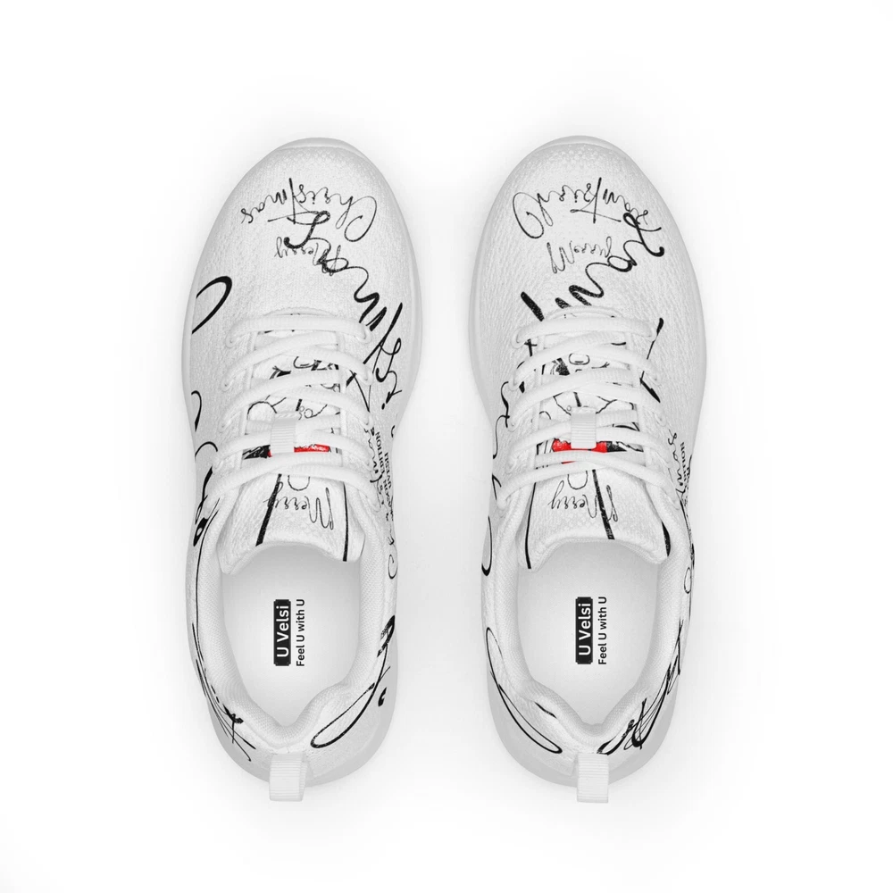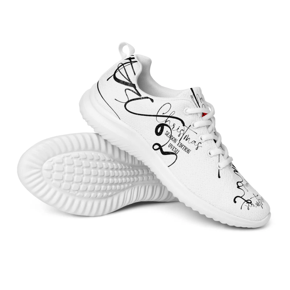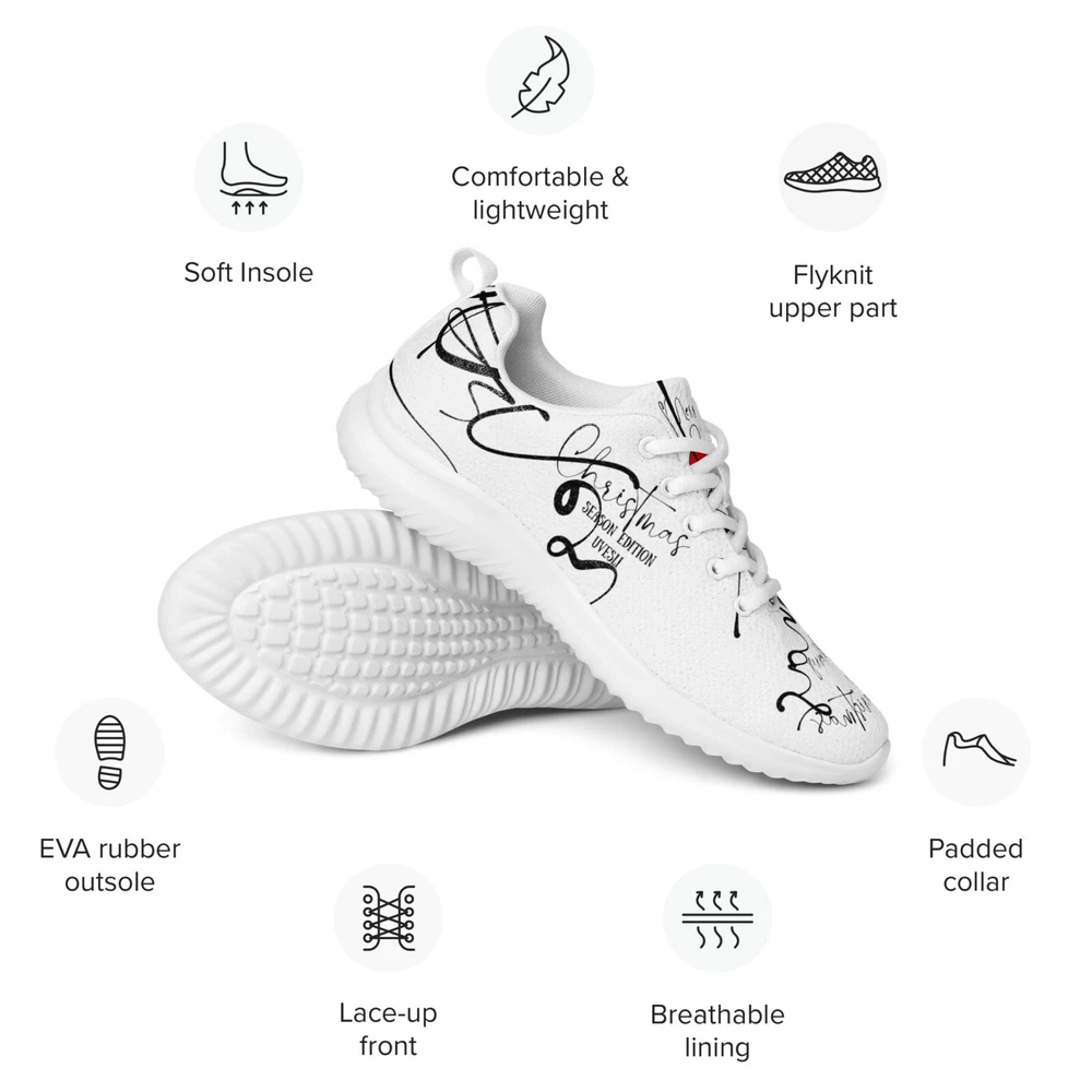 Embrace the festive spirit with UVelsi's Christmas Season Edition Athletic Shoes, a perfect blend of comfort and holiday cheer. These sneakers are designed for both men and women, featuring a sleek white polyester upper that effortlessly complements any seasonal outfit. The mid-top shaft style ensures a secure fit, while the standard shoe width accommodates a variety of foot sizes. Crafted for versatility, these shoes are suitable for a wide range of occasions, from activewear to casual workdays. The durable rubber outsole provides reliable traction for activities such as basketball, running, and gym training, while the padded insole and cotton lining offer all-day comfort. Whether you're hitting the pavement or celebrating the holiday season, these UVelsi sneakers are your go-to choice for style and functionality. Stay active throughout the week with these uniquely-designed athletic shoes. They feature a soft, padded inside for maximum comfort and a rubber outsole for stability. • 100% polyester ultralight flyknit • Ethylene-vinyl acetate (EVA) rubber outsole • Breathable lining • Soft insole and a padded collar • Lace-up front • Soles and laces in matching colors Disclaimers: • The outsole design varies by size. Sizes 37.5 to 40 have a point-like pattern, while sizes 40.5 to 47.5 feature stripes. • A strong glue smell is expected upon the product’s arrival. Allow the shoes to air out for a couple of days and the smell will disappear. Size guide preview (Imperial) US Men UK Europe Japan Foot length Outsole length Insole width 5 5 4 37.5 23 9 ⅛ 10 ½ 3 ⅛ 6 6 5 38.5 24 9 ½ 10 ¾ 3 ¼ 7 7 6 40 25 9 ¾ 11 3 ⅜ 8 8 7 41 26 10 ⅛ 11 ¼ 3 ⅜ 9 9 8 42.5 27 10 ½ 12 3 ⅝ 10 10 9 44 28 10 ¾ 12 ½ 3 ⅝ 11 11 10 45 29 11 ¼ 12 ¾ 3 ¾ 12 12 11 46.5 30 11 ¾ 13 ¼ 3 ⅞ 7.5 7.5 6.5 40.5 25.5 10 11 ¼ 3 ⅜ 8.5 8.5 7.5 42 26.5 10 ¼ 11 ¾ 3 ⅜ 9.5 9.5 8.5 43 27.5 10 ⅝ 12 3 ⅝ Size guide preview (Metric) US Men UK Europe Japan Foot length Outsole length Insole width 5 5 4 37.5 23 23.2 26.7 8 6 6 5 38.5 24 24.1 27.3 8.3 7 7 6 40 25 24.8 28 8.6 8 8 7 41 26 25.7 28.6 8.6 9 9 8 42.5 27 26.7 30.5 9.1 10 10 9 44 28 27.3 31.8 9.1 11 11 10 45 29 28.6 32.4 9.5 12 12 11 46.5 30 29.9 33.7 10 7.5 7.5 6.5 40.5 25.5 25.4 28.6 8.6 8.5 8.5 7.5 42 26.5 26 29.9 8.6 9.5 9.5 8.5 43 27.5 27 30.5 9.1
