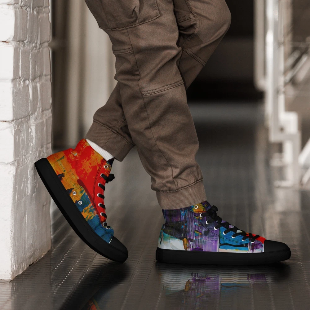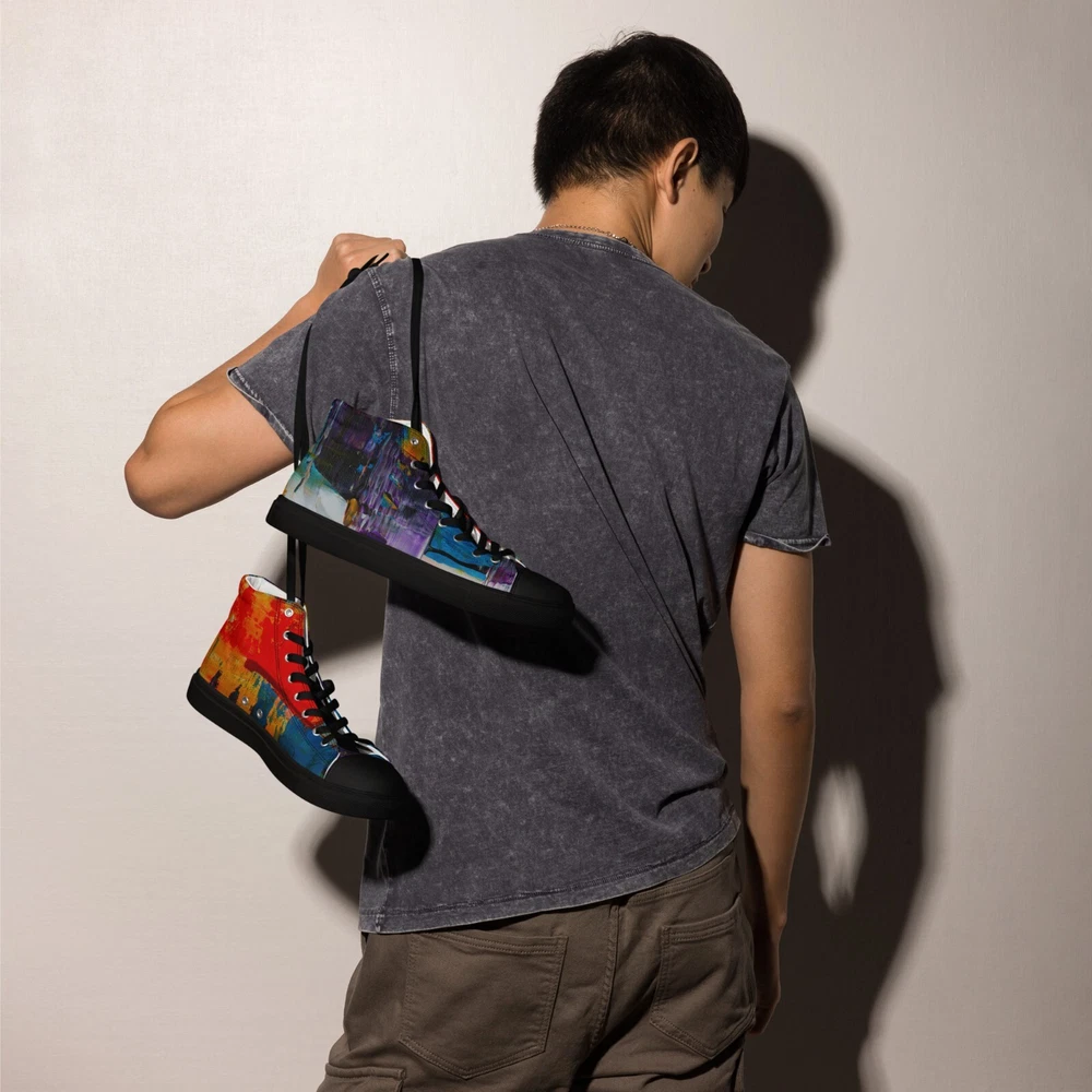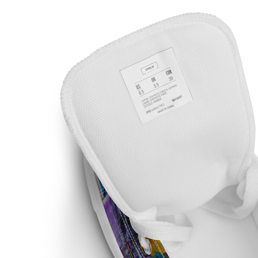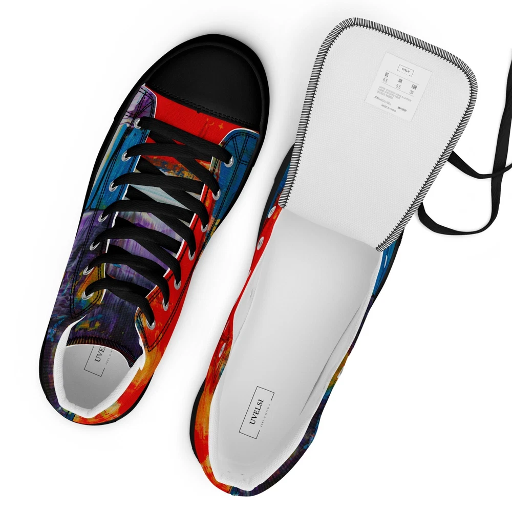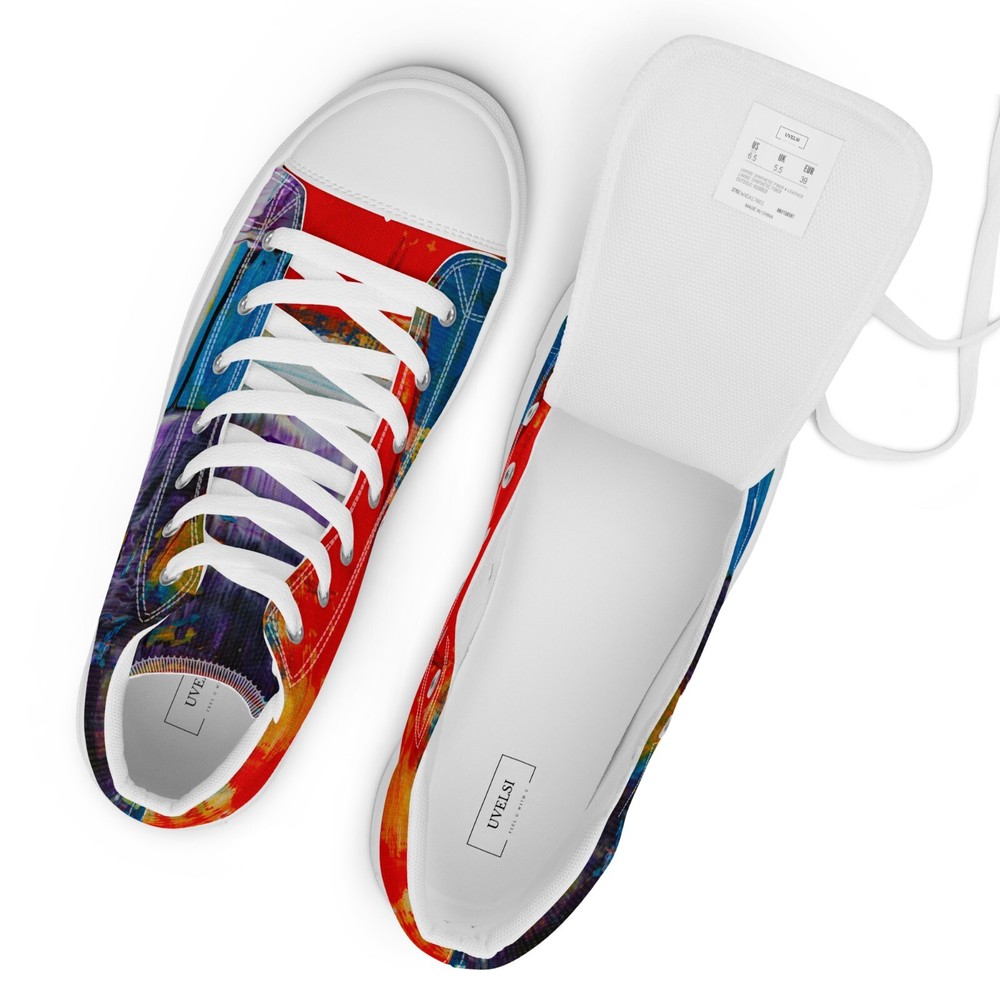 Step into comfort and style with the UVelsi Premium High Top Canvas sneakers. Designed for the modern man, these shoes feature a sleek, lace-up closure and a durable rubber outsole for reliable traction. The breathable canvas upper and lining ensure your feet stay cool and comfortable, whether you're hitting the gym or the streets. High functionality meets fashion with these versatile sneakers, suitable for a wide range of occasions from activewear to casual workwear. Enjoy the convenience of an adjustable strap and a cushioned, padded insole that supports your feet throughout the day. These limited edition sneakers are tailored for perfection, handmade to offer both a unique aesthetic and a personalized fit. Step up your shoe game with the High Top Canvas Shoes. These handmade, trendy shoes are sure to spice up your outfit. Get yours now! • 100% polyester, canvas upper side • Ethylene-vinyl acetate (EVA) rubber outsole • Breathable lining, soft insole • Faux leather toe cap • Padded collar, lace-up front • Soles and laces in matching colors Size guide preview (Imperial) US Men UK Europe Foot Length Japan Outsole Length 5 5 4 37.5 9 ⅛ 23 10 ¼ 6 6 5 38.5 9 ½ 24 10 ⅝ 7 7 6 40 9 ¾ 25 10 ¾ 8 8 7 41 10 ⅛ 26 11 ⅛ 9 9 8 42.5 10 ½ 27 11 ⅝ 10 10 9 44 10 ¾ 28 12.00 11 11 10 45 11 ¼ 29 12 ⅛ 12 12 11 46.5 11 ¾ 30 12 ¾ 13 13 12 47.5 12 31 12 ¾ 5.5 5.5 4.5 38 9 ¼ 23.5 10 ¼ 6.5 6.5 5.5 39 9 ⅝ 24.5 10 ⅝ 7.5 7.5 6.5 40.5 10.00 25.5 11 ⅛ 8.5 8.5 7.5 42 10 ¼ 26.5 11 ⅜ 9.5 9.5 8.5 43 10 ⅝ 27.5 11 ⅝ 10.5 10.5 9.5 44.5 11.00 28.5 12 ⅛ 11.5 11.5 10.5 46 11 ½ 29.5 12 ½ 12.5 12.5 11.5 47 11 ⅞ 30.5 12 ¾ Size guide preview (Metric) US Men UK Europe Foot Length Japan Outsole Length 5 5 4 37.5 23.2 23 26.2 6 6 5 38.5 24.1 24 27 7 7 6 40 24.8 25 27.3 8 8 7 41 25.7 26 28.3 9 9 8 42.5 26.7 27 29.5 10 10 9 44 27.3 28 30.5 11 11 10 45 28.6 29 30.8 12 12 11 46.5 29.9 30 32.4 13 13 12 47.5 30.6 31 32.4 5.5 5.5 4.5 38 23.5 23.5 26.2 6.5 6.5 5.5 39 24.5 24.5 27 7.5 7.5 6.5 40.5 25.4 25.5 28.3 8.5 8.5 7.5 42 26 26.5 29 9.5 9.5 8.5 43 27 27.5 29.5 10.5 10.5 9.5 44.5 28 28.5 30.8 11.5 11.5 10.5 46 29.2 29.5 31.8 12.5 12.5 11.5 47 30.2 30.5 32.4