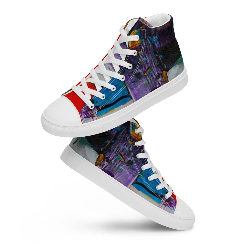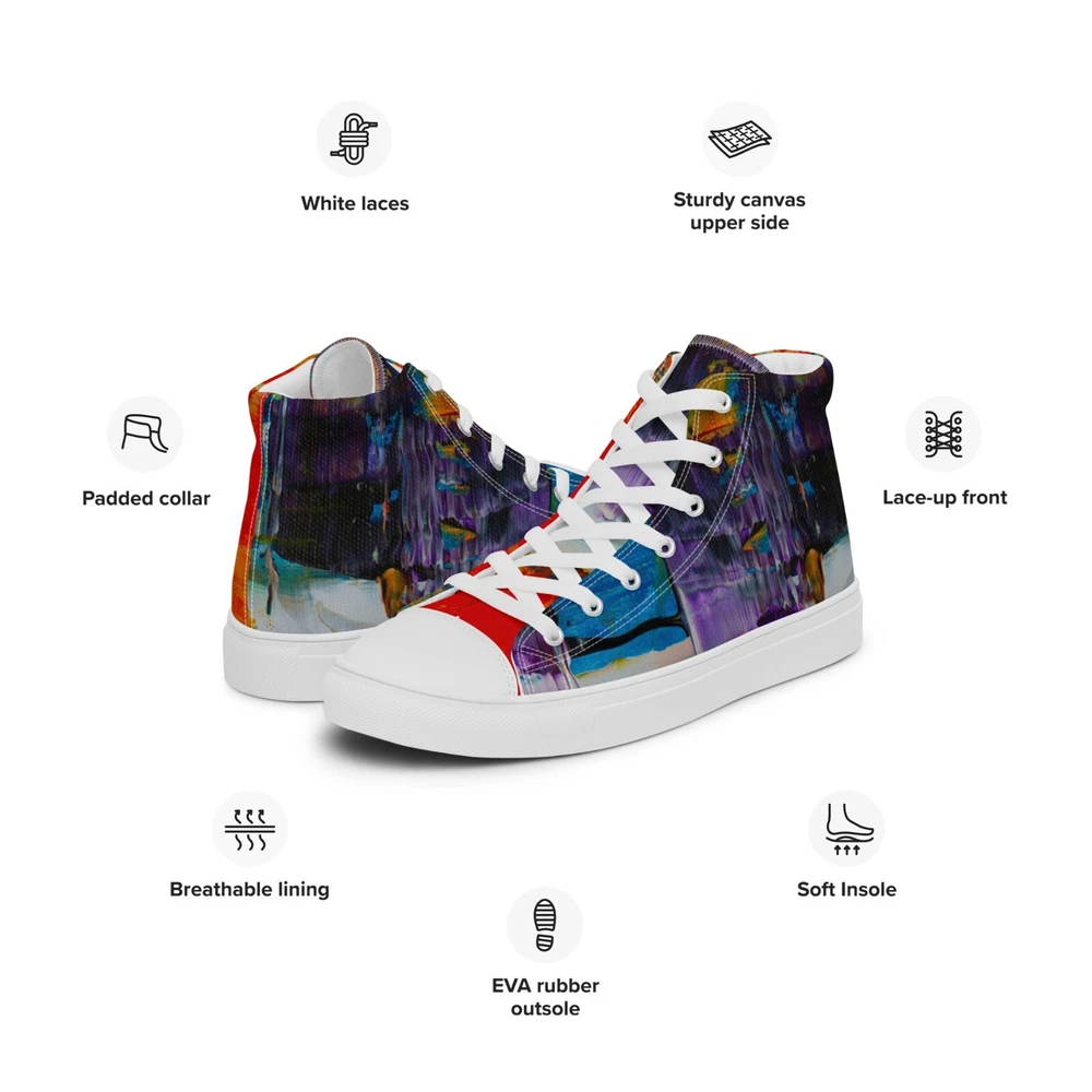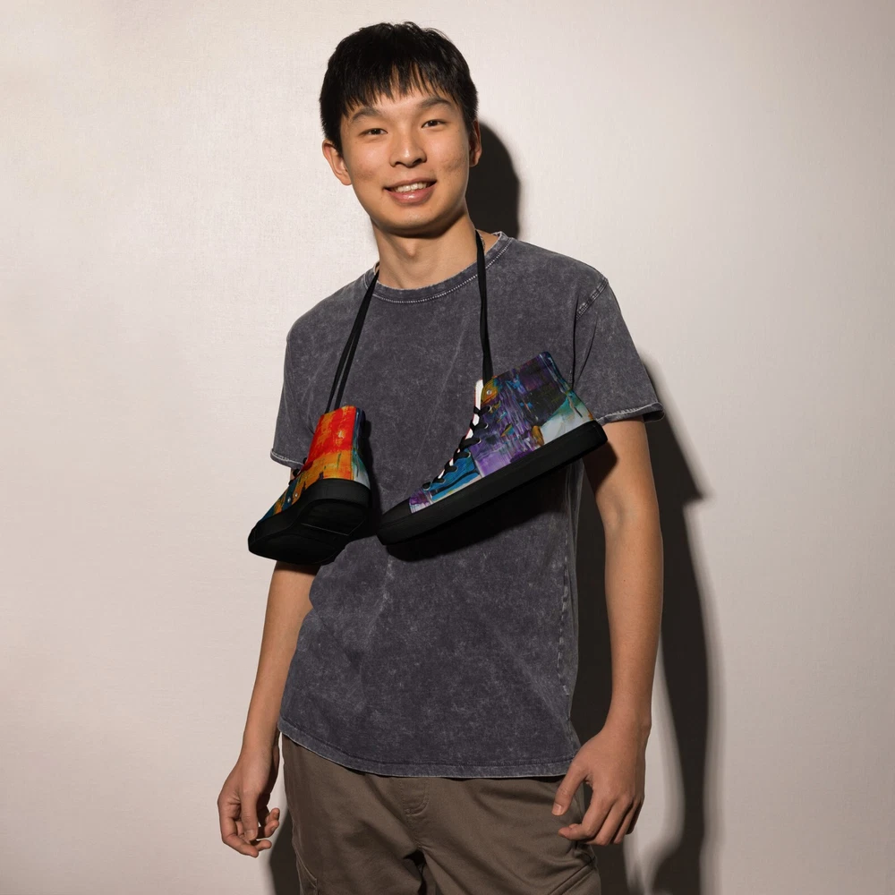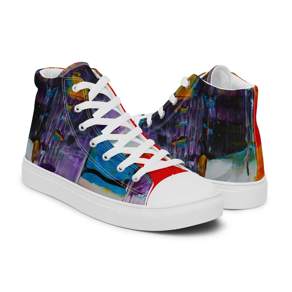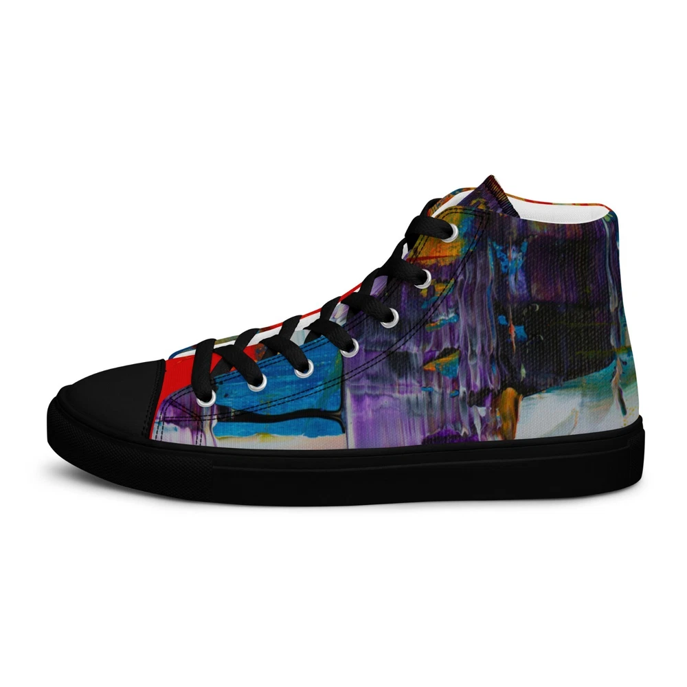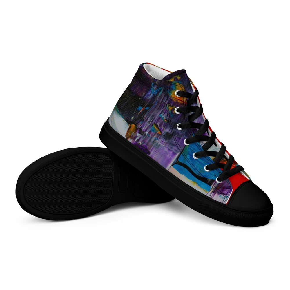 Step into comfort and style with the UVelsi Premium High Top Canvas sneakers. Designed for the modern man, these shoes feature a sleek, lace-up closure and a durable rubber outsole for reliable traction. The breathable canvas upper and lining ensure your feet stay cool and comfortable, whether you're hitting the gym or the streets. High functionality meets fashion with these versatile sneakers, suitable for a wide range of occasions from activewear to casual workwear. Enjoy the convenience of an adjustable strap and a cushioned, padded insole that supports your feet throughout the day. These limited edition sneakers are tailored for perfection, handmade to offer both a unique aesthetic and a personalized fit. Step up your shoe game with the High Top Canvas Shoes. These handmade, trendy shoes are sure to spice up your outfit. Get yours now! • 100% polyester, canvas upper side • Ethylene-vinyl acetate (EVA) rubber outsole • Breathable lining, soft insole • Faux leather toe cap • Padded collar, lace-up front • Soles and laces in matching colors Size guide preview (Imperial) US Men UK Europe Foot Length Japan Outsole Length 5 5 4 37.5 9 ⅛ 23 10 ¼ 6 6 5 38.5 9 ½ 24 10 ⅝ 7 7 6 40 9 ¾ 25 10 ¾ 8 8 7 41 10 ⅛ 26 11 ⅛ 9 9 8 42.5 10 ½ 27 11 ⅝ 10 10 9 44 10 ¾ 28 12.00 11 11 10 45 11 ¼ 29 12 ⅛ 12 12 11 46.5 11 ¾ 30 12 ¾ 13 13 12 47.5 12 31 12 ¾ 5.5 5.5 4.5 38 9 ¼ 23.5 10 ¼ 6.5 6.5 5.5 39 9 ⅝ 24.5 10 ⅝ 7.5 7.5 6.5 40.5 10.00 25.5 11 ⅛ 8.5 8.5 7.5 42 10 ¼ 26.5 11 ⅜ 9.5 9.5 8.5 43 10 ⅝ 27.5 11 ⅝ 10.5 10.5 9.5 44.5 11.00 28.5 12 ⅛ 11.5 11.5 10.5 46 11 ½ 29.5 12 ½ 12.5 12.5 11.5 47 11 ⅞ 30.5 12 ¾ Size guide preview (Metric) US Men UK Europe Foot Length Japan Outsole Length 5 5 4 37.5 23.2 23 26.2 6 6 5 38.5 24.1 24 27 7 7 6 40 24.8 25 27.3 8 8 7 41 25.7 26 28.3 9 9 8 42.5 26.7 27 29.5 10 10 9 44 27.3 28 30.5 11 11 10 45 28.6 29 30.8 12 12 11 46.5 29.9 30 32.4 13 13 12 47.5 30.6 31 32.4 5.5 5.5 4.5 38 23.5 23.5 26.2 6.5 6.5 5.5 39 24.5 24.5 27 7.5 7.5 6.5 40.5 25.4 25.5 28.3 8.5 8.5 7.5 42 26 26.5 29 9.5 9.5 8.5 43 27 27.5 29.5 10.5 10.5 9.5 44.5 28 28.5 30.8 11.5 11.5 10.5 46 29.2 29.5 31.8 12.5 12.5 11.5 47 30.2 30.5 32.4