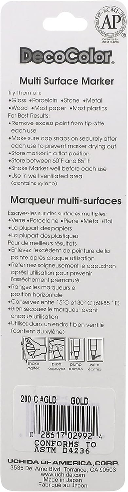 This fine point paint marker is great for writing and detail drawings on glass, paper, wood, clay, porcelain, stone, metal and mirrors The paint is opaque and xylem based Its oil based formula allows for a gloss finish to any project It is acid free, lead free, lightfast, weatherproof and pigmented Great for crafting, home and office use; available in gold color This Deco Color fine point paint marker is great for writing and detail drawings on glass, paper, wood, clay, porcelain, stone, metal and mirrors. The paint is opaque and xylem based. Its oil based formula allows for a gloss finish to any project. It is acid free, lead free, lightfast, weatherproof and pigmented. Great for crafting, home and office use. Available in gold color. This conforms to ASTM D4236 standard and comes in carded packing. Measures 1/4-inch length by 2-1/8-inch width by 7-1/4-inch height.
