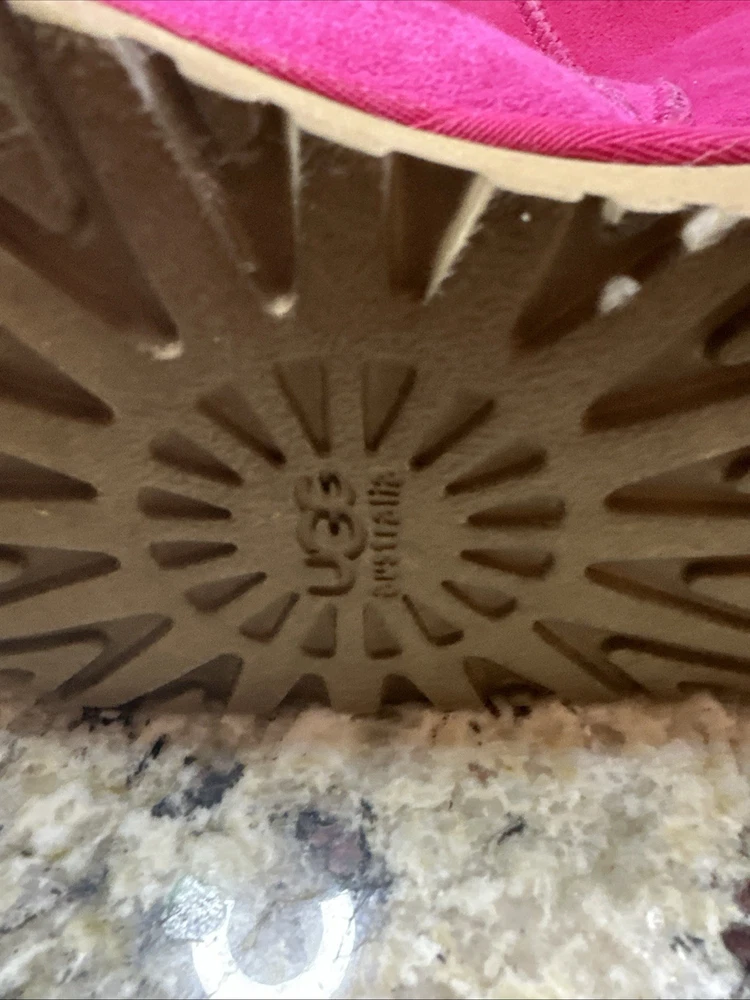 The Ugg Australia Bailey Bow Boot in Cerise (Hot Pink), Size 6 is a stylish and cozy option for young girls. This slip-on boot features a low heel, fur trim, and a cute bow accent, making it perfect for casual occasions during the winter season. Made with a shearling style design, sheepskin lining, and a rubber outsole, these boots offer both comfort and durability. The pink color adds a fun pop to any outfit, while the mid-top shaft style provides ankle coverage and support. Perfect for colder weather and adding a touch of glam to any look.