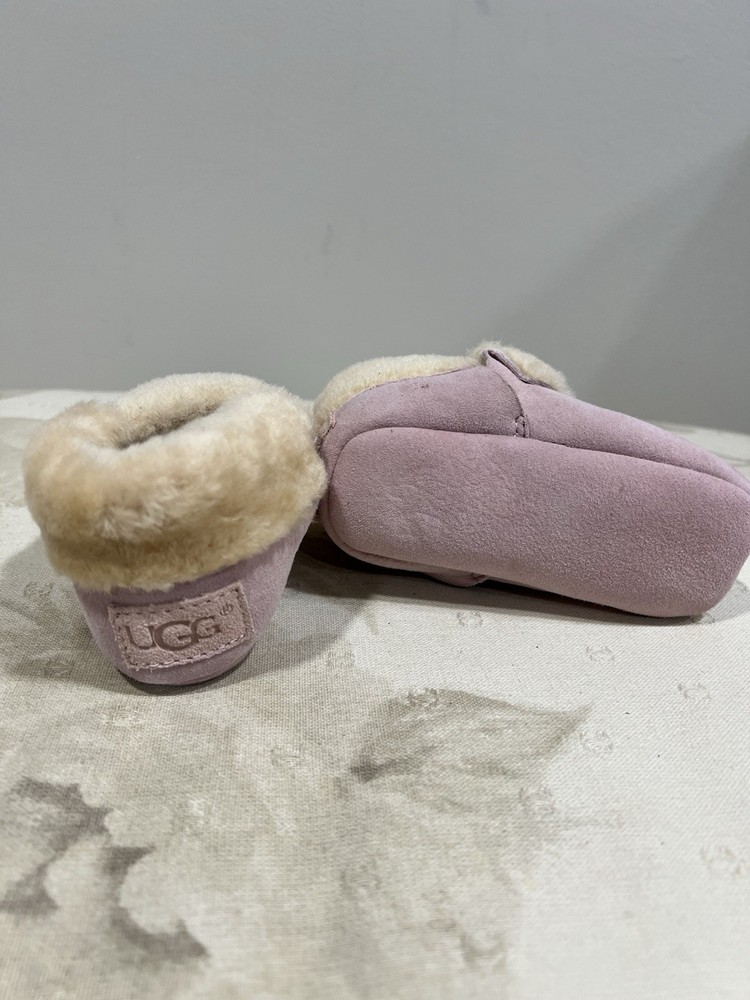 Step into cozy comfort with these UGG Classic pink booties, perfect for your little one's winter wardrobe. Crafted with luxurious suede uppers and soft fur lining, these booties are designed to keep tiny feet warm and snug. The convenient pull-on closure makes them easy to slip on and off, ideal for the hustle and bustle of daily activities. These adorable booties feature a durable suede outsole for steady traction and are accented with the signature UGG logo for a touch of style. With their versatile pink hue, they're a charming addition to any outfit, whether it's for a stroll in the park or just cuddling at home. Size 4 US, 4.5 UK, and 4.5 AU ensure a perfect fit for your baby's growing feet.