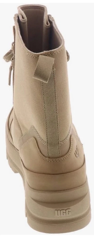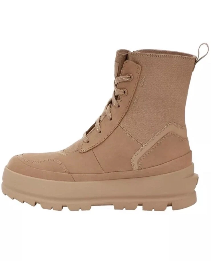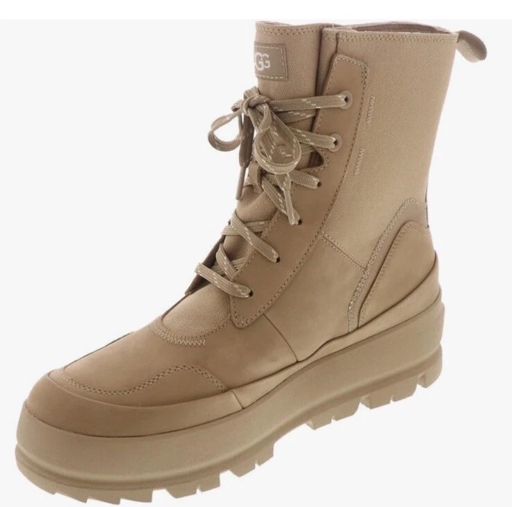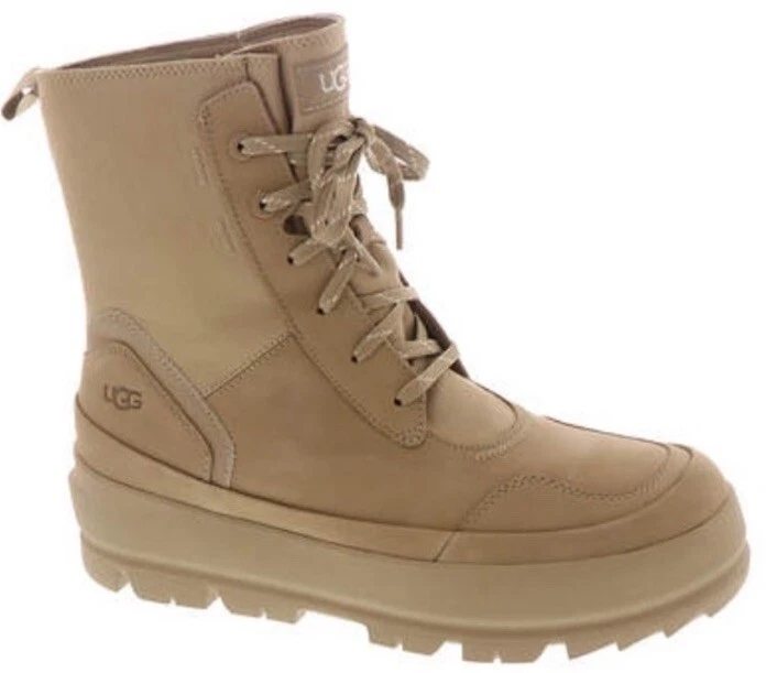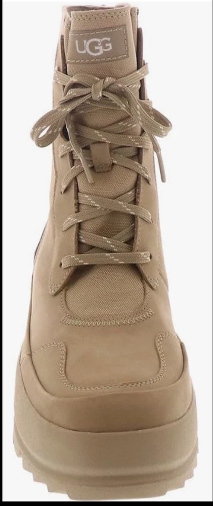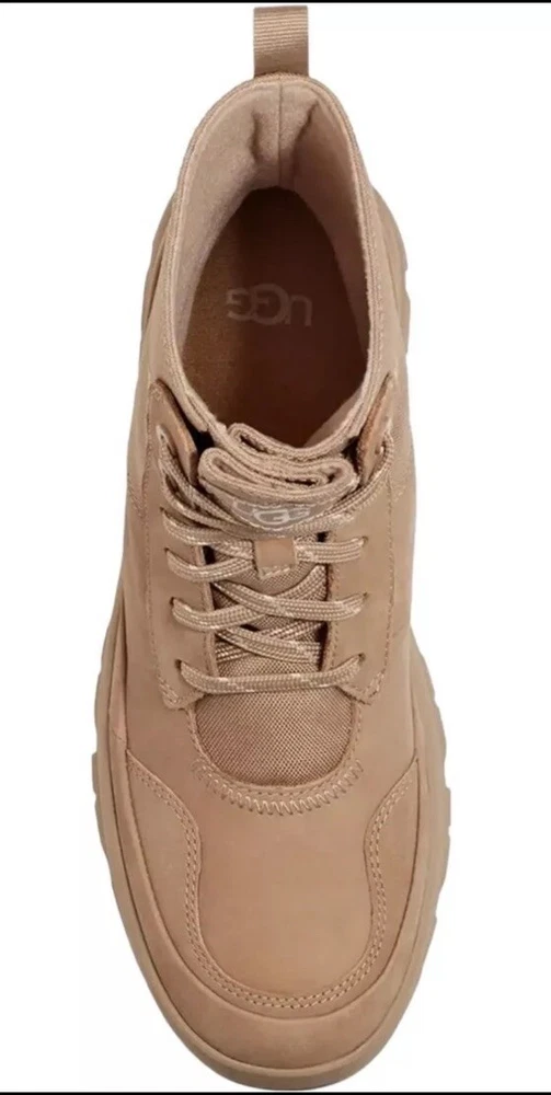 Elevate your shoe collection with these UGG The Ugg Lug Waterproof Sneaker Boots in Sand. Designed for women with a US shoe size of 9.5 and a medium shoe width, these boots are perfect for any occasion whether it's for activewear, casual wear, workwear or hiking. The lace-up closure and closed-toe design make them comfortable and stylish. These boots feature a waterproof polyester upper material and a mid-height heel for added comfort. The beige color and solid pattern make them versatile and easy to pair with any outfit. Made in Australia, these boots are perfect for any season, whether it's winter, summer, fall, or spring.