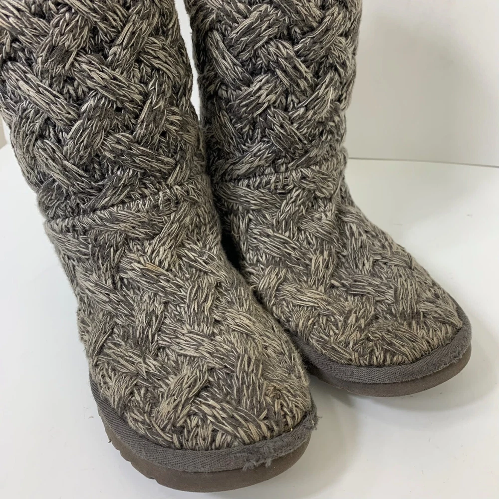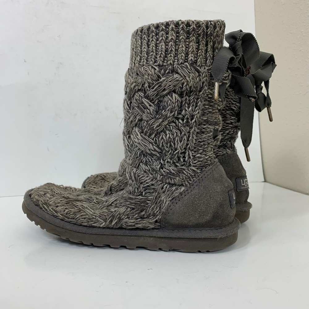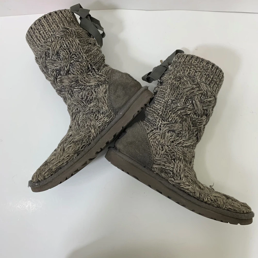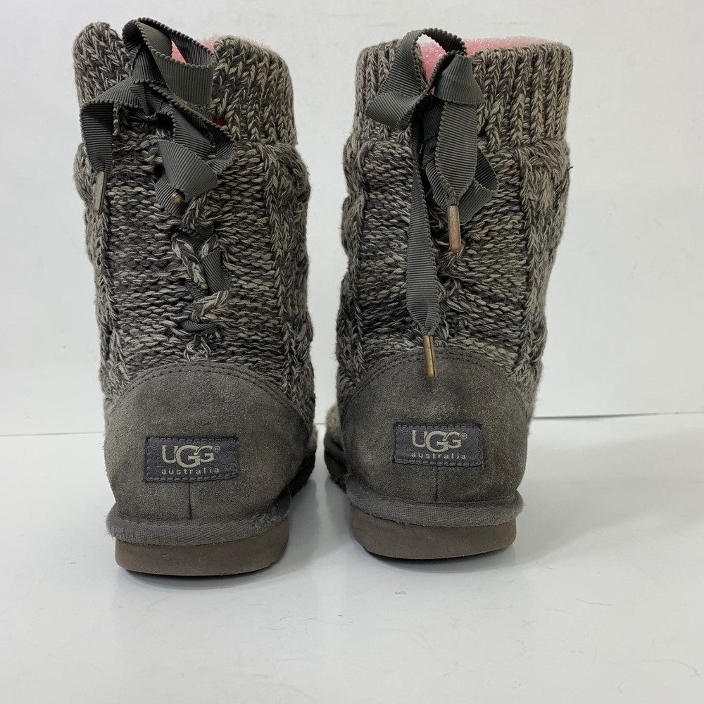 Ugg Women’s Isla Knit Sweater Boots in Gray - Size 6 Great preowned condition! Cotton knit and suede 8 ¾” shaft height Functional grosgrain lace Nylon binding UGGpure™ insole Molded EVA outsole 2P45 17-5204 1 lb 3 oz Tags: casual, comfy, warm, winter,