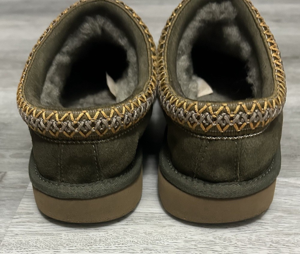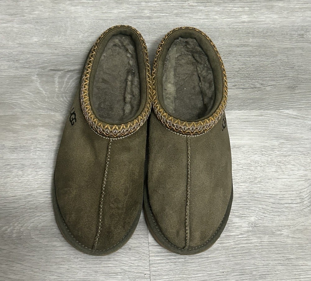 The product is a pair of UGG Tasman slippers in size 8.5 for men. These classic green slip-ons feature a flat heel, wool lining, and suede upper material. With a solid pattern and a standard shoe width, these lined slippers are perfect for lounging around the house in comfort and style. The UGG brand is known for quality and this model is no exception, making it a great choice for any man looking for a cozy and fashionable slipper option.