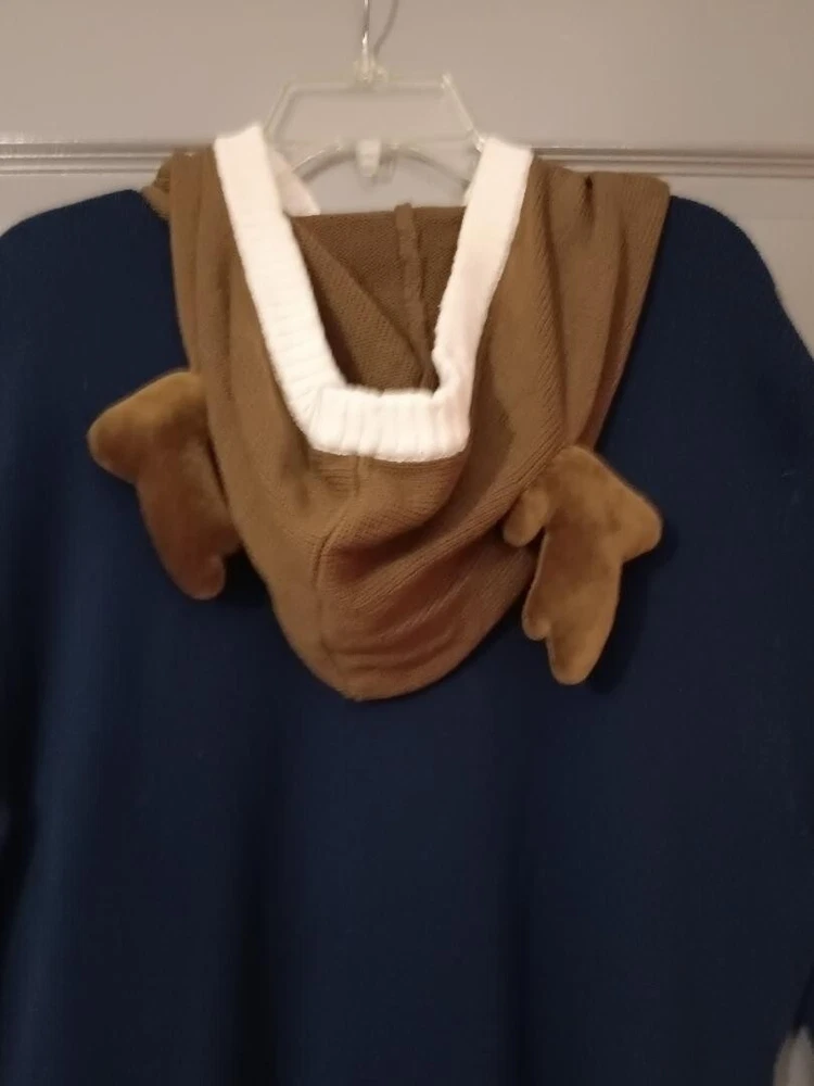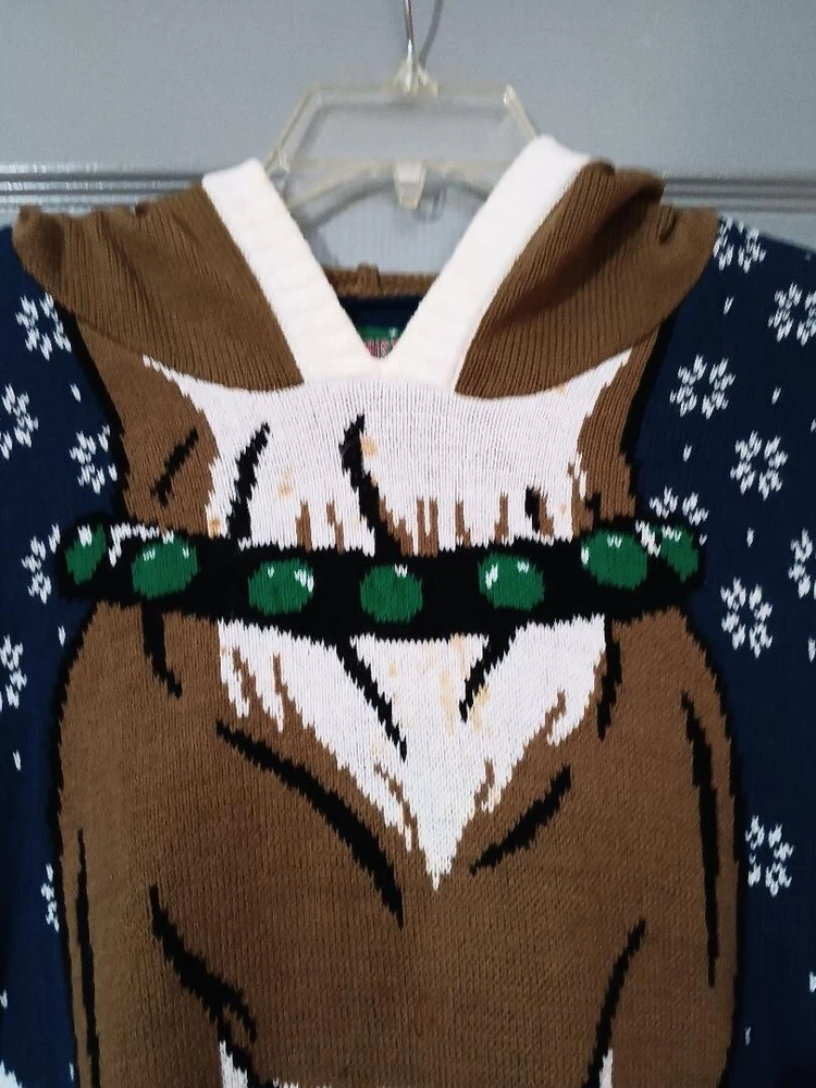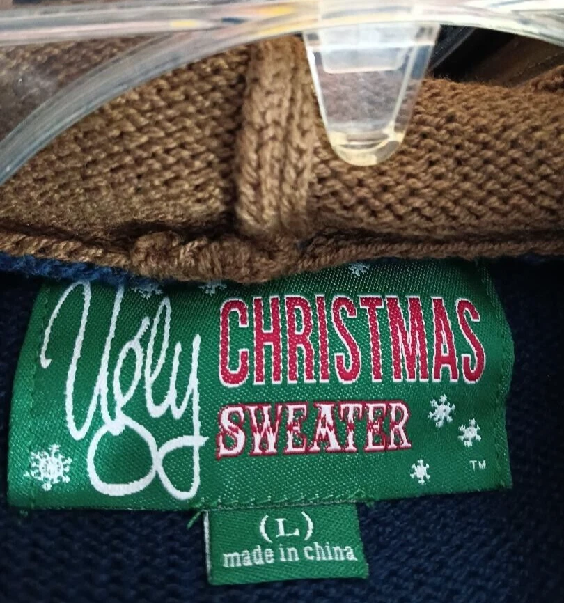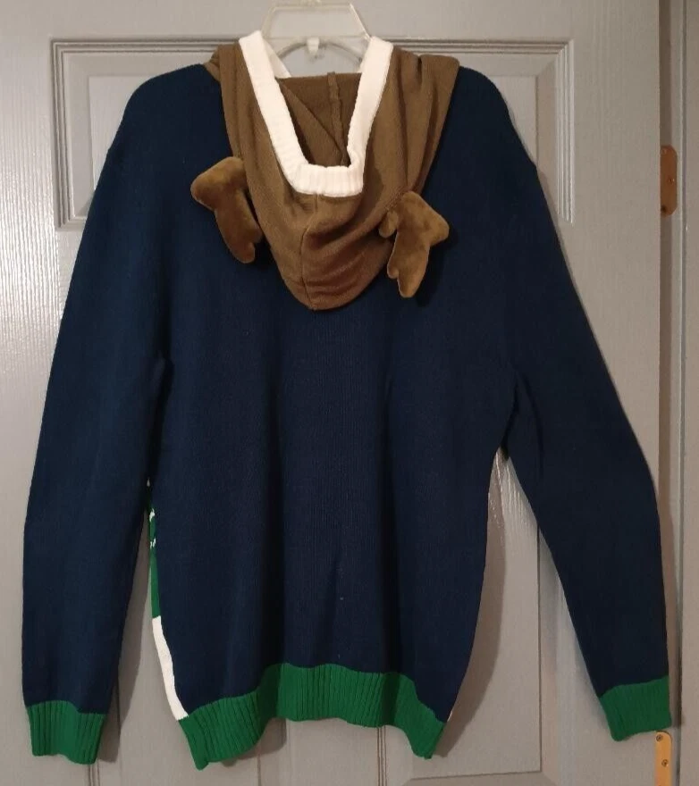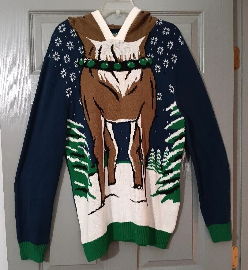 From the Ugly Christmas Sweater company, this is a pull-over sweater size large reindeer sweater. This sweater transforms you into one of Santa's reindeer when you put the horned hood on! Great color. Long-sleeve.
