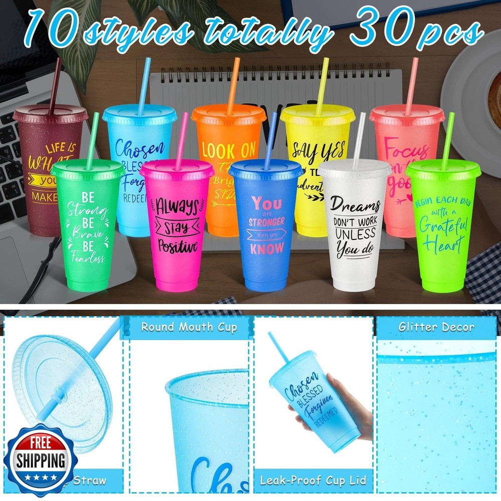 Uiifan 30 Pcs 24oz Inspirational Appreciation Gifts Cups Bulk for Teachers Women Men Employee, Motivational Positive Encouragement Team Gifts for Volunteer Staff Coworker Students (Vibrant Color) Features Package Included: each package includes 30 inspirational tumblers; There are 10 different motivational statements; This package allows you to have multiple tumblers for personal use, sharing with family and friends, or even for events and parties; You'll always have a tumbler on hand when you need it Quality Material: made from durable PP material, these motivational plastic tumblers are built to withstand daily use; The sturdy construction ensures they are resistant to leak, and break, providing you with a reliable and long lasting solution Convenient Size and Capacity: with dimensions of about 6.81 x 4.17 x 2.36 inches/ 17.3 x 10.6 x 6 cm, these inspirational coffee cups are designed to be compact and portable; They can easily fit into your bag, backpack, or cup holder, making them ideal for daily use; Additionally, they have a generous capacity of about 24 oz; Our cup lid is a top and bottom snap-in slot lid; It is not like a threaded lid, which can be screwed on; It is tricky and needs to be pressed from both sides to the middle Inspiring Design for Daily Motivation: these travel mug cups feature inspiring text that adds a touch of motivation to your day; With uplifting words printed on them, these cups serve as a constant reminder to stay focused and motivated, helping you maintain a positive mindset throughout the day Versatile Use for Various Occasions: these inspirational plastic cups are suitable for a wide range of occasions and environments; Whether you're at home, at the gym, or outdoors, these cups are designed to meet your drinking needs; They are suitable for water, juices, or other beverages of your choice Shipping Free & Fast Shipping: We offer free shipping to most of the USA with a normal delivery time of 3-7 days. However, due to the current situation, additional delivery time (up to 3 weeks) may be required for some items. Alternative Carriers: We may use alternative carriers (e.g., USPS, FedEx, UPS) to ensure your package arrives safely and on time. Due to the use of multiple carriers, we are unable to provide a tracking number automatically. Handling Time: Orders are processed and shipped within 1-2 business days of receiving cleared payment. Shipping Restrictions: Shipping to Alaska, Hawaii, Puerto Rico, Guam, and other US territories may incur shipping charges or delivery restrictions. Please contact us before ordering, or your order can be refunded/cancelled. State Restrictions: Certain items may not be shipped to California due to state regulations. Contact for Tracking Updates: If you require tracking updates or have any concerns about the delivery of your order, please feel free to contact us, and we will be happy to assist you. Return Policy 30-Day Hassle-Free Returns: If you are not completely satisfied with your purchase, you can return the item for free within 30 days of receiving it for a full refund or exchange. Easy Return Process: Contact us, and we will provide you with a prepaid return shipping label and detailed instructions. No Restocking Fee: There are no restocking fees for returns. However, the buyer is responsible for return shipping costs if the return is not due to a seller"s error. Refund Processing: Refunds will be processed within 1 business day of receiving the returned item in its original condition. Feedback Your feedback is extremely important to us. We strive to provide the best products and customer service possible. If you are satisfied with your purchase, please take a moment to leave us a positive review. If you have any concerns or issues with your order, please contact us before leaving negative feedback. We are committed to resolving any problems and ensuring your satisfaction. Contact Us If you have any questions or concerns, please feel free to reach out to our customer support team. You can contact us through the eBay messaging system. We are available Monday to Friday, 9:00 am to 5:00 pm EST, and we will do our best to respond to your inquiry within 24 hours. Thank you for supporting our small family business!