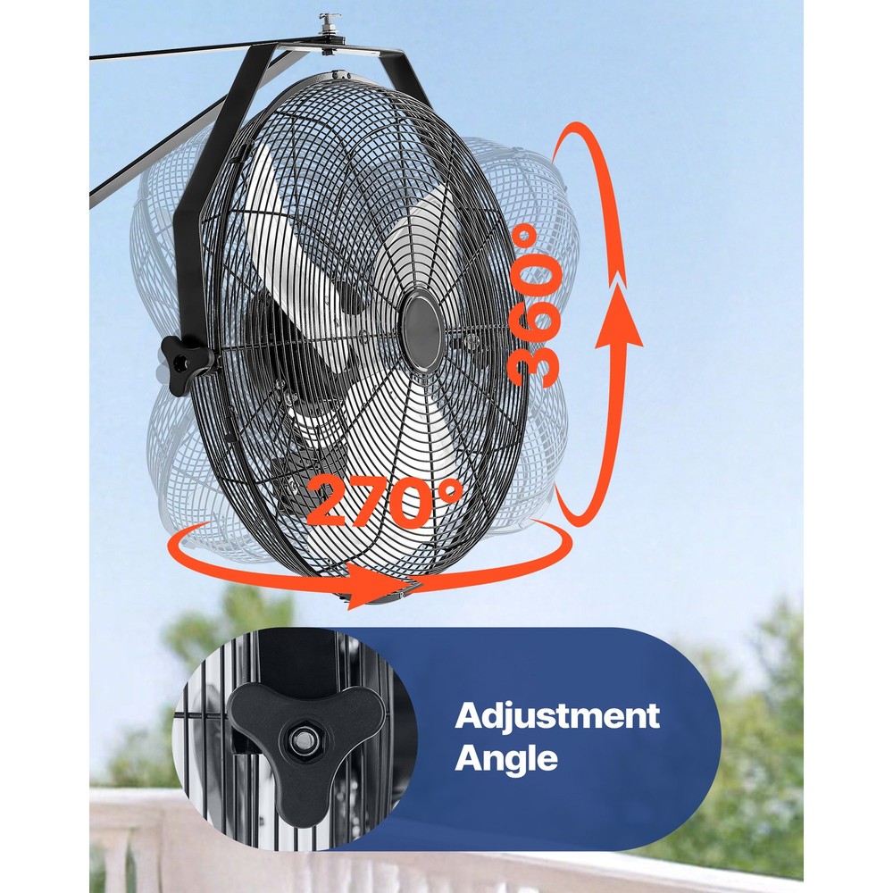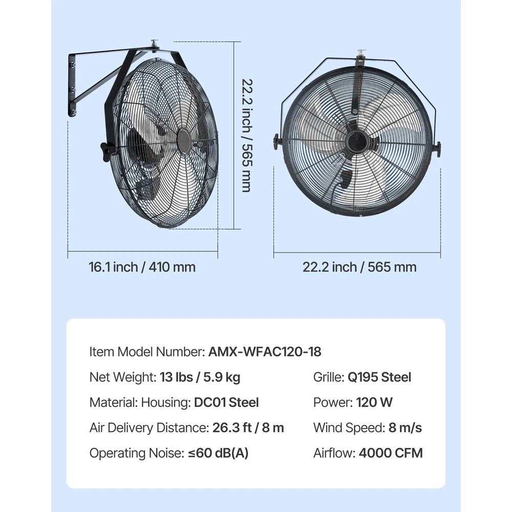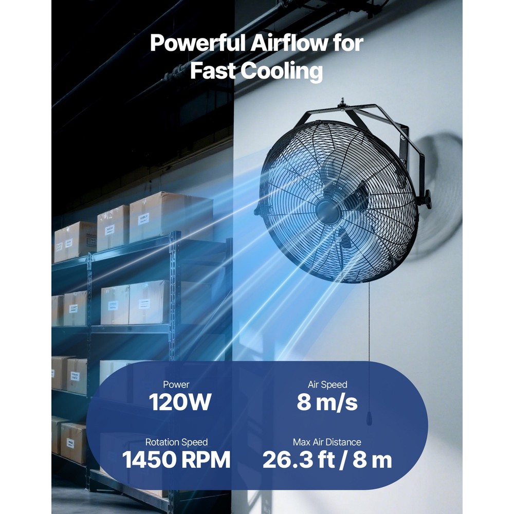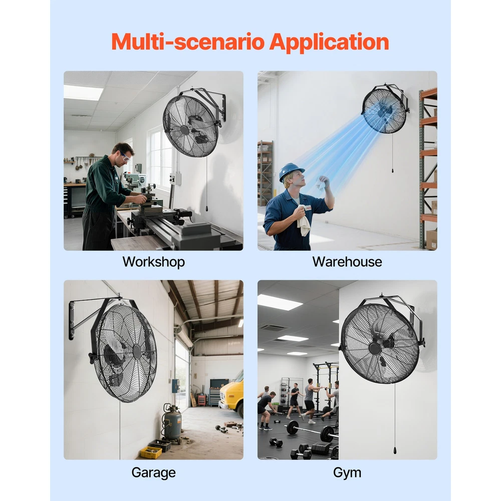 Stay Cool and Comfortable Feeling uncomfortable in a warm garage or workspace? This heavy-duty wall-mounted fan provides strong airflow to cool down your area quickly. Designed to be mounted on the wall, it helps conserve floor space while efficiently ventilating and cooling expansive spaces. Fully Adjustable Airflow with 360° Rotation Extended Range Air Transport High-Performance Motor Workspace Storage Facility Workshop Outdoor Space Step 1 Step 2 Step 3 Various Choices to Suit Your Needs Q1: Is this wall-mounted fan waterproof? A1: These models are not waterproof. We do not recommend using them in fully open outdoor areas. If used in a semi-open area, please install a barrier or shield to protect against water ingress that may cause damage. Q2: Is the fan loud during operation? A2: At its lowest speed setting, the fan produces a noise level of 55 dB(A) when measured at close range. For a quieter experience, we recommend using the fan in open or well-ventilated areas to reduce perceived noise. Q3: What type of wall can the fan be mounted on? A3: The fan must be installed on a solid concrete wall. It is not suitable for mounting on wooden patios or drywall. Features & Details Powerful Air Circulation for Quick Cooling: This industrial wall-mounted fan generates robust airflow, effectively reducing temperatures and reaching distances of up to 26.3 ft (8 m). Perfect for use in workshops, storage facilities, heated kitchens, and other challenging environments. Versatile Application: This wall-mounted fan is designed with a compact hanging structure, making it ideal for installation in patios, garages, workshops, factories, and other spaces, providing adaptable cooling solutions for different environments. Customizable Airflow Control: This wall-mounted industrial fan offers a 270° horizontal rotation and a full 360° vertical adjustment, enabling precise air circulation to cover expansive areas effectively. Adjustable 3-Speed Wall Fan: Designed for flexible cooling, this wall-mounted fan provides three speed options, delivering airflow up to 4000 CFM to suit varying seasonal and environmental requirements. Durable All-Metal Design: Built for lasting performance, this wall-mounted fan is equipped with aluminum blades, a steel grille with a powder-coated finish, a robust metal bracket, and a convenient pull-cord mechanism for effortless operation. SHIPPING ABOUT US PAYMENT RETURNS CONTACT WARRANTY Welcome to our eBay store. As a leading and emerging company in manufacturer and exporting business, we are specialized in Business and Industrial Products, Sporting Goods, Pet Products, Home and Garden products for more than 10 years. We believe that it is our vision and mission to provide innovative products with best service and competitive price to satisfy you. Our goal is to make sure that you can find exactly what you are looking for and make it easy for you to place your orders. We accept PayPal payment,PayPal Credit,Credit card or debit card and so on. Payment should be completed within 4 (Four) days of auction closing. Or unpaid dispute will be filed for closing auction. We will leave a positive feedback immediately after payment is received. We appreciate a positive feedback as much as you do. If for some reason there is any issue with the purchase, please contact us prior to leaving feedback, we will be glad to work together and provide a satisfying solution. Please be aware that PO Box cannot receive items, please DO NOT fill in the PO Box address. DELIVERY DAYS: 3-7 BUSINESS DAYS 3 BUSINESS DAYS SHIPPING OUT SHIP FROM CA & TX & NJ & GA & NC &OR WAREHOUSE California Warehouse: City of Industry, CA Texas Warehouse : Houston, TX New Jersey Warehouse : Perth Amboy, NJ New York State Warehouse: Perth Amboy, NJ Georgia Warehouse: Austell,GA North Carolina Warehouse: Grove NC Oregon Warehouse: AIRPORT WAY Portland,OR All of our items are backed with a 30-day return policy. We ensure all our items are new and in excellent condition prior to shipping. In case you receive the item that is not to the standards above, please contact us via e-Bay messages. All returns must be in new original condition as received and should be shipped with delivery confirmation Please note that all returns must be pre-approved by us. Unauthorized returns will not be accepted. If you need to return, please check twice to confirm the item not work and contact our customer service representative, let us know the detailed problem and send us some pictures for confirmation. We ONLY accept returns with original package. Please make sure that item has NO man-made sabotage. Used items will not be accepted for return. Email Customer Support: 9:00am-2:00am PST Sunday-Friday All emails will be responded to within 12-24 hours This item comes with 12 months Warranty from the date of customers purchased it. Special circumstances will be listed clearly in the listing. If your item has been damaged in transit or become faulty in warranty period, please email us with pictures or video to show the problem. Please do check everything carefully after you received the parcel, any the damage except DOA (Dead-On-Arrival) would not be covered if it's your fault. Replacement products are provided with the same warranty as the returned products. Stay Cool and Comfortable Feeling uncomfortable in a warm garage or workspace? This heavy-duty wall-mounted fan provides strong airflow to cool down your area quickly. Designed to be mounted on the wall, it helps conserve floor space while efficiently ventilating and cooling expansive spaces. Fully Adjustable Airflow with 360° Rotation Extended Range Air Transport High-Performance Motor Workspace Storage Facility Workshop Outdoor Space Step 1 Step 2 Step 3 Various Choices to Suit Your Needs Q1: Is this wall-mounted fan waterproof? A1: These models are not waterproof. We do not recommend using them in fully open outdoor areas. If used in a semi-open area, please install a barrier or shield to prot