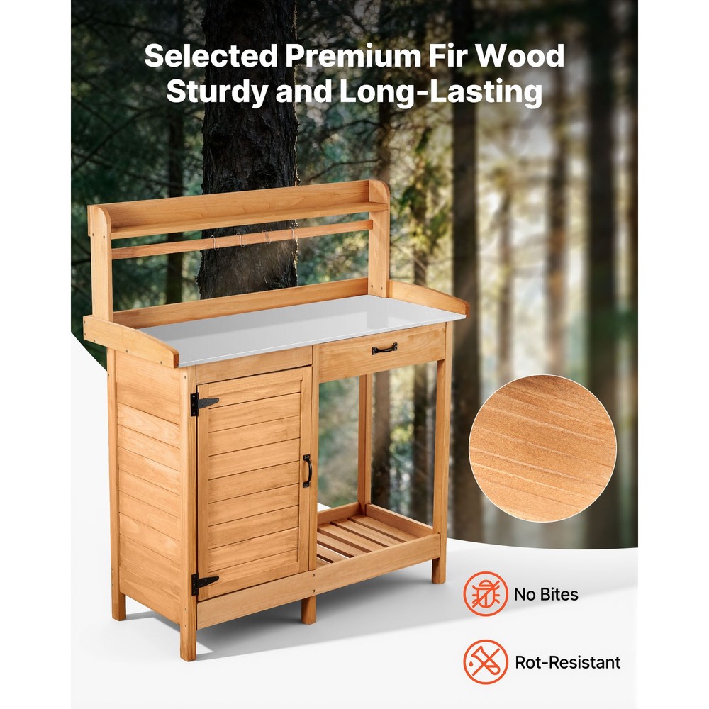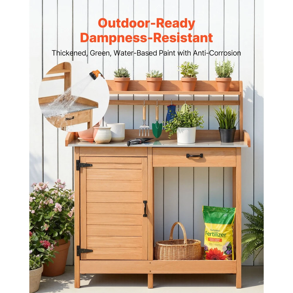 Versatile 3-in-1 Gardening Workstation This gardening workstation is an excellent tool for your planting needs. It offers a raised surface for tasks such as watering, trimming, fertilizing, and planting. Its elevated design allows you to work comfortably while standing, reducing strain on your back and knees. Constructed from high-quality fir wood, this potting bench table is designed to resist decay and insect damage, ensuring reliable and lasting performance for your gardening needs. This outdoor potting bench is designed for convenience and organization. The top shelf is ideal for showcasing small potted plants, while the drawer provides a handy space for storing smaller tools. Larger tools and gardening supplies can be neatly stored in the cabinet and on the bottom shelf. Additionally, four hooks are included to keep items like towels, gloves, and other necessities easily accessible. This potting bench is a versatile addition to your garden or patio, functioning as a convenient workstation for caring for your plants. It can also double as a preparation area for organizing ingredients and beverages during barbecue gatherings. This gardening table comes with a screwdriver and an easy-to-follow instruction manual, allowing you to assemble it step by step in approximately 20 to 30 minutes. Features & Details Elevated Gardening Workspace: This raised gardening bench offers a convenient height for tasks like watering, pruning, fertilizing, and planting. It enables you to work comfortably while standing upright, minimizing strain on your back. Durable and Reliable: Constructed from high-quality fir wood, this potting bench is designed to resist decay and ensure longevity. Its wooden surface is treated with a robust water-based coating, offering protection against moisture when used outdoors. Durable Galvanized Metal Surface: This outdoor gardening bench features a water-resistant and rustproof metal tabletop that is easy to clean. Designed for long-term use, it can handle heavy tools and daily gardening tasks effortlessly. Generous Storage Options: This gardening workstation is designed with a top shelf for displaying small plants, a convenient drawer for organizing hand tools, and a spacious cabinet with a lower shelf to accommodate larger gardening supplies and fertilizers. Additionally, it includes four hooks for hanging essentials such as towels. Versatile Usage: This gardening table serves as a practical workstation for planting and caring for your greenery in the garden or patio, while also functioning as a convenient prep station for barbecues—perfect for organizing ingredients and beverages. SHIPPING ABOUT US PAYMENT RETURNS CONTACT WARRANTY Welcome to our eBay store. As a leading and emerging company in manufacturer and exporting business, we are specialized in Business and Industrial Products, Sporting Goods, Pet Products, Home and Garden products for more than 10 years. We believe that it is our vision and mission to provide innovative products with best service and competitive price to satisfy you. Our goal is to make sure that you can find exactly what you are looking for and make it easy for you to place your orders. We accept PayPal payment,PayPal Credit,Credit card or debit card and so on. Payment should be completed within 4 (Four) days of auction closing. Or unpaid dispute will be filed for closing auction. We will leave a positive feedback immediately after payment is received. We appreciate a positive feedback as much as you do. If for some reason there is any issue with the purchase, please contact us prior to leaving feedback, we will be glad to work together and provide a satisfying solution. Please be aware that PO Box cannot receive items, please DO NOT fill in the PO Box address. DELIVERY DAYS: 3-7 BUSINESS DAYS 3 BUSINESS DAYS SHIPPING OUT SHIP FROM CA & TX & NJ & GA & NC &OR WAREHOUSE California Warehouse: City of Industry, CA Texas Warehouse : Houston, TX New Jersey Warehouse : Perth Amboy, NJ New York State Warehouse: Perth Amboy, NJ Georgia Warehouse: Austell,GA North Carolina Warehouse: Grove NC Oregon Warehouse: AIRPORT WAY Portland,OR All of our items are backed with a 30-day return policy. We ensure all our items are new and in excellent condition prior to shipping. In case you receive the item that is not to the standards above, please contact us via e-Bay messages. All returns must be in new original condition as received and should be shipped with delivery confirmation Please note that all returns must be pre-approved by us. Unauthorized returns will not be accepted. If you need to return, please check twice to confirm the item not work and contact our customer service representative, let us know the detailed problem and send us some pictures for confirmation. We ONLY accept returns with original package. Please make sure that item has NO man-made sabotage. Used items will not be accepted for return. Email Customer Support: 9:00am-2:00am PST Sunday-Friday All emails will be responded to within 12-24 hours This item comes with 12 months Warranty from the date of customers purchased it. Special circumstances will be listed clearly in the listing. If your item has been damaged in transit or become faulty in warranty period, please email us with pictures or video to show the problem. Please do check everything carefully after you received the parcel, any the damage except DOA (Dead-On-Arrival) would not be covered if it's your fault. Replacement products are provided with the same warranty as the returned products. Versatile 3-in-1 Gardening Workstation This gardening workstation is an excellent tool for your planting needs. It offers a raised surface for tasks such as watering, trimming, fertilizing, and planting. Its elevated design allows you to work comfortably while standing, reducing strain on your back and knees. Constructed from high-quality fir wood, this potting bench table is designed to resist decay and insect damage, ensuring reliable and las