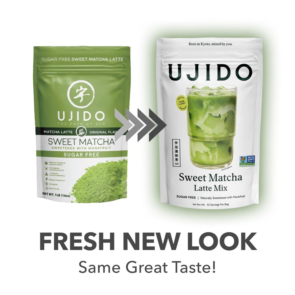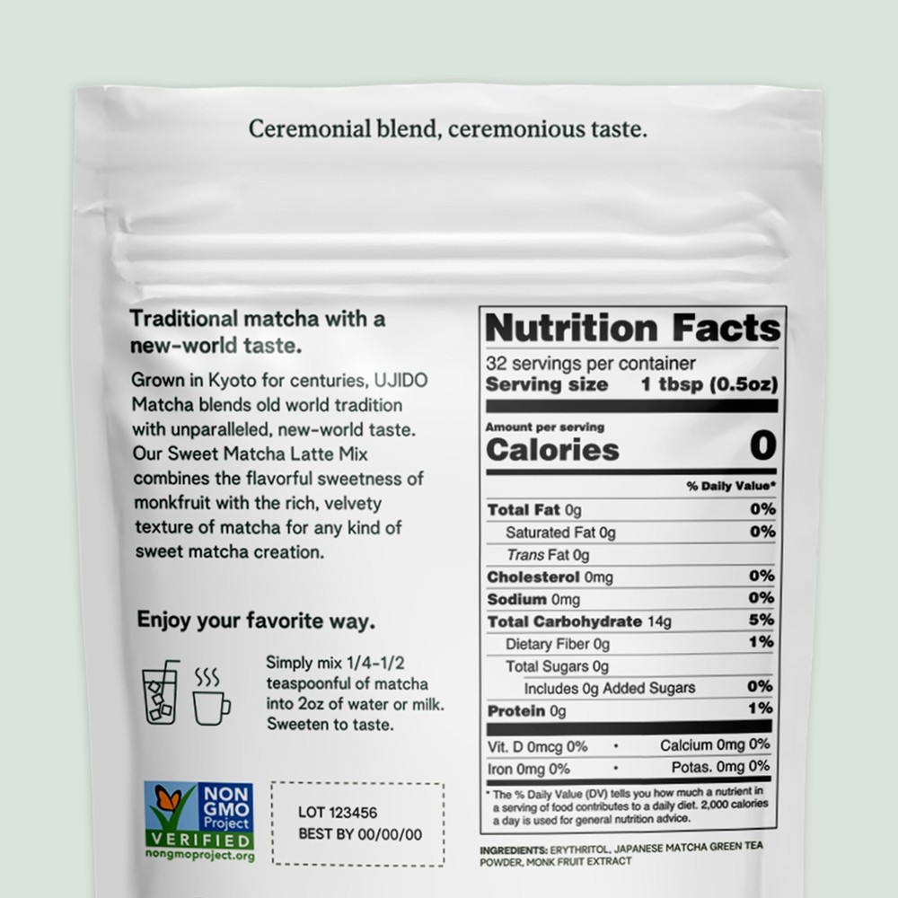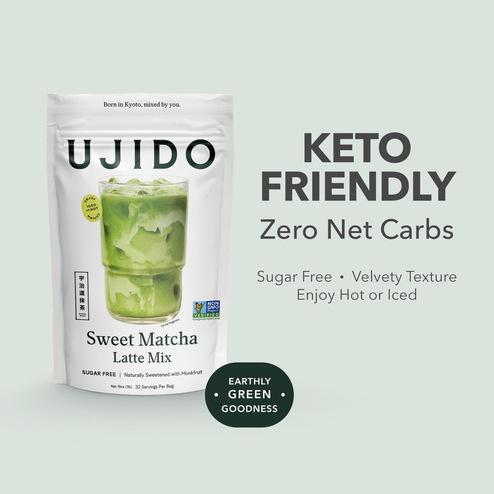 Ujido Sweet Matcha, 16 oz. – Sugar-Free Ceremonial Grade Japanese Matcha Powder – Sweetened with Monk Fruit & Non-GMO Erythritol – For Teas & Lattes – Zero Net Carbs, Gluten Free, & Keto Friendly Product Details Brand: Ujido The Path of Zen Item Form: Loose Leaves Flavor: Matcha Tea Variety: Matcha Unit Count: 16.0 Ounce Product Dimensions : 6.15 x 2.75 x 10.1 inches; 1.05 Pounds UPC : Manufacturer : Itohkyuemon North America Inc. Units : 16.0 Ounce Best Sellers Rank: #46,120 in Grocery & Gourmet Food (See Top 100 in Grocery & Gourmet Food) #258 in Matcha Tea #258 in Matcha Tea Customer Reviews: 4.4 4.4 out of 5 stars 350 ratings VIBRANT & TENDER. Ujidos Sweet Matcha is the ideal blend of 1st harvest ceremonial and 2nd harvest high culinary Matcha, so you get the flavor of ceremonial grade at the price of a quality culinary grade. This Matcha is shade grown and handpicked in early spring for vibrant and tender tea leaves before it is stone-ground. ANTIOXIDANT SUPERFOOD. This green tea powder has the natural superfood nutrition of L-Theanine, catechins, EGCG, and chlorophyll. Gluten free and keto friendly, this Matcha latte blend is sweetened with monk fruit and non-GMO erythritol for a naturally sweet, zero-calorie drink that has the rich Matcha tea flavor without the calories. DELICIOUS & SMOOTH. Sweet Matcha has a smooth, mellow, soothing flavor only found in superior quality Matcha. Mix with hot milk or milk substitutes for a sweet Matcha latte. It can also be mixed with water for a delicious Matcha tea, with ice water for a sweet iced tea, or in Matcha smoothies and low-sugar treats. JAPANESE HERITAGE. Ujido Matcha is grown in Uji, Japan, the birthplace of Matcha where Matcha has been produced for over 800 years. This is the same highly sought-after tea used in traditional Japanese tea ceremonies. SUPERIOR QUALITY. Ujido is a Japanese company providing real Matcha, not sencha or regular green tea from China like many others on the market. Our Matcha is grown in the foothills of Uji, where Matcha was born and is free from metals and radiation. We never use lower grades of Matcha from lesser regions. We live and breathe the Matcha lifestyle, from farm to latte.