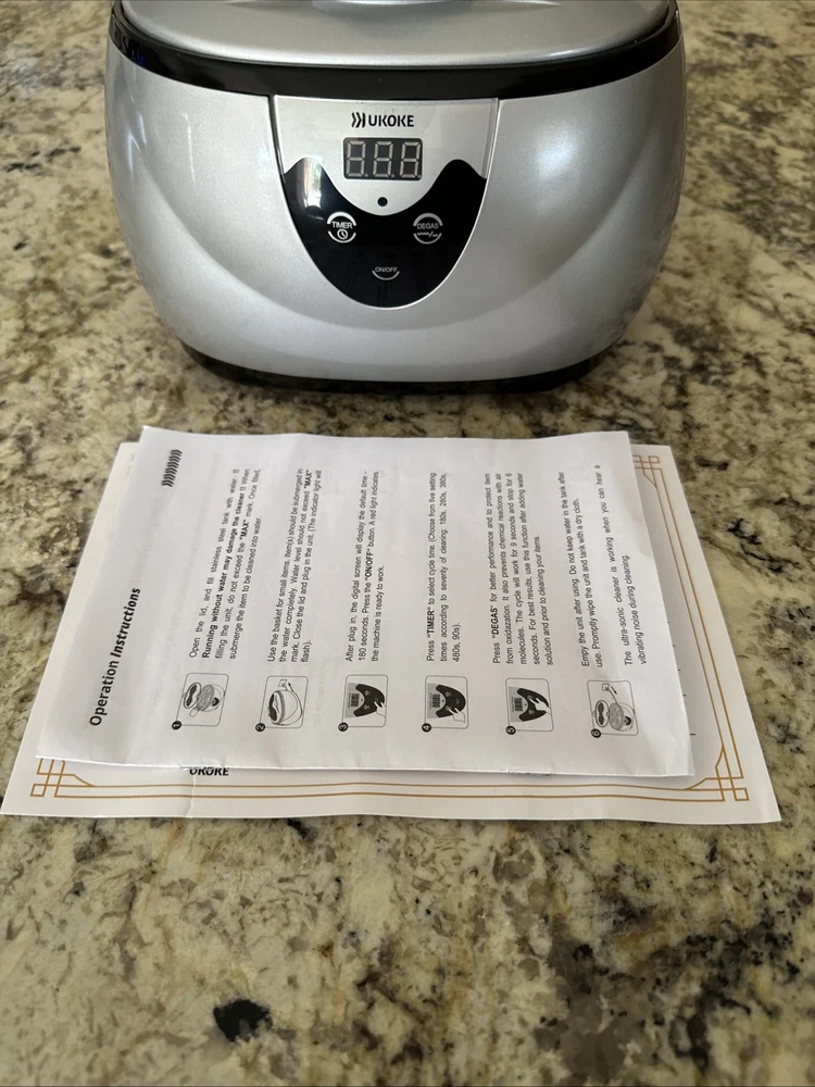 UKOKE 3800S Professional Ultrasonic Jewelry Cleaner Machine, 0.6L Portable Household Timer Device for Eyeglasses, Dentures, Watches, Rings | Silver, Fast Deep Cleaning for Small Accessories Product Details Color: Silver Design: Ultrasonic Cleaner Brand: Ukoke MPN: 3800S UPC: 856121007080 EAN: 0856121007080 Color: Silver Brand: Ukoke Material: Stainless Steel, Plastic Product Dimensions: 6.73"D x 9.51"W x 4.72"H Item Weight: 2 Pounds MULTI-PURPOSE ULTRASONIC CLEANER Perfect for cleaning jewelry, eyeglasses, dentures, watches, coins, lab instruments, and more. Ideal for optical shops, jewelry stores, repair centers, dental clinics, laboratories, and home use. Cleans in minutes using only tap water! POWERFUL & SAFE CLEANING Generates 42,000 Hz of ultrasonic sound waves for a deep yet gentle clean, removing dirt and grime without damaging valuables. Refreshes items to look brand new!POWERFUL & SAFE CLEANING Generates 42,000 Hz of ultrasonic sound waves for a deep yet gentle clean, removing dirt and grime without damaging valuables. Refreshes items to look brand new! ADVANCED DEGASSING FUNCTION The exclusive Degas Mode removes trapped air bubbles from water, improving ultrasonic cleaning efficiency while preventing oxidation and chemical reactions that traditional cleaners cant avoid. TEASY TO USE WITH TOUCH CONTROLS Features a modern digital touch control panel for precise cleaning. Choose from 5 preset cycles (90, 180, 280, 380, & 480 seconds) based on your cleaning needs. Stable & durable compared to traditional push buttons. LARGE 600ML (20 OZ) CAPACITY The stainless steel tank (5.4 L x 3.6 W x 2.1 H) accommodates a variety of items, ensuring a professional-grade clean at home. RECOMMENDED CLEANING TIP Add a few drops of liquid dish soap for even better results! Safe for metals, glass, ceramics, and more. Not suitable for pearls, coral, emeralds, jade, or microfiber items. 1-YEAR REPLACEMENT WARRANTY Buy with confidence! Backed by a 1-year free replacement policy for any quality issues. 24/7 CUSTOMER SUPPORT Have questions? Our dedicated customer service team is ready to assist within 24 hours!