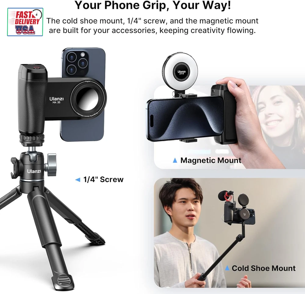 Store New Arrivals Add to Favorite View Feedback Contact Ulanzi MA35 Smartphone Camera Shutter Grip Compatibile with Magsafe for Iphone W Wireless Remote Control Phone Clamp Holder Selfie for 1/4" Tripod Mount Cold Shoe Extension Video Shooting Acccessories Description ¿Qué hay en la caja? Agarre para cámara de teléfono Color Negro - Peso del artículo 130 Gramos Otras características de pantalla Inalámbrico Fabricante CGMULANZI Dispositivos compatibles Teléfono móvil Dimensiones del paquete 6,06 x 4,92 x 2,05 pulgadas País de origen China Número de modelo del producto CGMULANZI Model CGMULANZI Balance & Stability: Bridge the gap in photography performance. MA35 Camera Grip turns your phone into a pro-level camera that's always with you. Compatibe with almost all the smartphones in the market. Prefect for iPhone 16/15/14/13/12 Pro/15 Pro Max/Pro Max/X/XS/XR/ XS Max/8 plus, for Google pixel 8 pro, Samsung Galaxy S22/S21/S10/10+ /S9/S9+/S8/S8+/S7/S6/S6 edge, etc Magnetic or Phone Clamp Connection: The MA35 Grip magnetic accessories feature a secure magnetic connection that easily links together, allowing you to customize your workflow on-the-go. This seamless connection enhances your experience and provides a versatile platform for MagSafe compatible devices. Phone clamp fits devices that are 1.96 to 3.74" in width Vertical and Horizontal Mode: The phone grip offers ease of use, enabling quick adjustments between vertical and horizontal shooting Comfort Grip: Ergonomic non-slip grip fits around your hand and stabilizes your phone while shooting No More False Triggering: Smart design leaves enough space between your phone and the grip, ensuring worry-free shooting experience. Also comes with a detachable remote control, 15 m / 49.2 ft wireless remote control, compatible with iOS and Android systems, and can be easily connected to your smartphone without downloading an app Multiple Extension --- Your Phone Grip, Your Way: The cold shoe mount, 1/4" screw, and the magnetic mount are built for your accessories, keeping creativity flowing. Allows to add external microphone / fill light and turns into a professionla video shooting rig Product Description ABOUT US We offer the best prices around on high quality products. Our E-store includes media such as books, movies, music and games while offering electronics, toys, sporting apparel, clothing, tools, general home, garden items and more. SHIPPING We are always working hard to ensure your package arrives as soon as possible. Please understand that some factors like weather, high postal traffic, and the performance of shipping companies are outside of our control. We offer free shipping to the lower 48 states and ship within 2 business days of payment, usually sooner. We do not accept P.O. Boxes. Please provide a physical address. For shipping outside of the continental USA, we only use eBay's Global Shipping Program.The item is shipped to KY and then sent to the rest of the world. International customers are responsible for all duties and taxes. Continue to check out in order to calculate costs for shipping the item to your country. Messages regarding eBay's Global Shipping Program MUST be directed at eBay EXCLUSIVELY. RETURNS We offer a 30-Day Return Policy on items which you are not completely satisfied with. You have the option for a full-refund or an exchange of the item. No returns are available on items shipped outside of the USA. PAYMENT We accept PayPal. CONTACT US This page content is yet to come Please ad us to your favorite seller and visit again later Thank You CUSTOMER SATISFACTION We try our very best to make sure every customer is completely satisfied. If there's a problem, message us! We're happy to help. WE ACCEPT Copyright © 2021 AutoDS. | All Rights Reserved