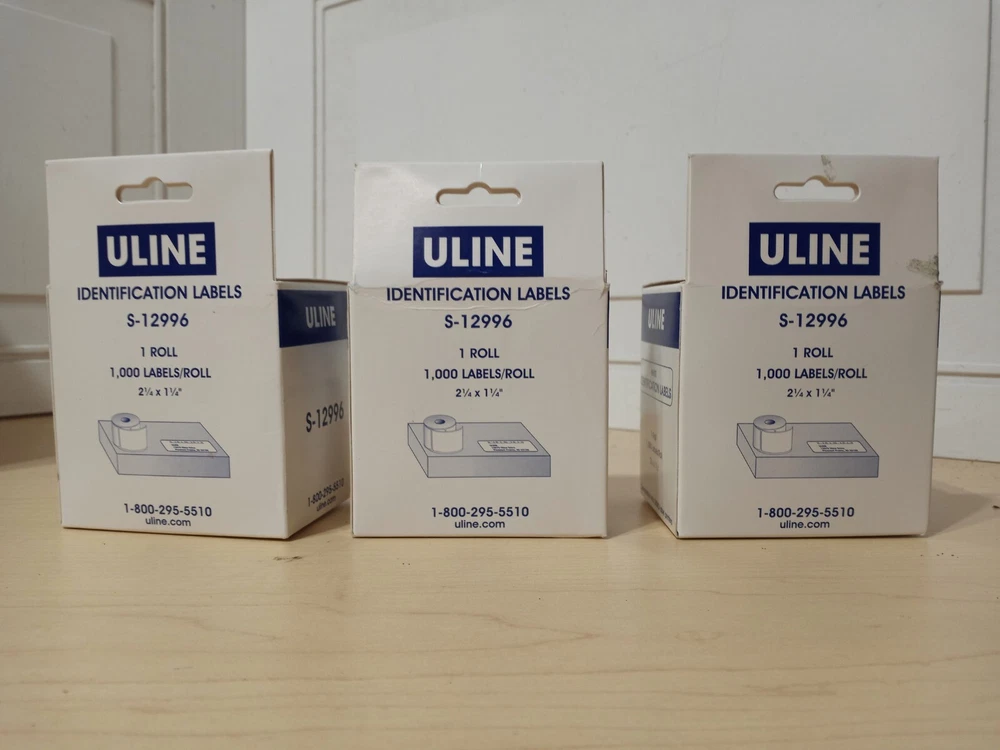 Three boxes of ULine brand, Identification Labels, model S-12996. Each box / roll has 1,000 labels.