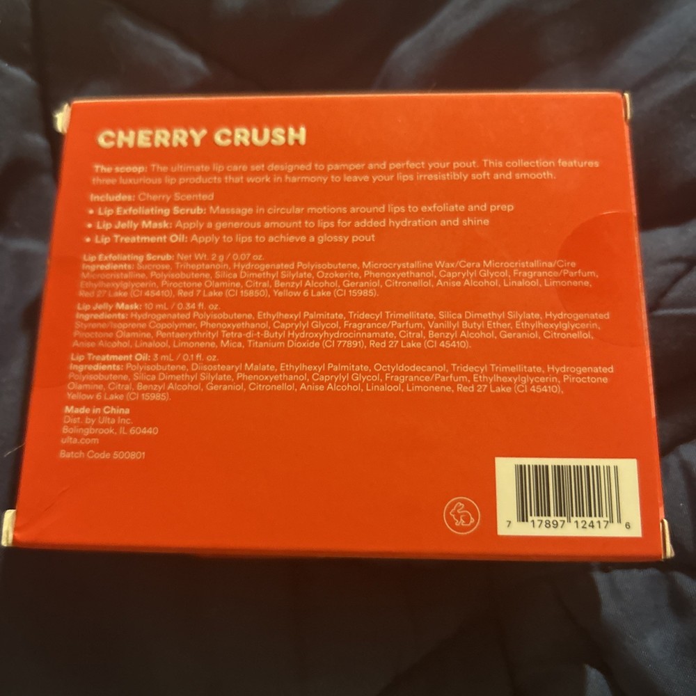This treatment set works in harmony to leave your lips soft and smooth. The lip exfoliating scrub removes excess skin to reveal soft lips. The lip jelly mask works to condition the lips. And the lip treatment oil leaves that perfect, glossy, pout. It can be used alone or with chapstick for added color. Cruelty free. This kit retails at ULTA for $16.00.