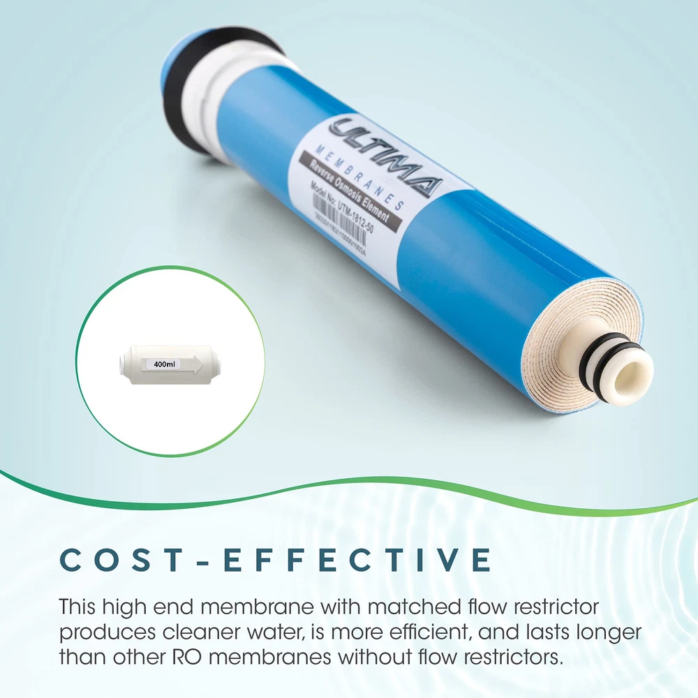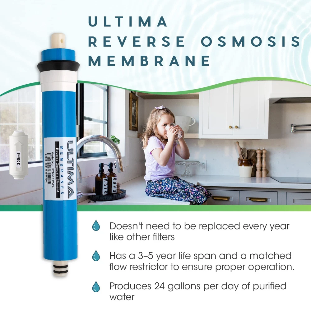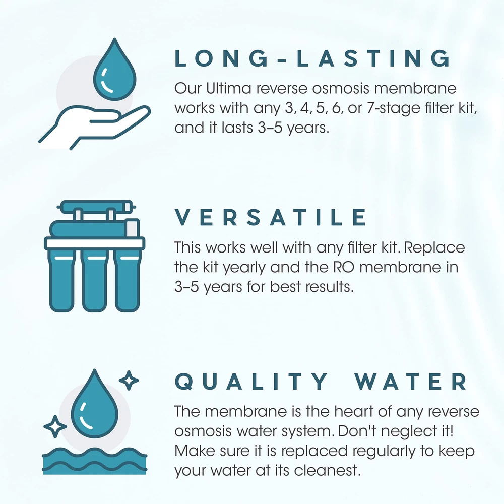 REVERSE OSMOSIS: [FITS MOST STANDARD RO SYSTEMS] This water filtration cartridge delivers clean, filtered water through reverse osmosis. As water passes through the permeable membrane housing, contaminants like rust, dirt, and sediment are removed. Harmful chemicals like chlorine, VOCs, and PFAS(forever chemicals). LONG-LASTING: Our Ultima reverse osmosis membrane filter works with our 5-stage filter kit, and our membrane cartridge lasts between 3 to 5 years. Our 5-stage filter system needs yearly replacement, but the RO membrane will provide 3 to 5 years of reliable filtration and clean water. BENEFITS: A reverse osmosis water filter membrane cartridge provides multiple benefits for your water. It’s reliable and produces great-tasting clean, bottle-quality drinking water. By removing impurities, it also makes drinking water safer for you. UNDERSINK WATER FILTER: This water purification cartridge is designed to be placed underneath a sink. Under-the-sink water filters are ideal for homes because they are compact and can be installed easily. The long life span is also cost effective and budget-friendly. : At , we are dedicated to providing you with a long-lasting and reliable water filter system. Started by a professional plumber, our company understands the importance of safe and clean drinking water.