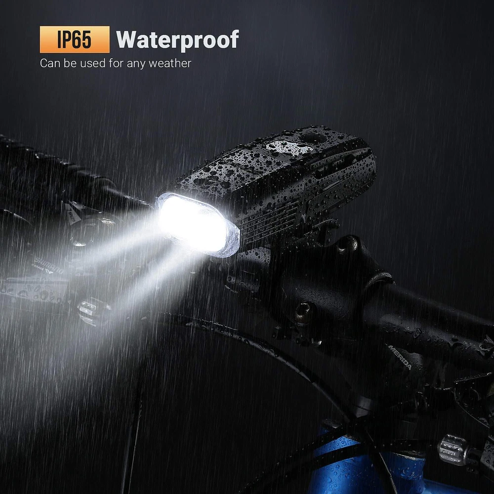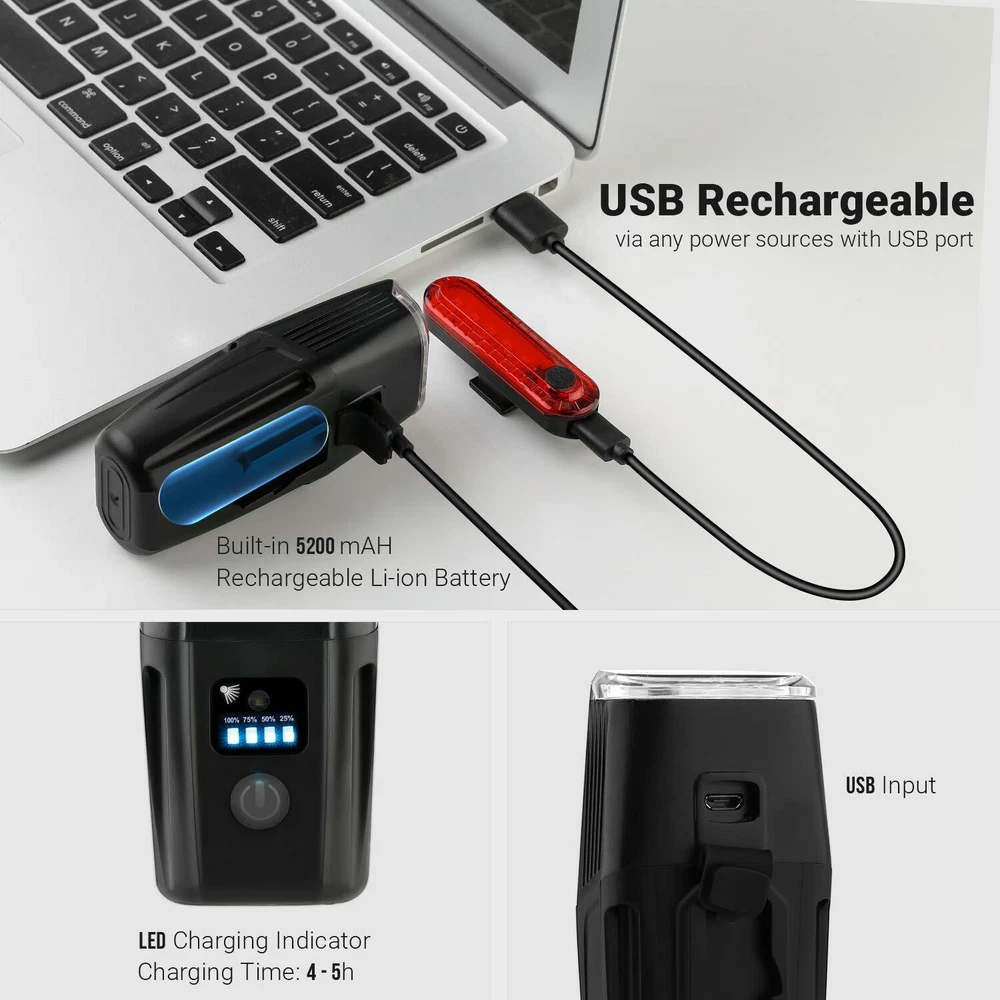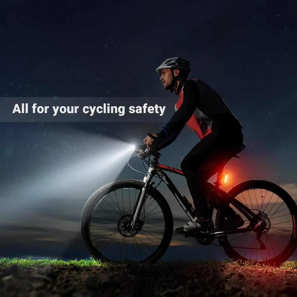 Be Seen, Be Safe: This bike light set comes with a head light and tail light. The front light is super bright with 1000 lumen and irradiation up to 492ft, while the back light assure that you are well visible from the distance. These ultra-bright safety lights will keep you safe and secure when going out for the night rides. No Standalone lithium batteries are sold with the product. Smart Sensor Bike Light: Long press the blue button of the bike headlight to start the smart sensor mode. It will automatically turn on when it enters into a dark environment and turn off when it comes to the bright, which is very helpful to save batteries if you always forget to shut it off. USB Rechargeable: Our bike light set comes with a built-in 5200mah rechargeable battery which allows you to conveniently charge from your computer, laptop, power bank or any devices with a USB port. It can be fully charged within 4 to 5 hours with indicator lights. No more wasting your money on batteries ever again. No Standalone lithium batteries are sold with the product. Built to Last & Waterproof: Made of premium aluminum material which is wear and shock resistant to endure rough handling. Super durable for long service life. Both of the led bike lights are IP65 waterproof so there is no worries even in heavy rainy days. Easy Installation & Wide Application: With a handlebar mount for easily installing the light onto your bike, and can be rotated 360° to fit your different needs. It can be used as an emergency flashlight at home and in your car. Perfect for running, jogging, hiking, camping, walking your dog, cycling, changing a tyre, and other night time activities.